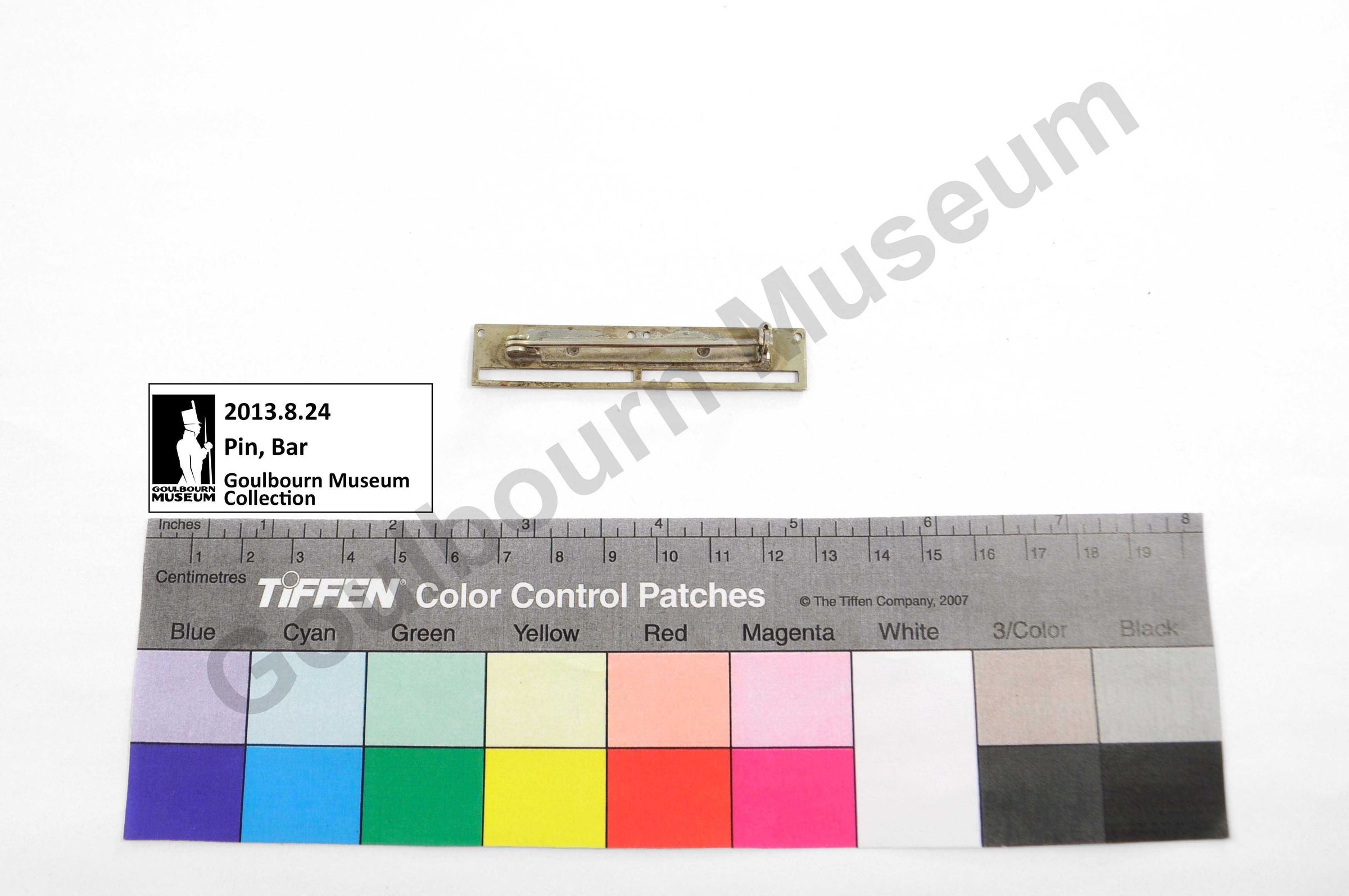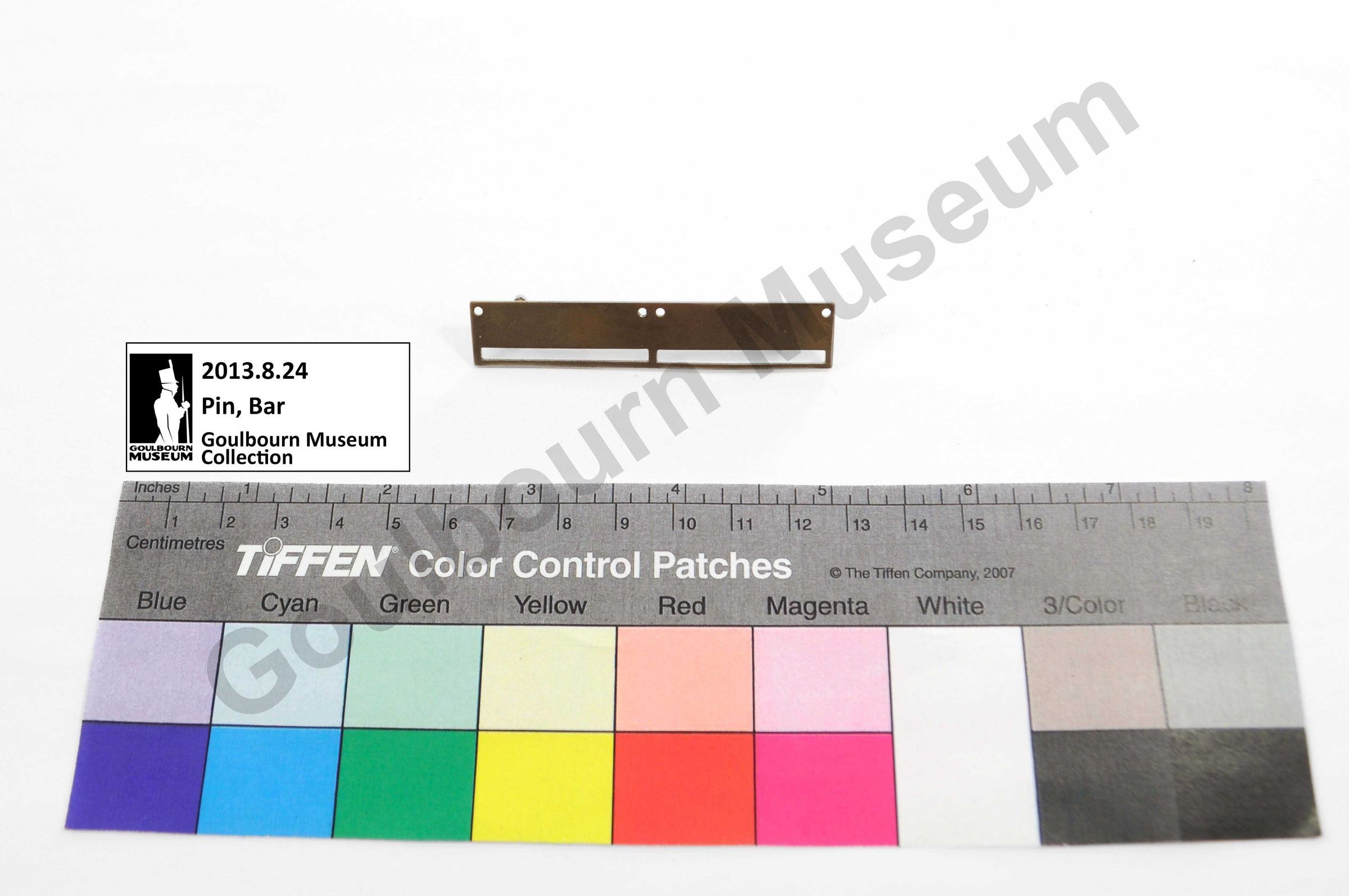 Rectangular medal mounting bar with pin attached to back for attaching to uniform; bar contains two slits, indicating that it is used to hold two medals.
