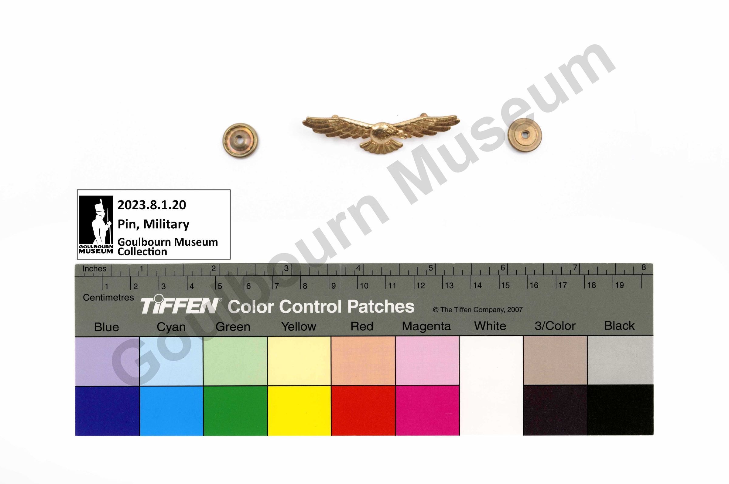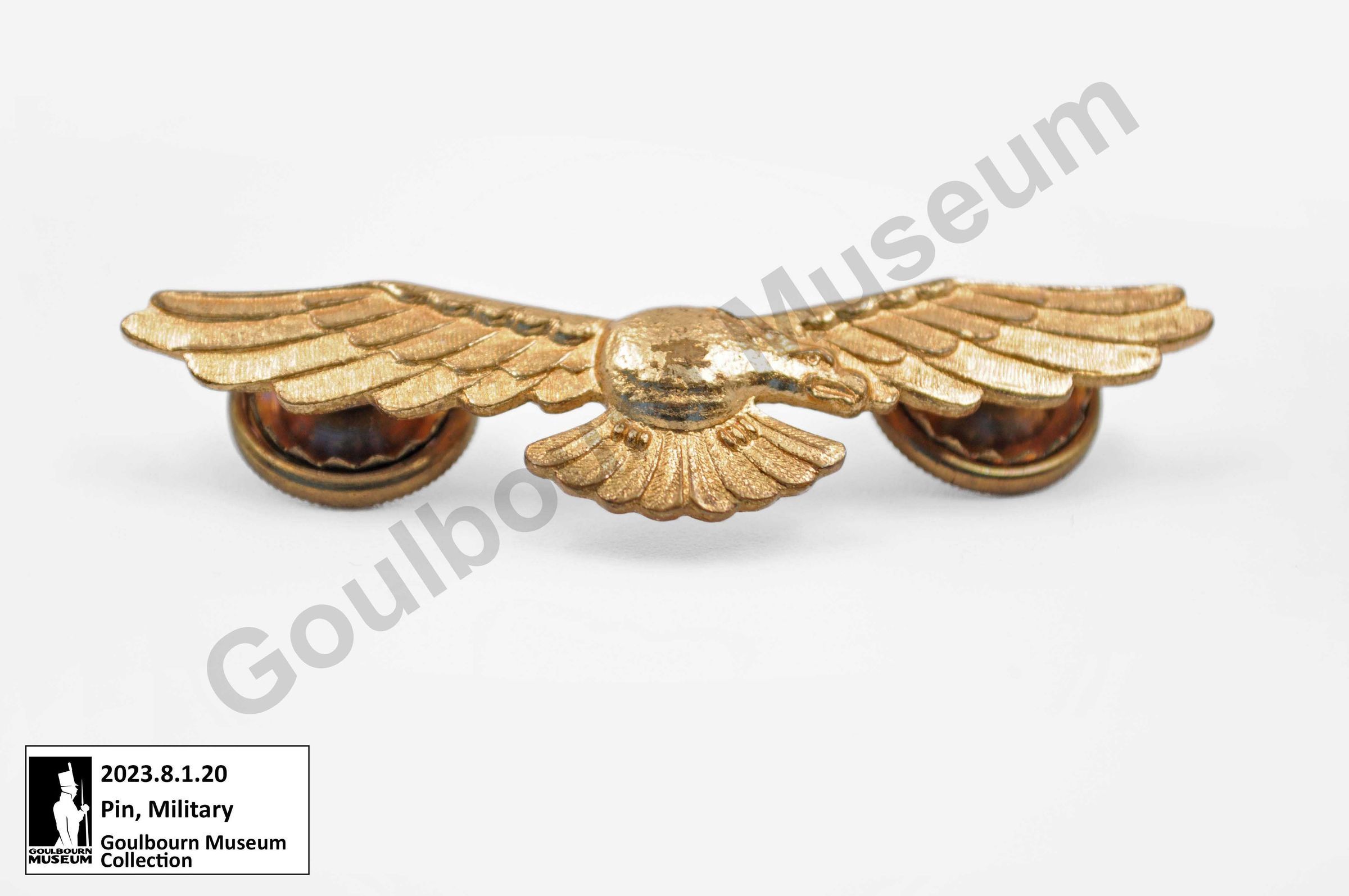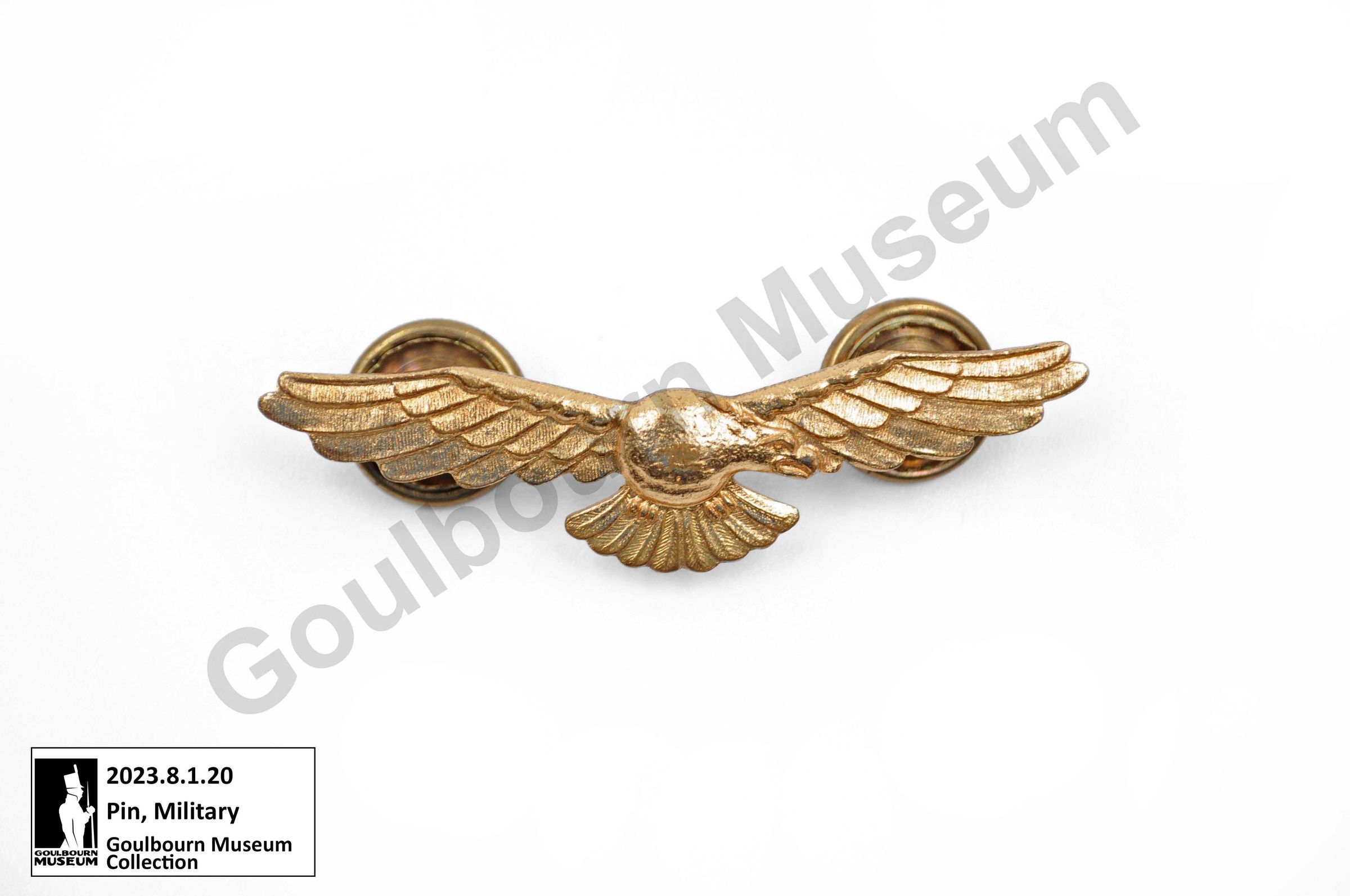 One brass coloured metal eagle pin which was one component of a Royal Canadian Air Force uniform. The pin is shaped like an eagle with outstretched wings. The eagle's head is pointed to the right. The reverse of the pin has two posts and accompanying backings for attaching to the uniform.Context