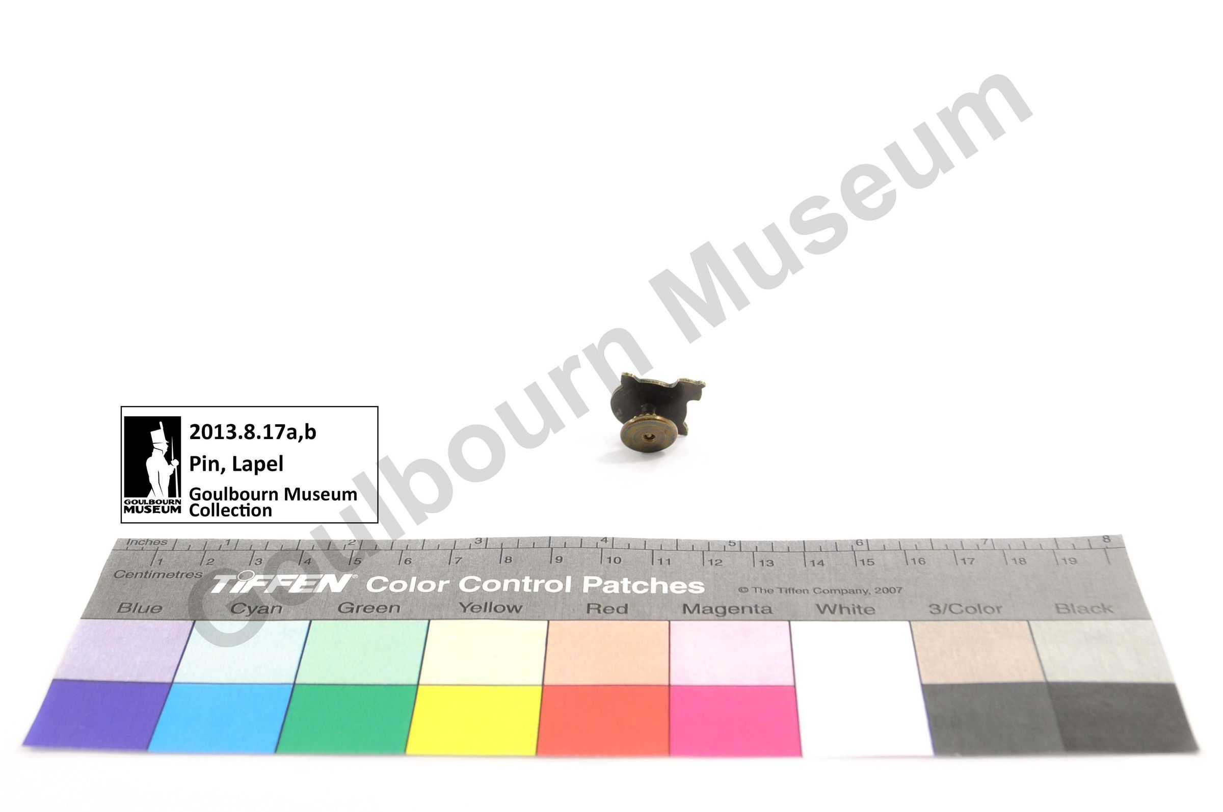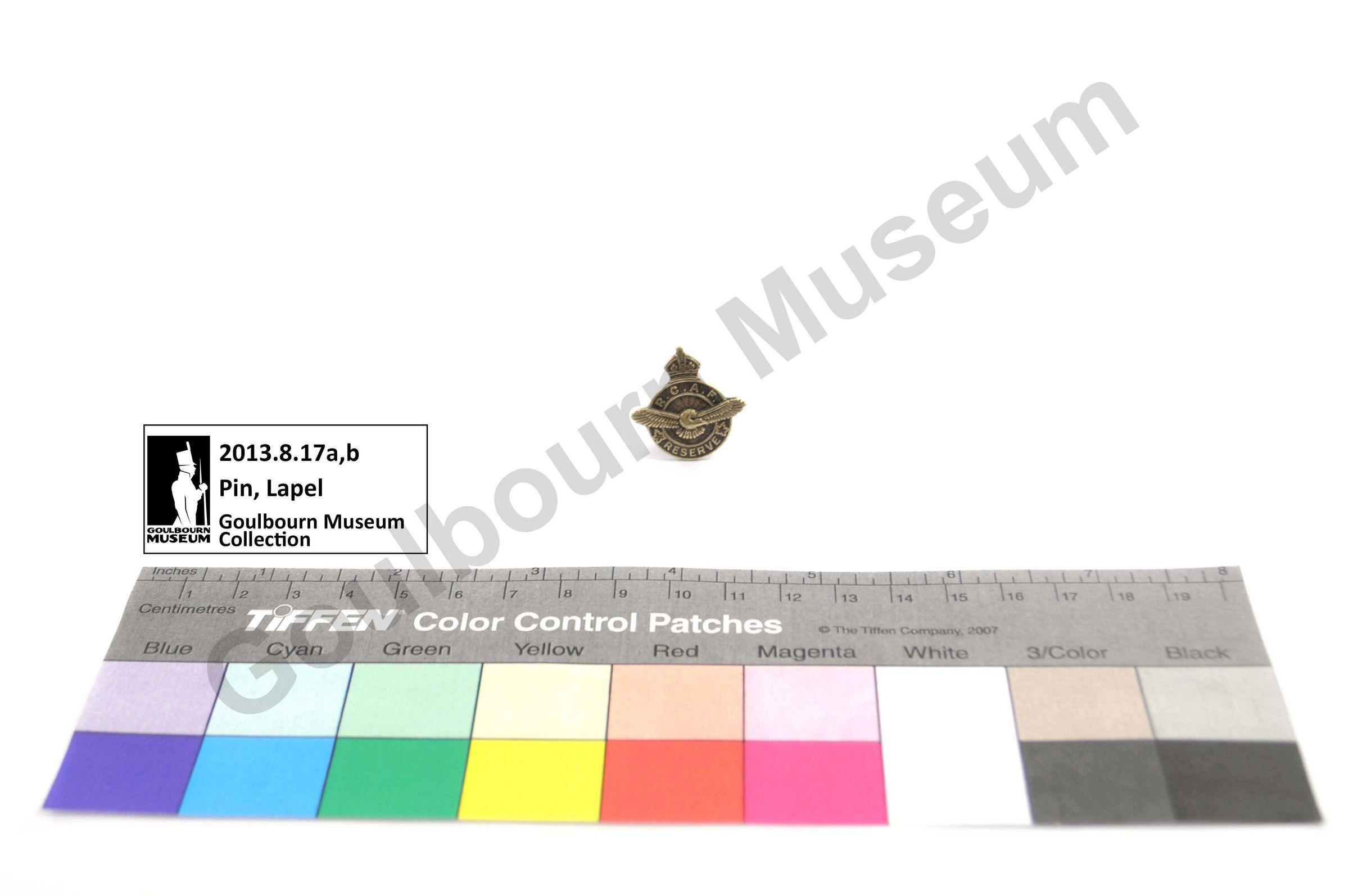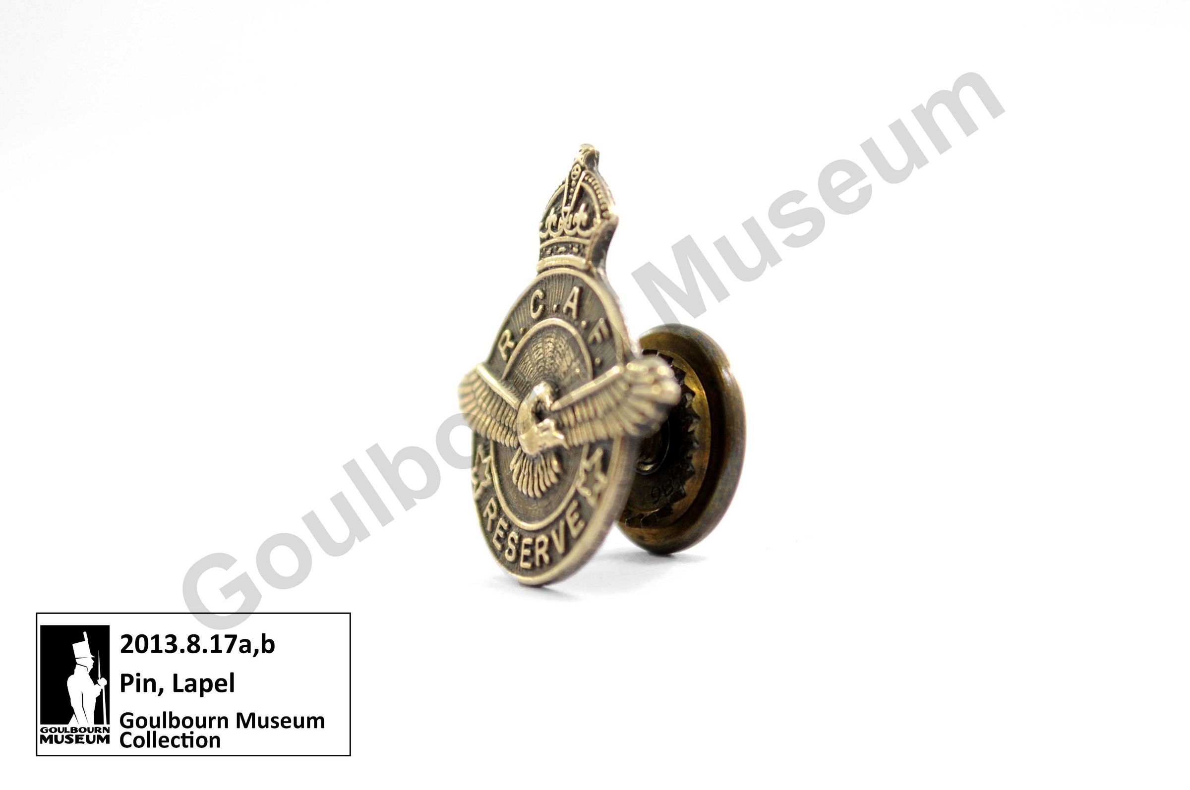 Metal screw-post pin in the shape of the Royal Canadian Air Force emblem; the front of the pin contains the text: "R.C.A.F. RESERVE." Manufactured by Birks, Breadner and Scully. Owned by C.E. Rielly.