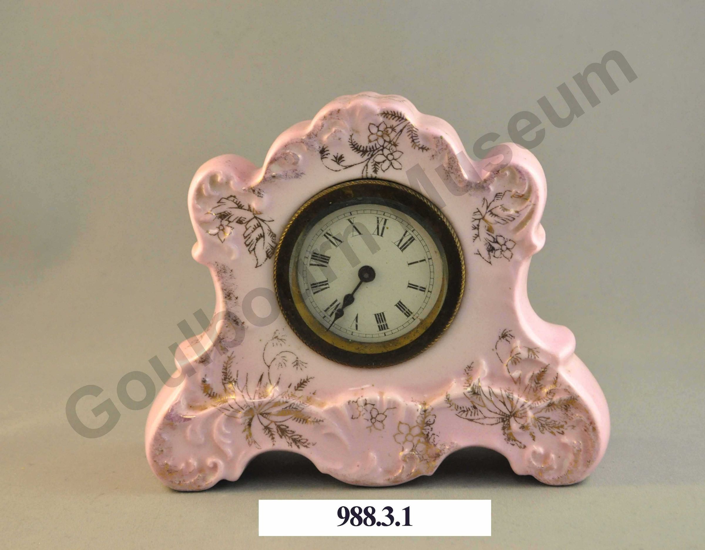 Pale pink ceramic clock with scalloped vine motifs. Painted with sprays of gold flowers on clock face, top, and sides. Reverse is white. Reverse is stamped with red ink and reads Patented 16 July 1895. Clock mechanism broken. Clock face shows Roman numerals. Interior of clock is hollow.Made/Created