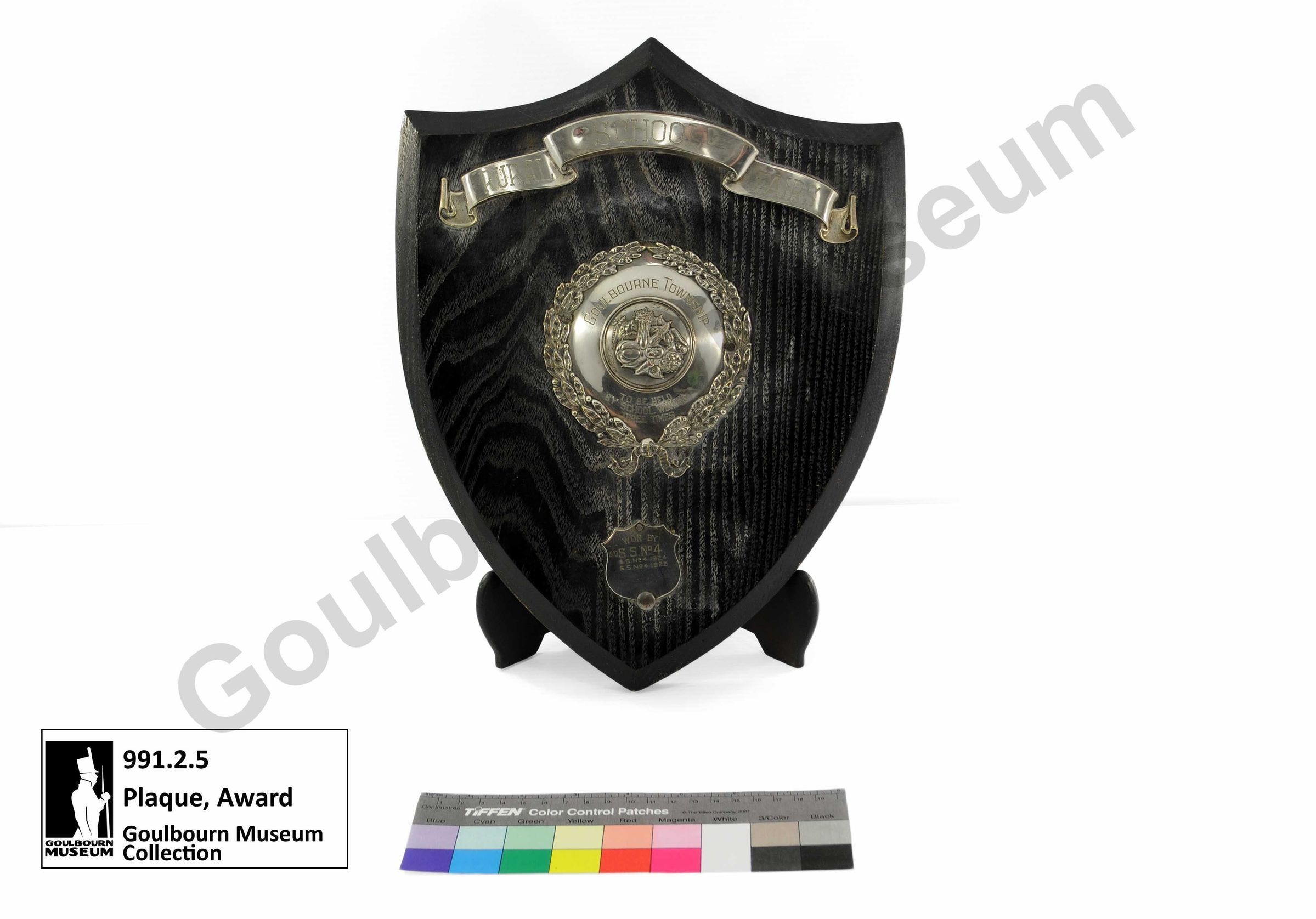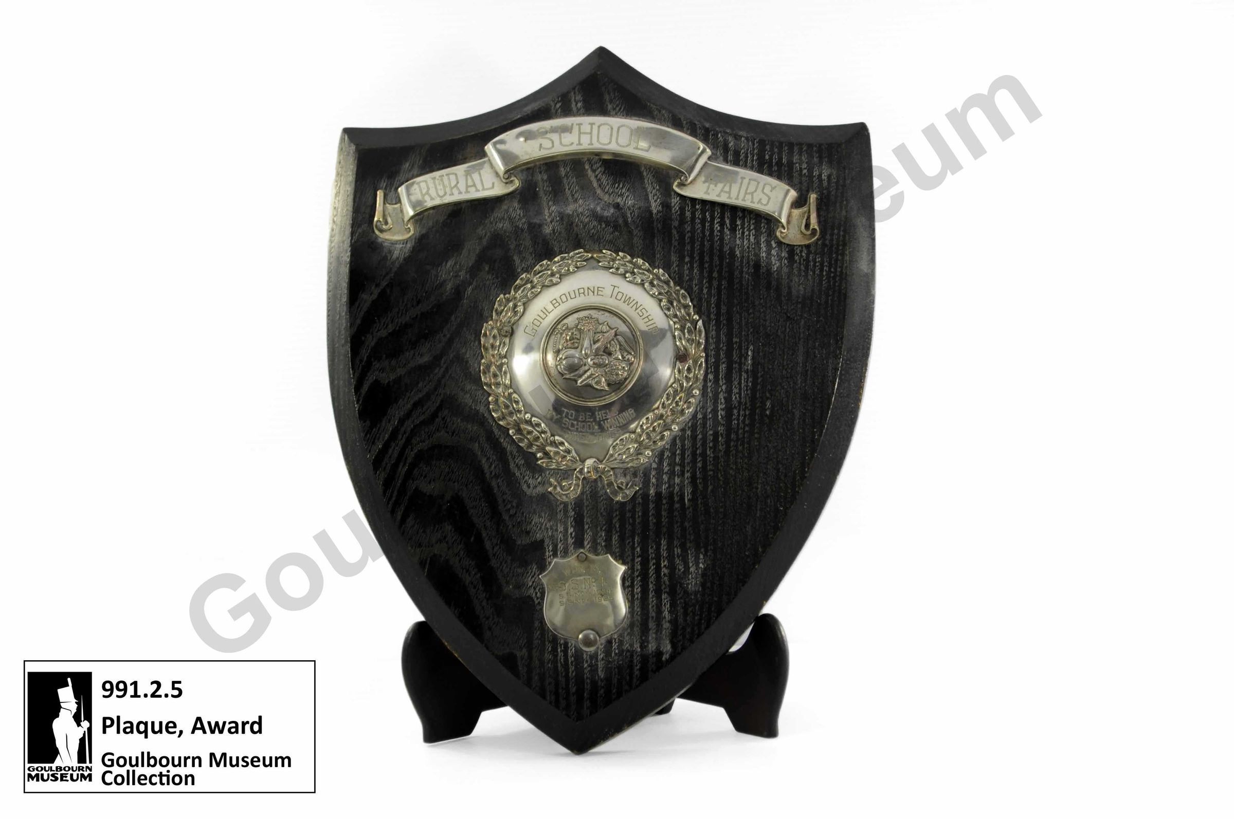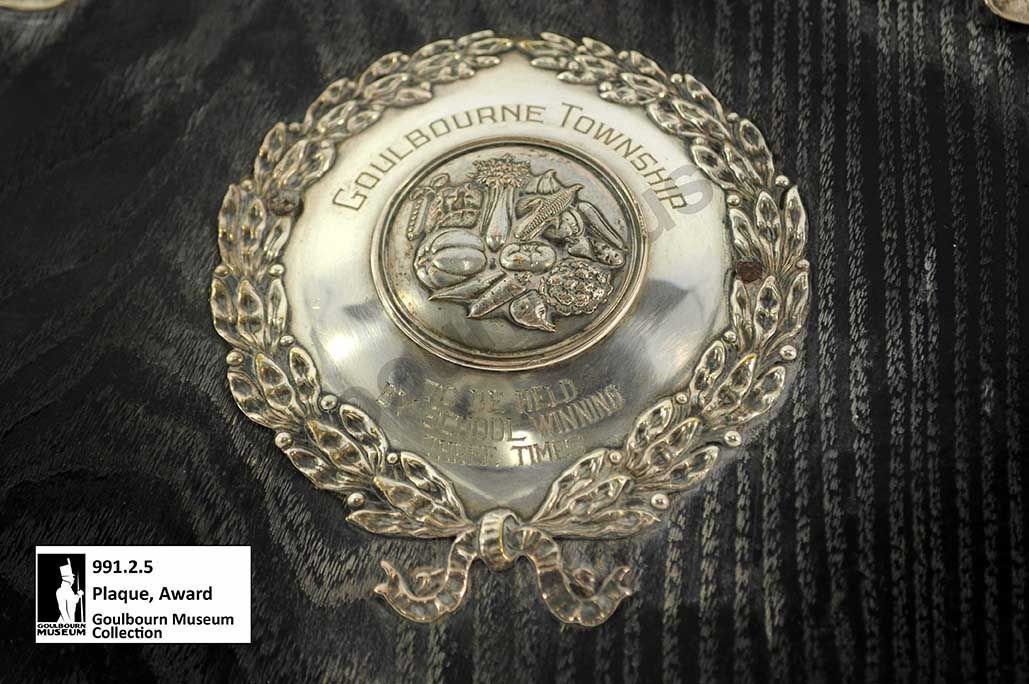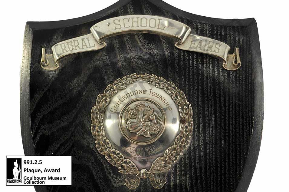 One dark coloured wooden plaque award with silver metal additions. A banner at the top of the plaque says, "RURAL SCHOOL FAIRS." In the centre of the plaque there is a silver addition composed of an outer wreath of leaves, two central lines of text which say, "GOULBOURNE TOWNSHIP" and "TO BE HELD BY SCHOOL WINNING THREE TIMES" and in the centre of the plaque is an image of a collection of assorted vegetables. At the bottom of the plaque, there is one final silver metal addition which says, "WON BY 1923 SS No4 SSNo4 1924 SSNo41925."Context