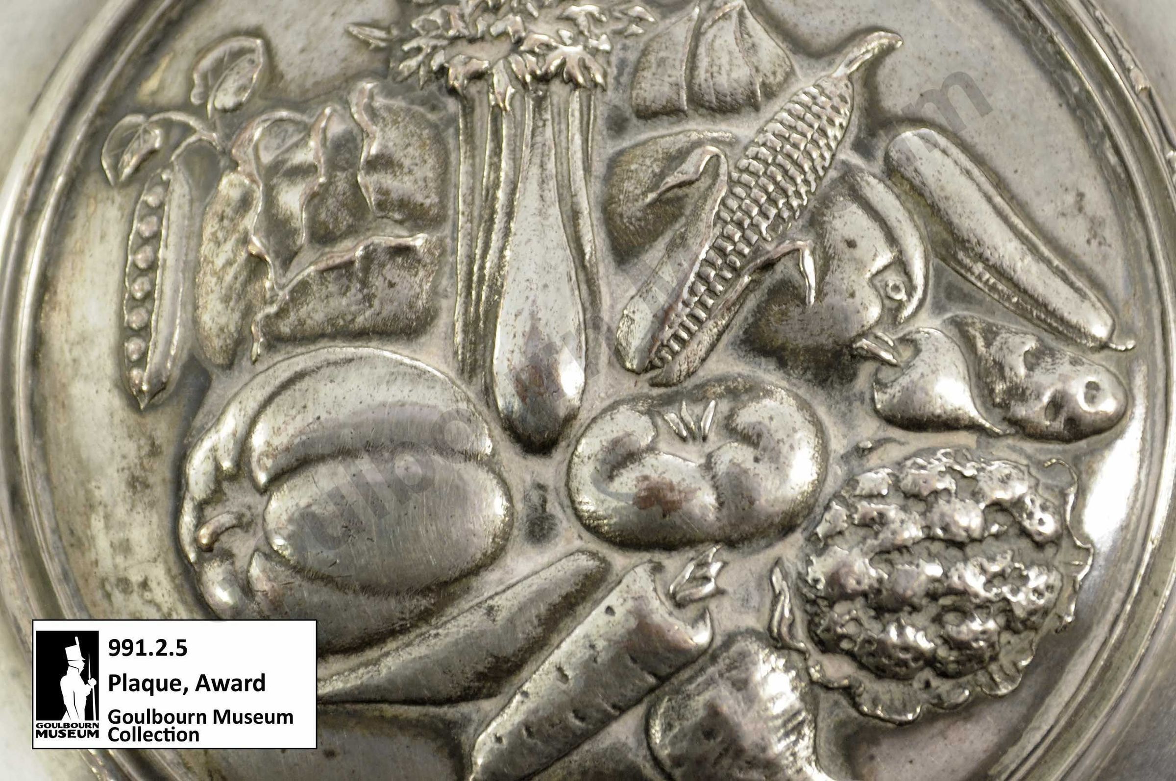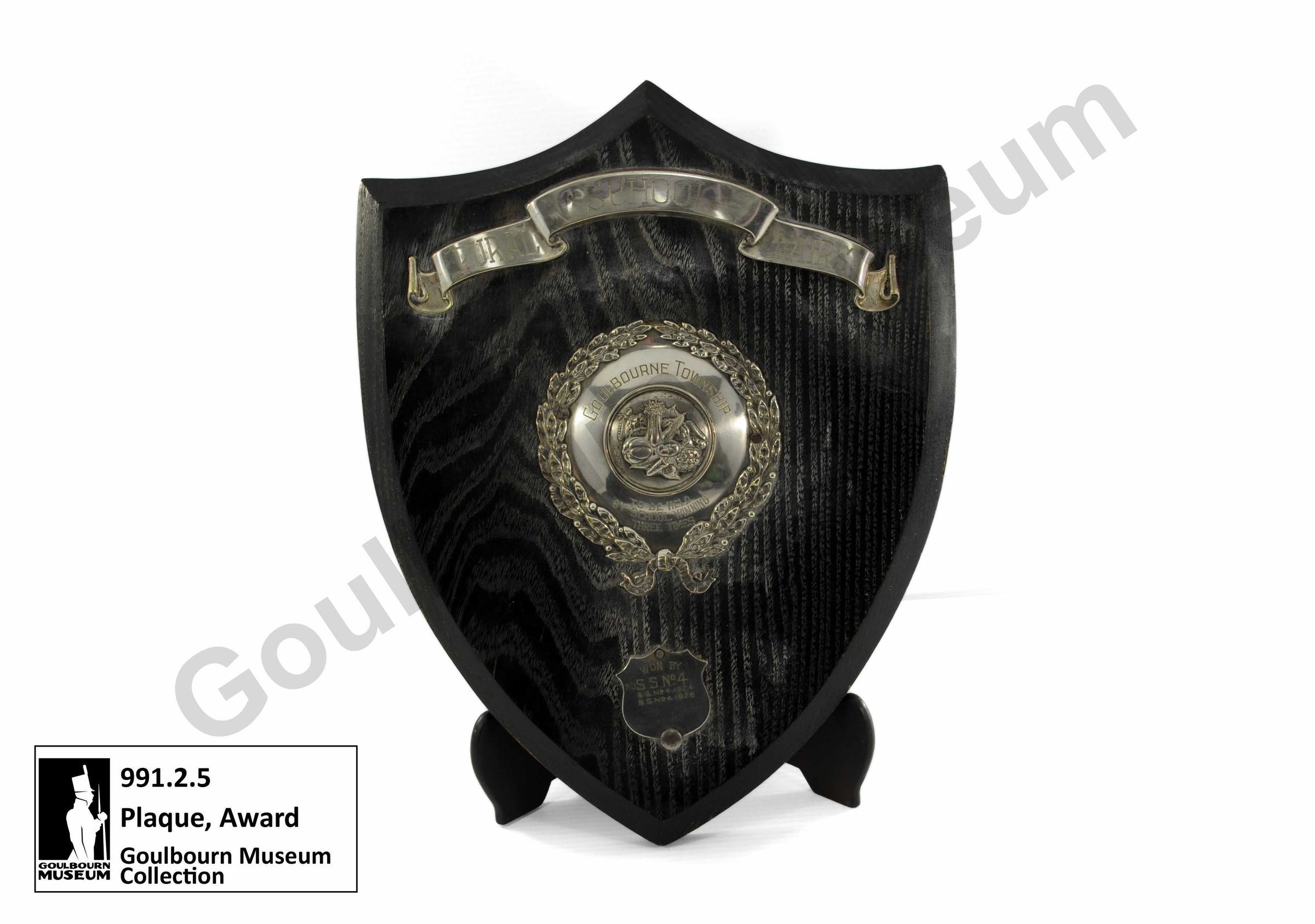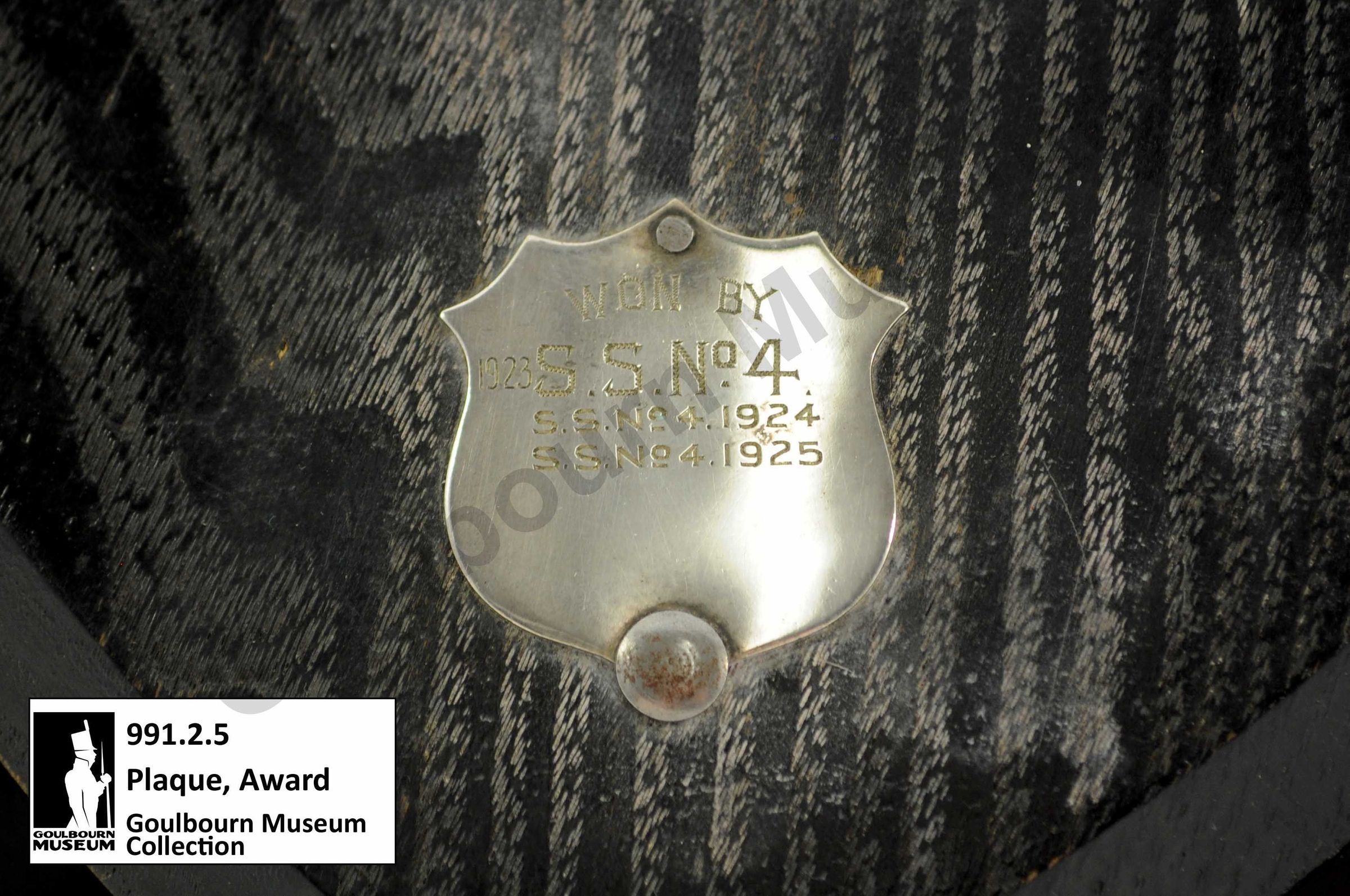 One dark coloured wooden plaque award with silver metal additions. A banner at the top of the plaque says, "RURAL SCHOOL FAIRS." In the centre of the plaque there is a silver addition composed of an outer wreath of leaves, two central lines of text which say, "GOULBOURNE TOWNSHIP" and "TO BE HELD BY SCHOOL WINNING THREE TIMES" and in the centre of the plaque is an image of a collection of assorted vegetables. At the bottom of the plaque, there is one final silver metal addition which says, "WON BY 1923 SS No4 SSNo4 1924 SSNo41925."Context