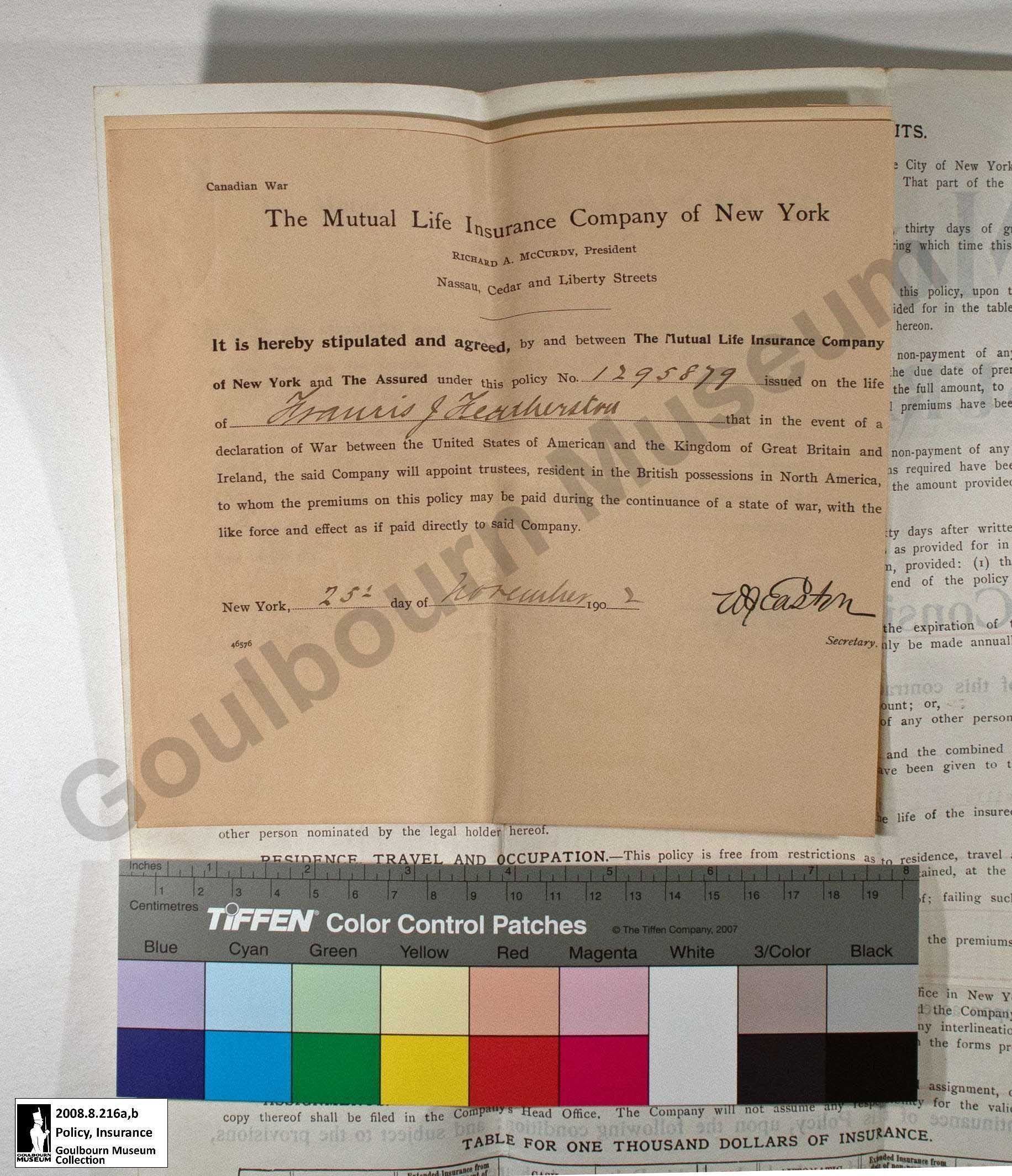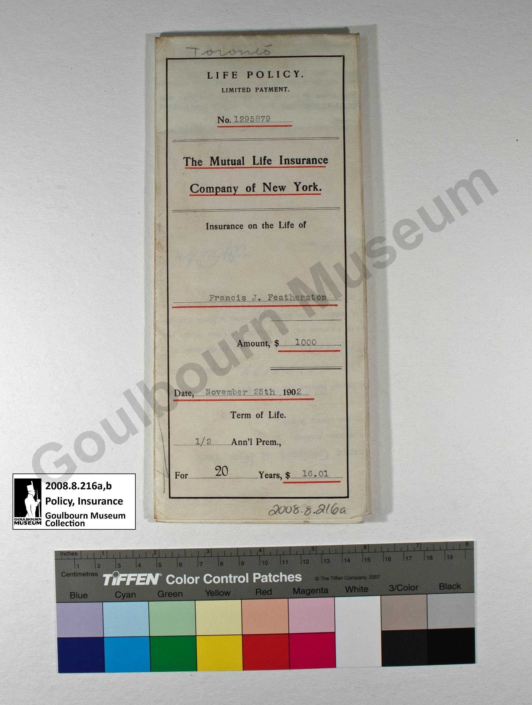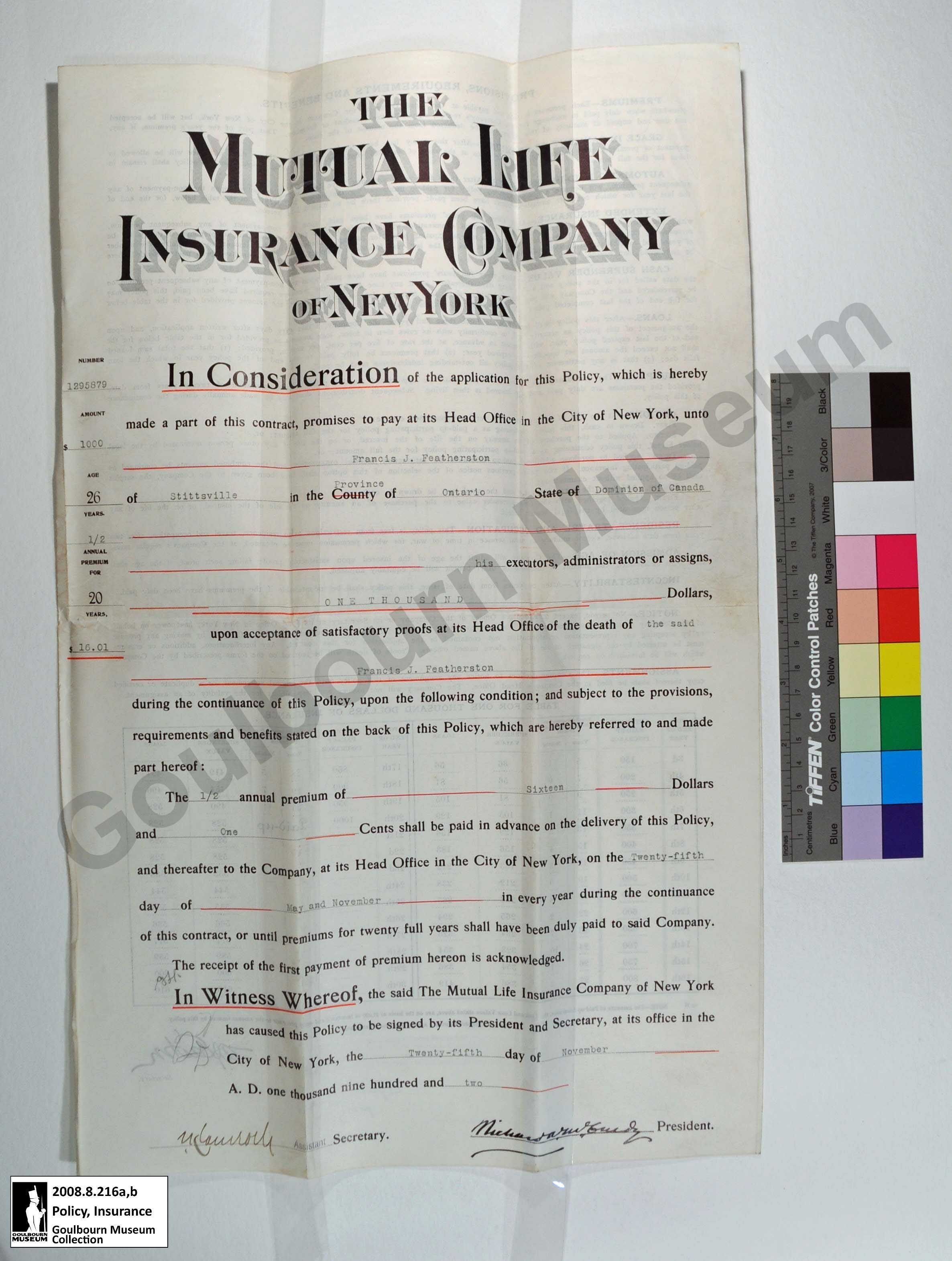 The artefact is an insurance policy from Mutual Life Insurance Company of New York for Francis J. Featherston. The policy cost Featherston $16.01 semi-annually, covering $1000 worth of insurance. It came into effect on November 25th, 1902.Collection