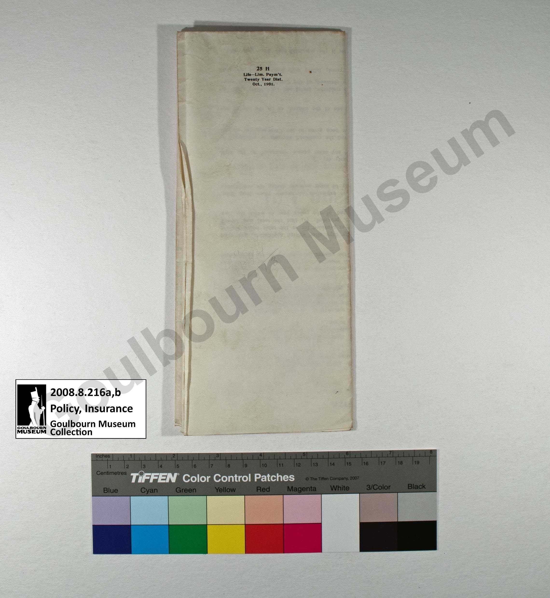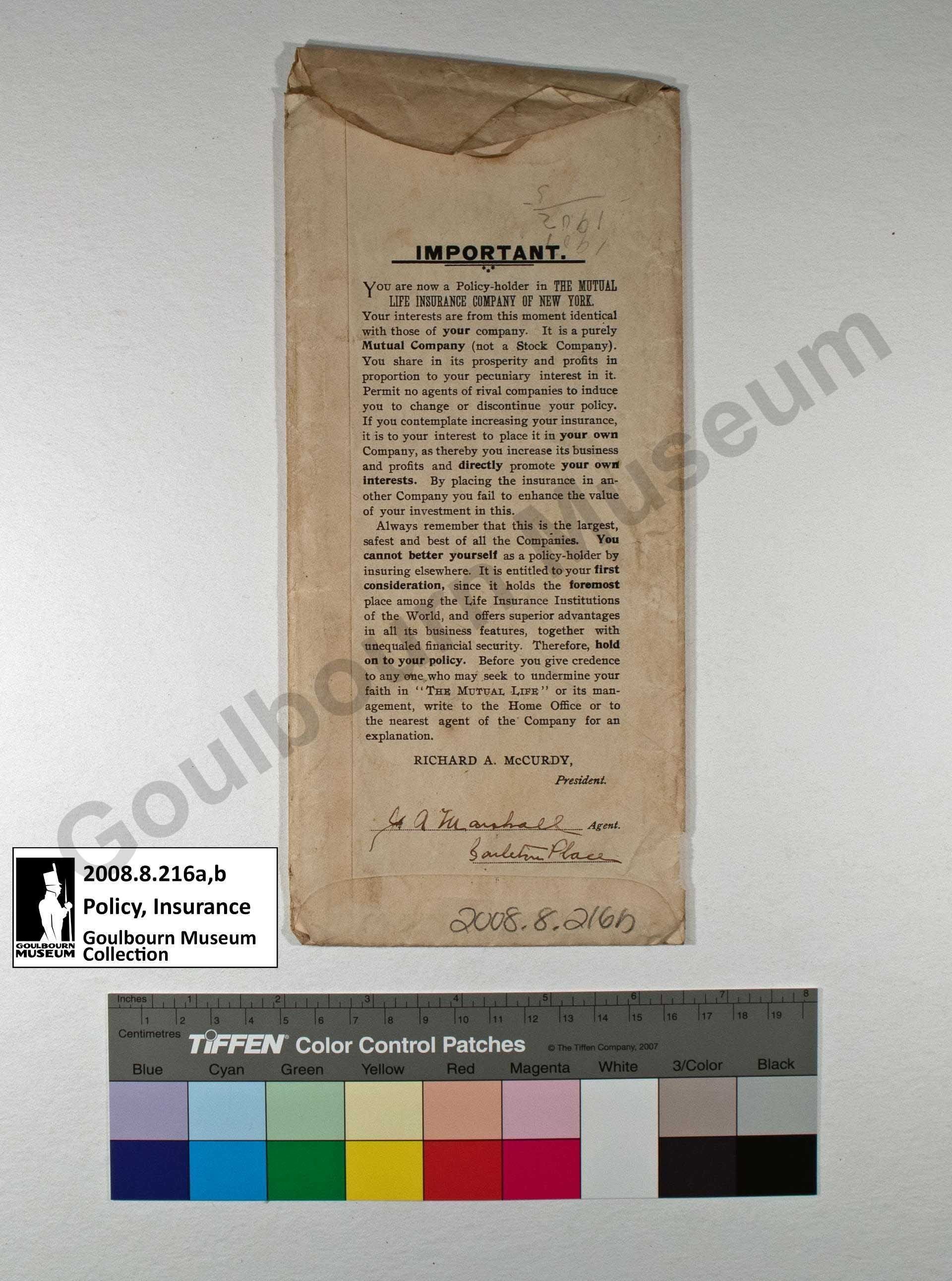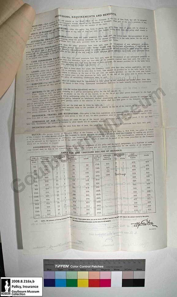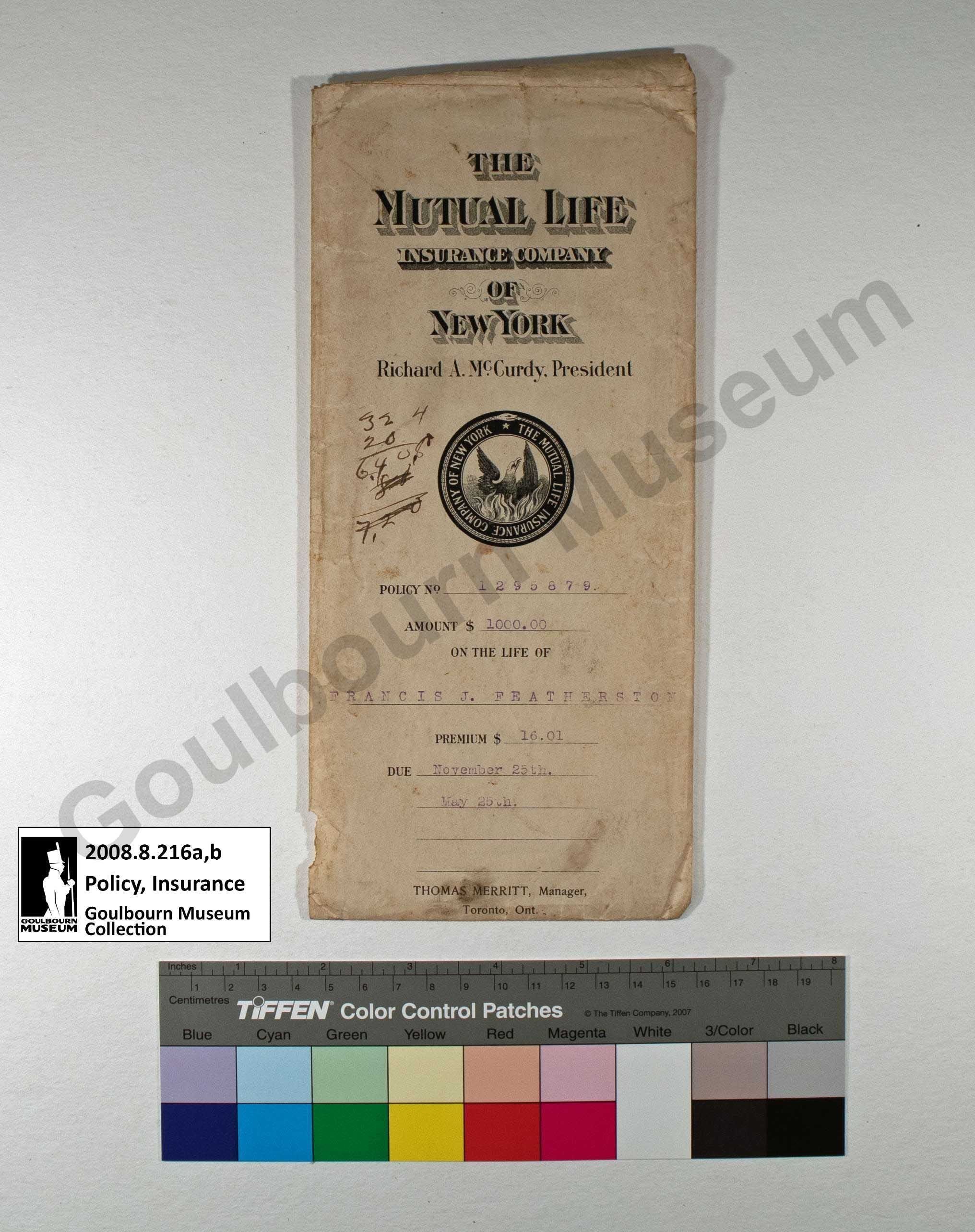 The artefact is an insurance policy from Mutual Life Insurance Company of New York for Francis J. Featherston. The policy cost Featherston $16.01 semi-annually, covering $1000 worth of insurance. It came into effect on November 25th, 1902.Collection