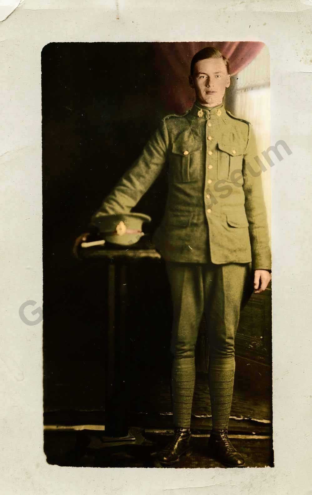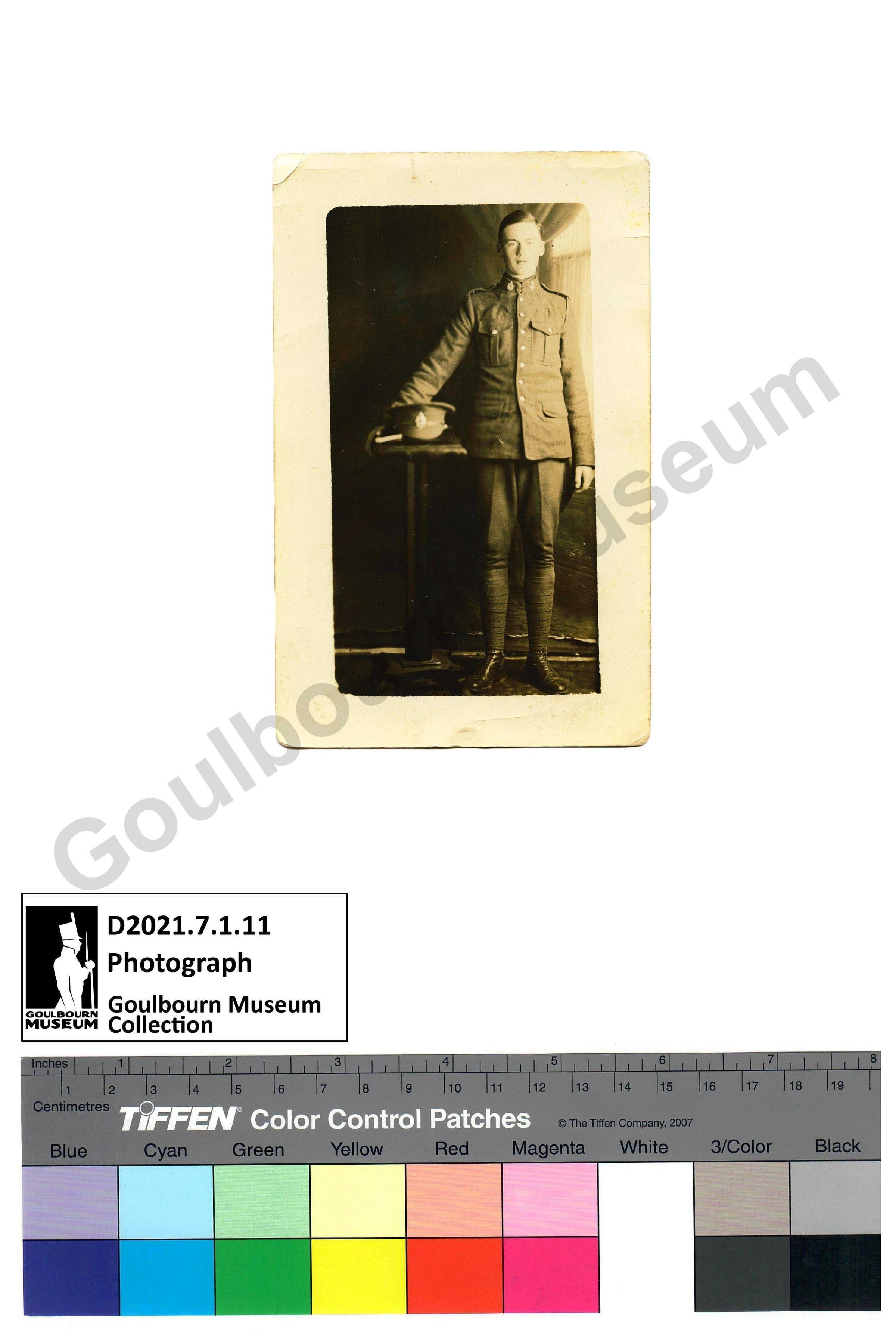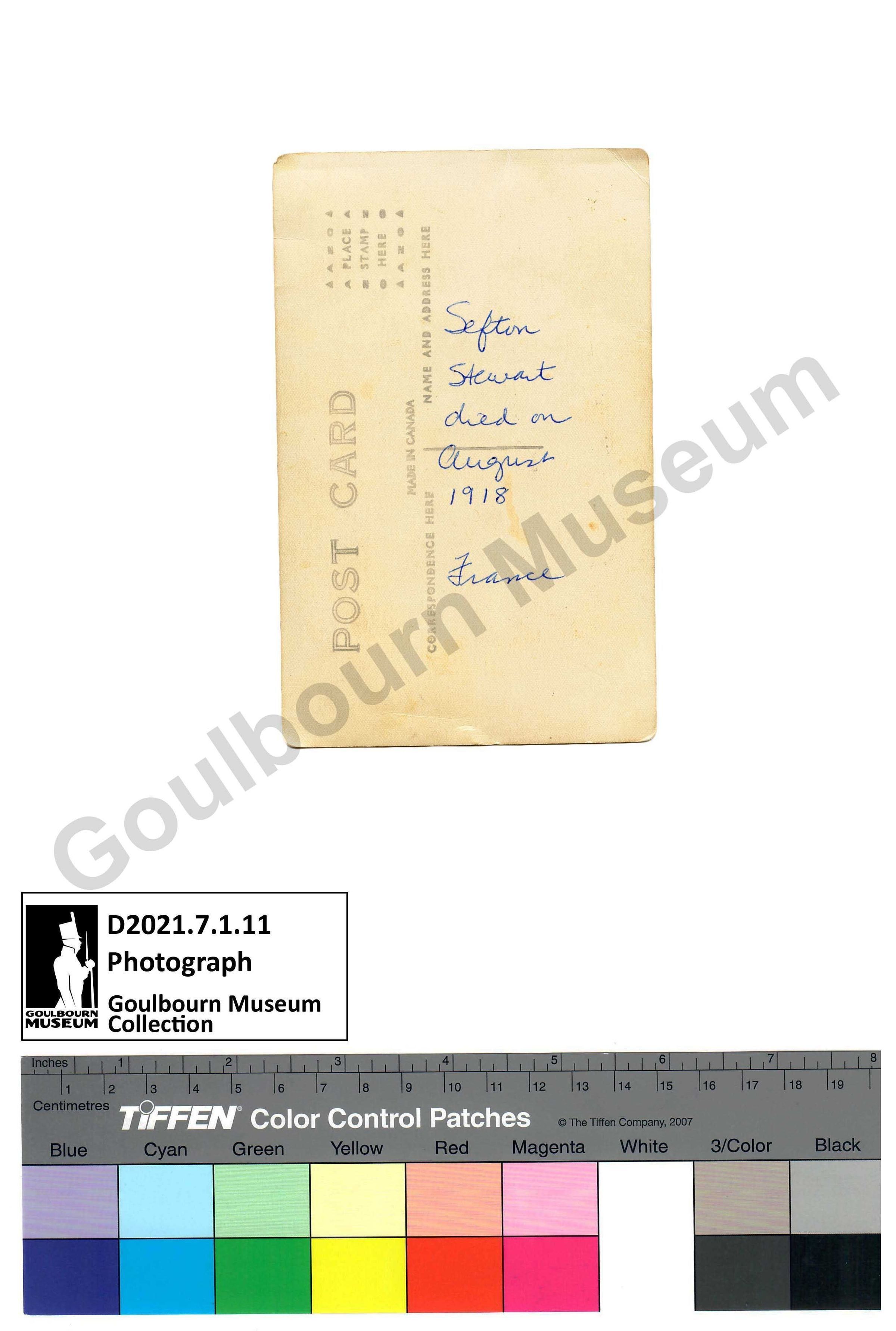 One post card with the studio portrait of Sefton Stewart featured on the image side. The paper card has one side printed with a Post Card template. The top of the card is labelled, "POST CARD," the left side of the card is labelled with the title, "CORRESPONDENCE HERE," the middle of the card says, "MADE IN CANADA," the right side of the card is labelled, "NAME AND ADDRESS HERE," and the far right upper corner has a square design with interior text that says, "PLACE STAMP HERE." A handwritten inscription is added to the card which reads, "Sefton Stewart died on August 1918 France." The card was not used, does not include an addressed message or a postage stamp. The image side of the post card has a studio portrait of Sefton Stewart who is standing and posed to face the camera straight on. There is a waist high table beside Sefton and on the left side of the photo, on the table are positioned a field cap with hat badge along with what presumably is a "swagger stick." Sefton's right hand is resting on the table behind the field cap. Sefton is wearing a military uniform that includes a wool jacket with a high flat buttoned collar, collar badges on either side of the collar closure, two large breast pockets, shoulder epaulettes, and circular metal button closures. Sefton is wearing wool pants with puttees wrapped around his lower ankle to knee. Sefton has dark coloured polished leather boots on his feet. The studio background is an interior, with a window and draped fabric and curtains on the right side of the background and a shaded dark background with no detail on the left side of the photo. Sefton Stewart was a member of the Canadian Expeditionary Force and served during the First World War from 1916-1918. Sefton was a resident of Richmond, Ontario.Subject Person/Organization