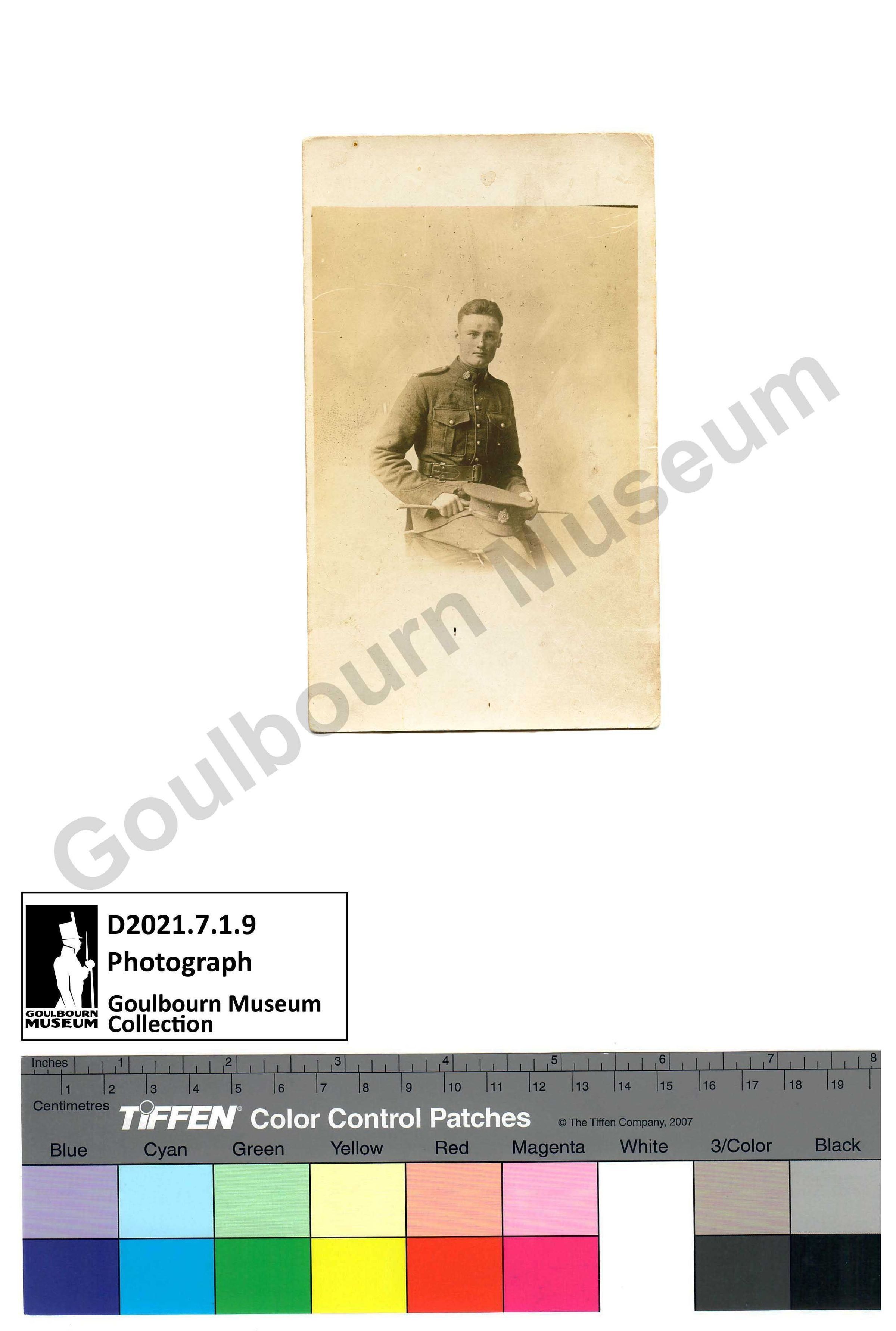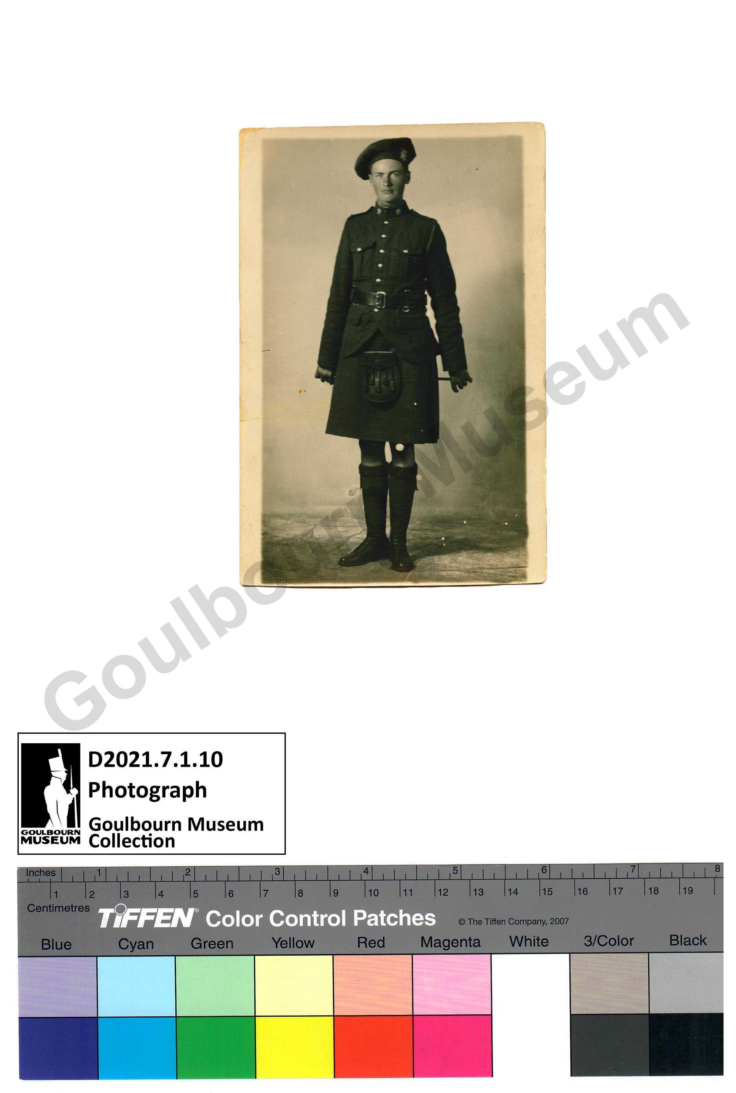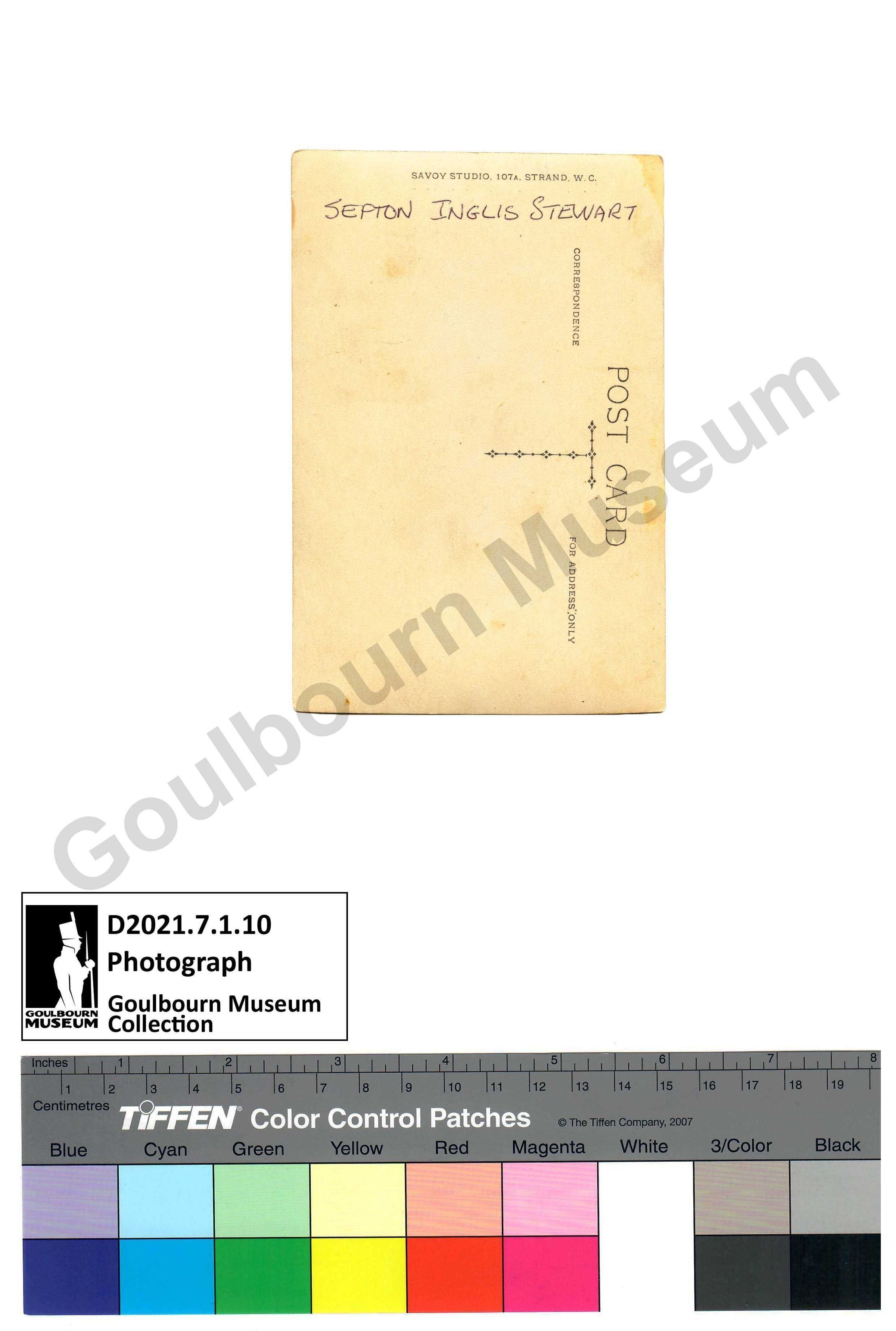 One post card with the studio portrait of Sefton Stewart featured on the image side. The paper card has one side printed with a Post Card template. The top of the card is labelled, "POST CARD," the far left side has text that is oriented vertically along the left edge of the card that reads, "SAVOY STUDIO, 107A, STRAND, W.C.," the left side of the card is labelled with the title, "CORRESPONDENCE" and the right side of the card is labelled, "FOR ADDRESS' ONLY." A handwritten inscription is added to the card which reads, "SEFTON INGLIS STEWART." The card was not used, does not include an addressed message or a postage stamp. The image side of the post card has a studio portrait of Sefton Stewart who is standing and posed to face the camera straight on. Sefton is wearing a military uniform that includes a headdress composed of a balmoral and hat badge on his head, a wool jacket with a high buttoned collar, collar badges on either side of the collar closure, two large breast pockets, a leather belt around the natural waste and circular metal button closures. The military jacket is tailored with a cut out to accommodate the sporran element of the highland military uniform. Sefton is wearing a kilt made with a solid coloured fabric that is knee length. On top of the kilt is a dark coloured leather sporran positioned central to the body below the jacket. Sefton is wearing kilt hose with flashes on his legs and an oxford style polished dress shoe on his feet. Sefton is holding what appears to be a "swagger stick" behind his back with one hand at either end of the stick. Sefton Stewart was a member of the Canadian Expeditionary Force and served during the First World War from 1916-1918. Sefton was a resident of Richmond, Ontario.Subject Person/Organization