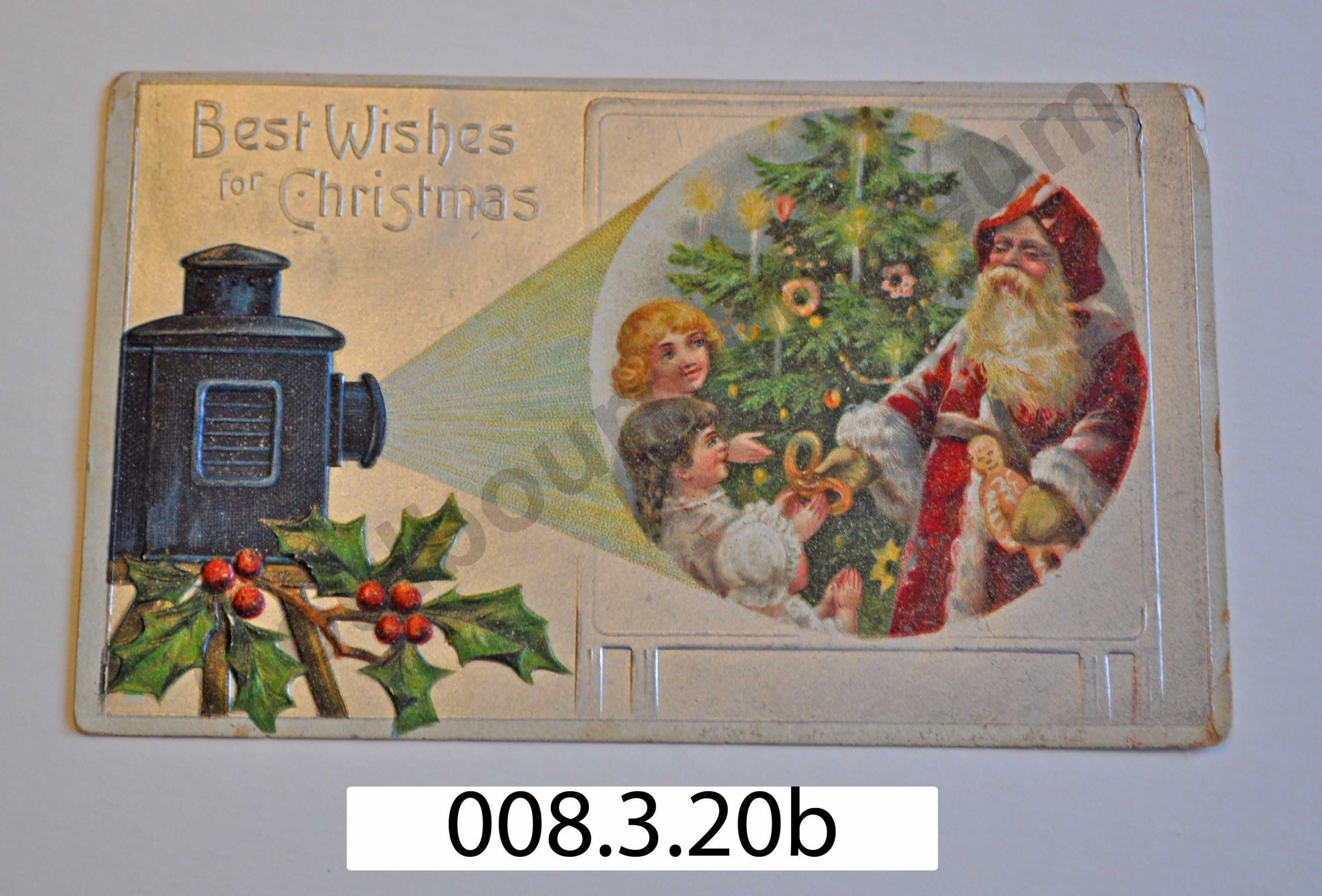 The front of the postcard is largely silver, with 'Best Wishes for Christmas' in raised type. On the left there is a black lantern, shining a halo of light. Within the light is Santa with two young children decorating a Christmas tree. On the back there are two cancellation stamps, one from Jock Vale dated December 21, 1908 and one from Richmond dated December 22, 1908. There is a postage stamp commemorating 3rd Centennial of Quebec, with portraits of Cartier and Champlain. It is addressed to 'Miss Myrtle Davis, Stapledon Ont.' The message reads, "Hello Myrtle, I got your card a few days ago and I send you many thanks. Be sure and come down this winter. Our Xmas tree is the 21st. Yours as B4 Sadie B."Lexicon