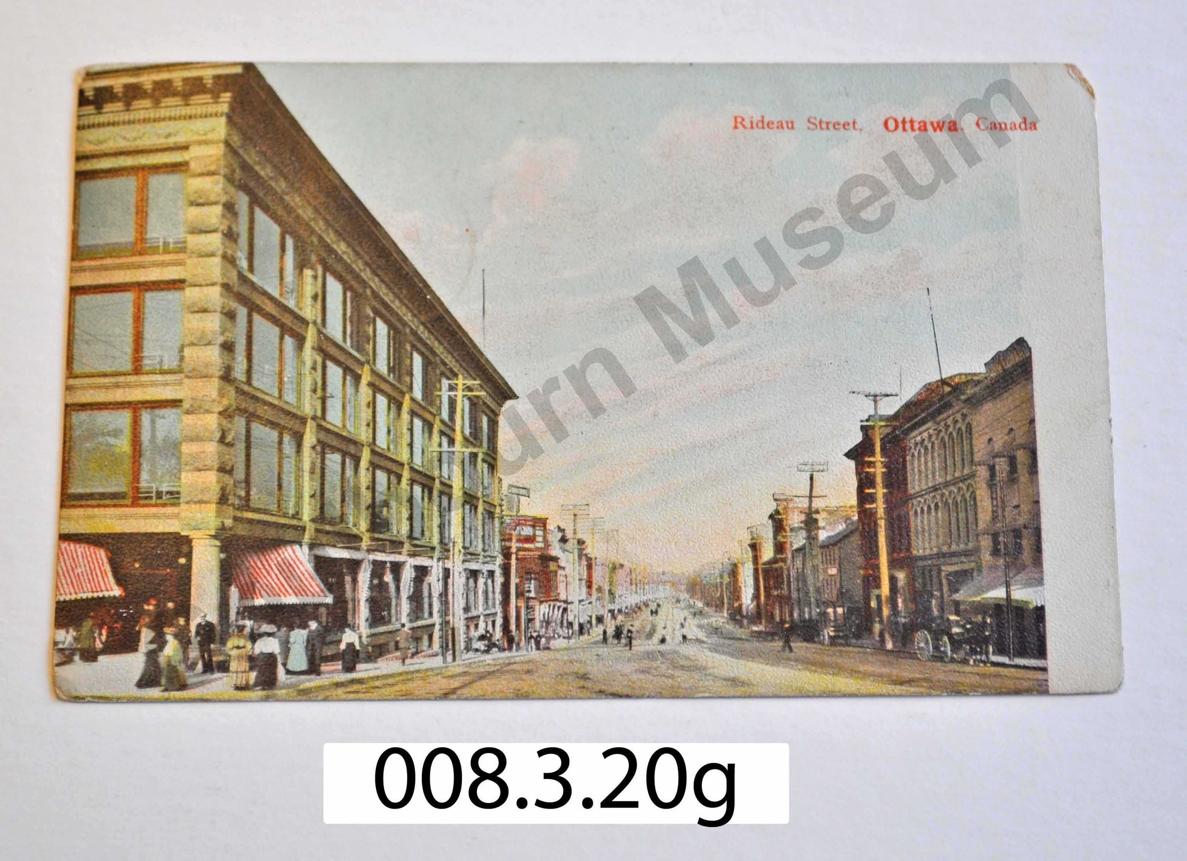 On the front there is a coloured image of Rideau Street. There are many people walking around and a horse drawn carriage on one side of the road. Telephone poles line the street. On the back there are three cancellation stamps, although only two are fully legible. One is from Ottawa and is dated October 3, 2pm, 1907. Another is from Richmond and is dated October 4, 1907. The third might be from Stapledon, only the -DON is clear, and is dated October 5, 1907. There is a green one cent George V postage stamp. It is addressed to Miss Myrtle Davis, Stapledon Ont. The message reads: Dear Myrtle, You will recognize this scene I am sure. Write soon, remember you owe me a letter. Yours affectionately, LM.Lexicon