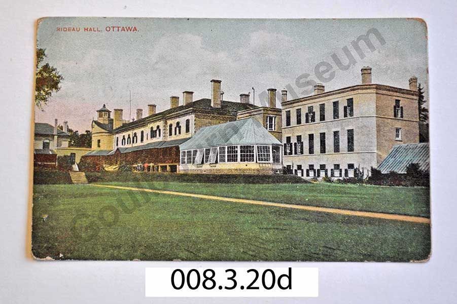 On the front there is a coloured image of the Parliament buildings, mainly of the library, over the Ottawa river. There is also a glimpse of the locks including the Commissariat. Some small buildings can be seen along the banks of the Ottawa river, as well as some signs of Ottawa's timber industry. On the back there are two cancellation stamps, one from Richmond dated March 12, 1908 with another stamp from Stapleton overtop bearing the same date. There is another cancellation stamp dated March 11, 1908, but the town name is unclear. There is a green George V one cent postage stamp, upside down. It is addressed to Miss Myrtle Davis, Stapleton Ont. The message reads: Hello Myrtle, How are you all down there we are all well here well it was sad about Bernice she will be missed around here we will miss her alas they are a lonely family. Well Myrtle spring is here again I am glad. From Sadie. Excuse this scribbling as I am sleepy it is bed time. Answer soon.Lexicon