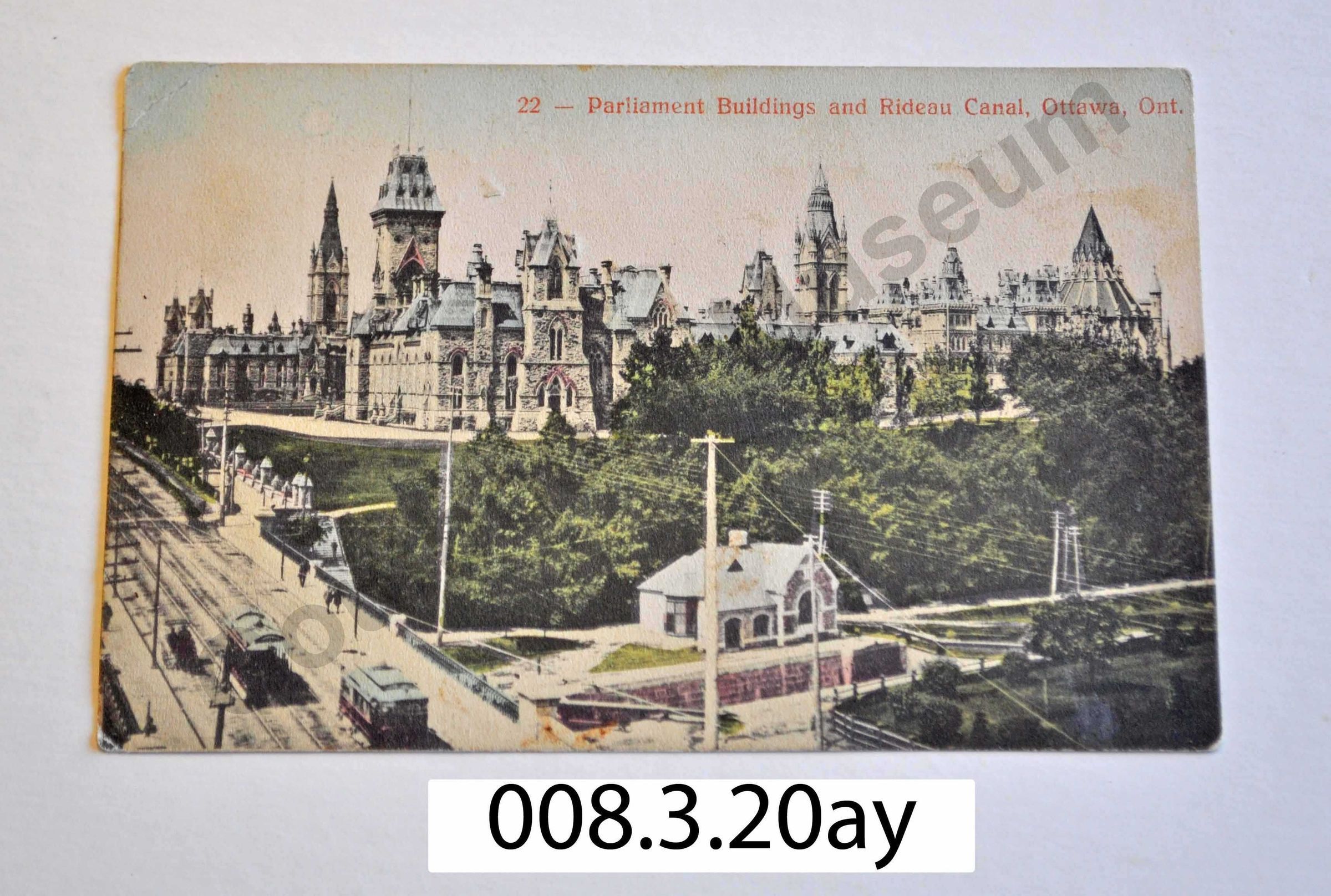The front top of the postcard reads in red, "22 Parliament Buildings and Rideau Canal, Ottawa, Ont." The coloured image shows street cars, telephone lines, and the Rideau Canal locks with the Parliament Buildings behind. The back of the postcard has something crossed out along the top, and beside is the date the postcard was written, March 31, 1909. There is a cancellation stamp marking it passing through the Richmond post office on April 7, 1909. There is no postage stamp, but where one should be there is written, "April fool Myrtle." The postcard is addressed, "Miss Myrtle Davis Stapleton P.O. Ont." On the other side is the sender's message, who tells Myrtle that she shouldn't go too far away, "for there will be somebody lonesome."Lexicon