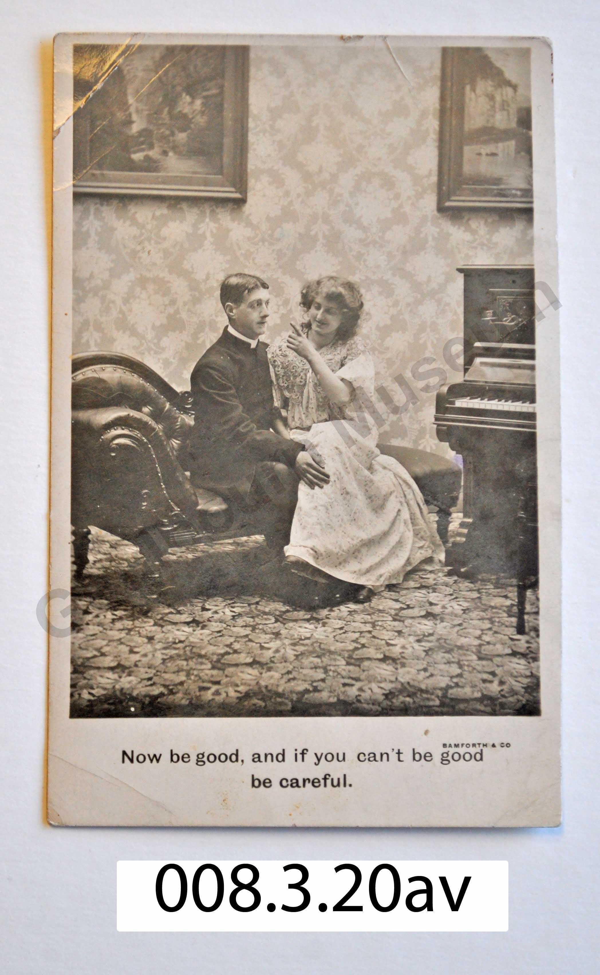 The front contains a black and white photo of a man and a woman sitting on a chaise lounge. The woman is smiling and is pointing her index finger at the man. The man is looking at the woman's face and his hand is on her leg. The couple are in a formal sitting room with a patterned carpet, two paintings on the wall behind them, and the edge of an upright piano off to the side. Underneath the photograph is a text that reads, "Now be good, and if you can't be good be careful." The back of the post card is divided into two sections, with the words 'Post Card' displayed along the top centre. Under that reads, "This side for address." Along the right edge reads, "Bamforth & Co., Publishers, Holmfirth and New York. (England)."