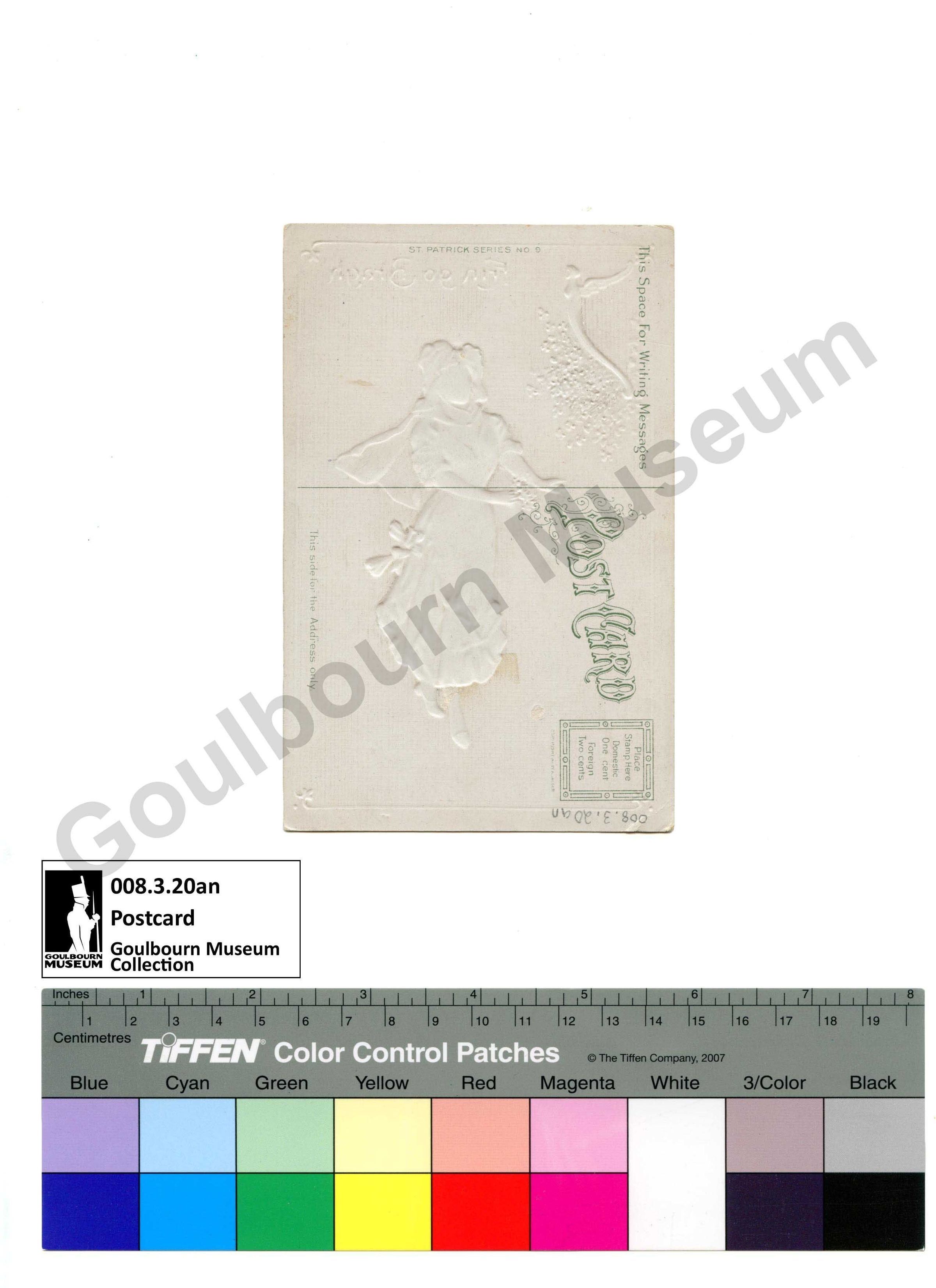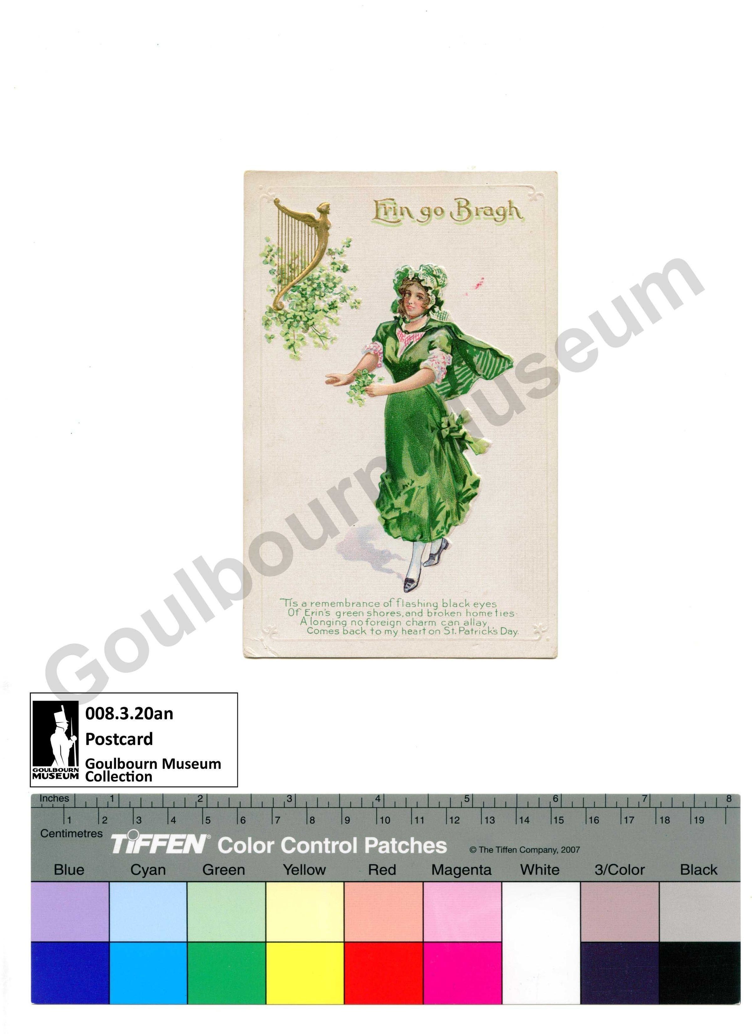 The front of the card is a raised image of a woman in a green dress, holding a brunch of clovers. There is a golden harp in the top right corner, its bow in the shape of a woman with wings. The harp is surrounded on by a bed of clovers. Above the woman there is golden text reading, 'Erin go Bragh.' Just below the woman's feet there is green text that reads, 'Tis a remembrance of flashing black eyes / Of Erin's green shores, and broken home ties. / A longing no foreign charm can allay / Comes back to my heart on St. Patrick's Day.' On the back the postcard is divided into two sections, the right specifies that it is for, 'This Space For Writing Messages.' The left side reads, 'Post Card' along the top in stylized font, then a square for the postcard in the corner. Inside the stamp box reads, 'Place stamp here / Domestic One cent / Foreign Two cents.' Along the very bottom reads, 'This side for the Address only.' The postcard bears no message or address.Context