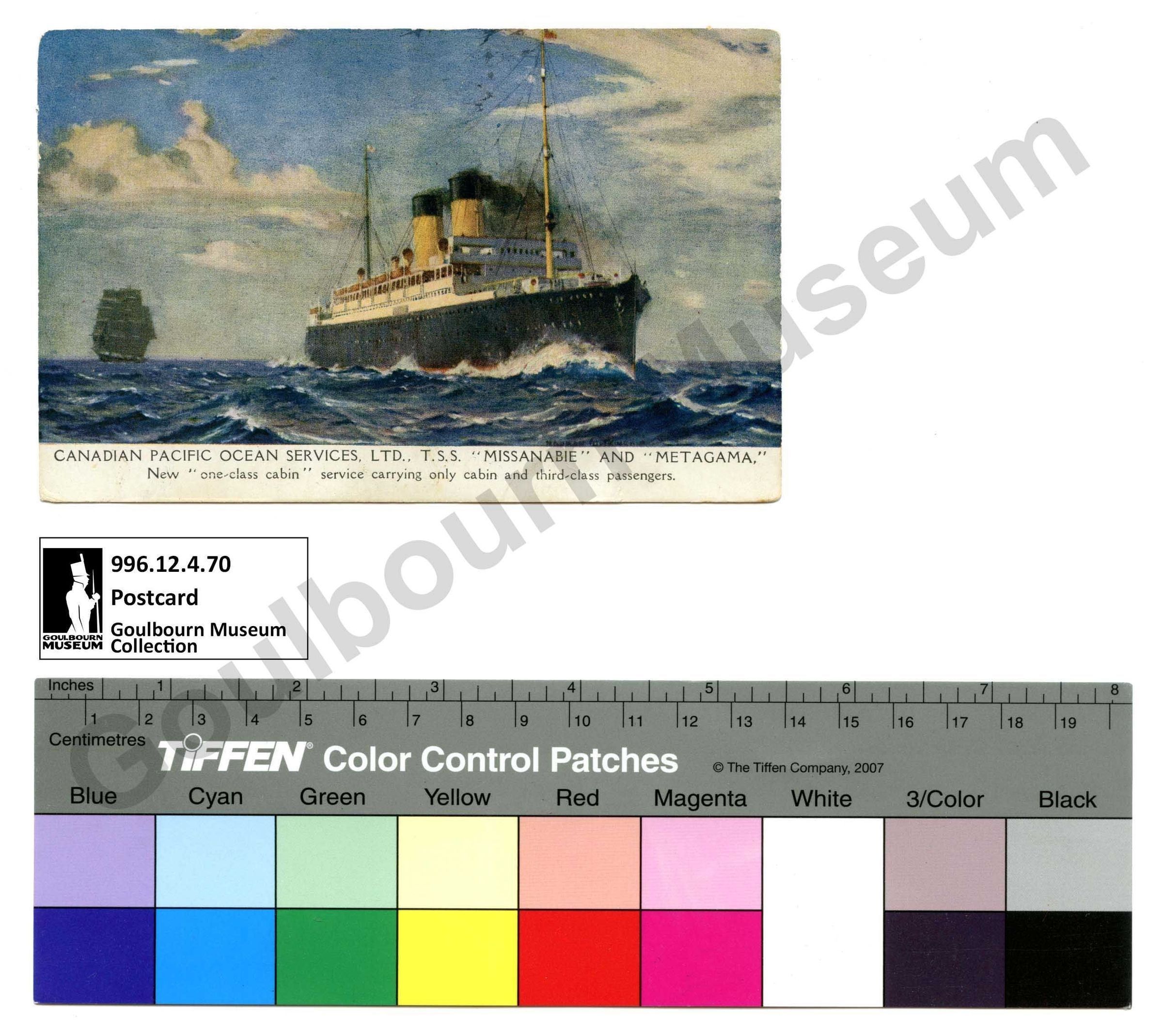Postcard addressed to Mrs. James Stewart, dated June 19, 1916. The image on the front is an illustration that depicts the T.S.S. “MISSANABIE” AND “METAGAMA.”Subject Person/Organization