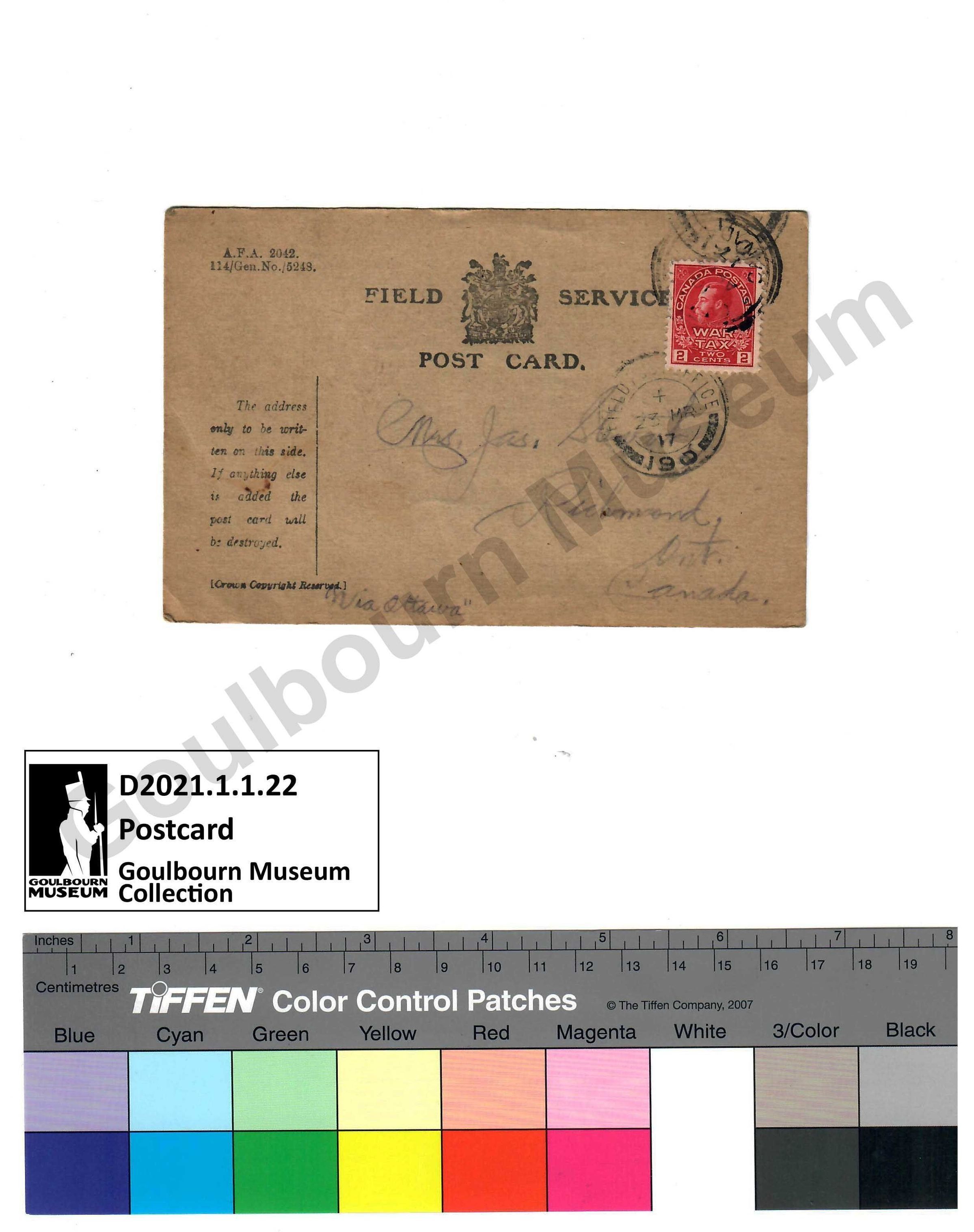 Digital Artifact: One field service post card, written in pencil. The post card was written by Richmond, ON resident Pte. Sefton Stewart while serving in in France during the First World War. Addressed to Mrs Jas. Stewart, postmarked 23 MR 17.Subject Person/Organization