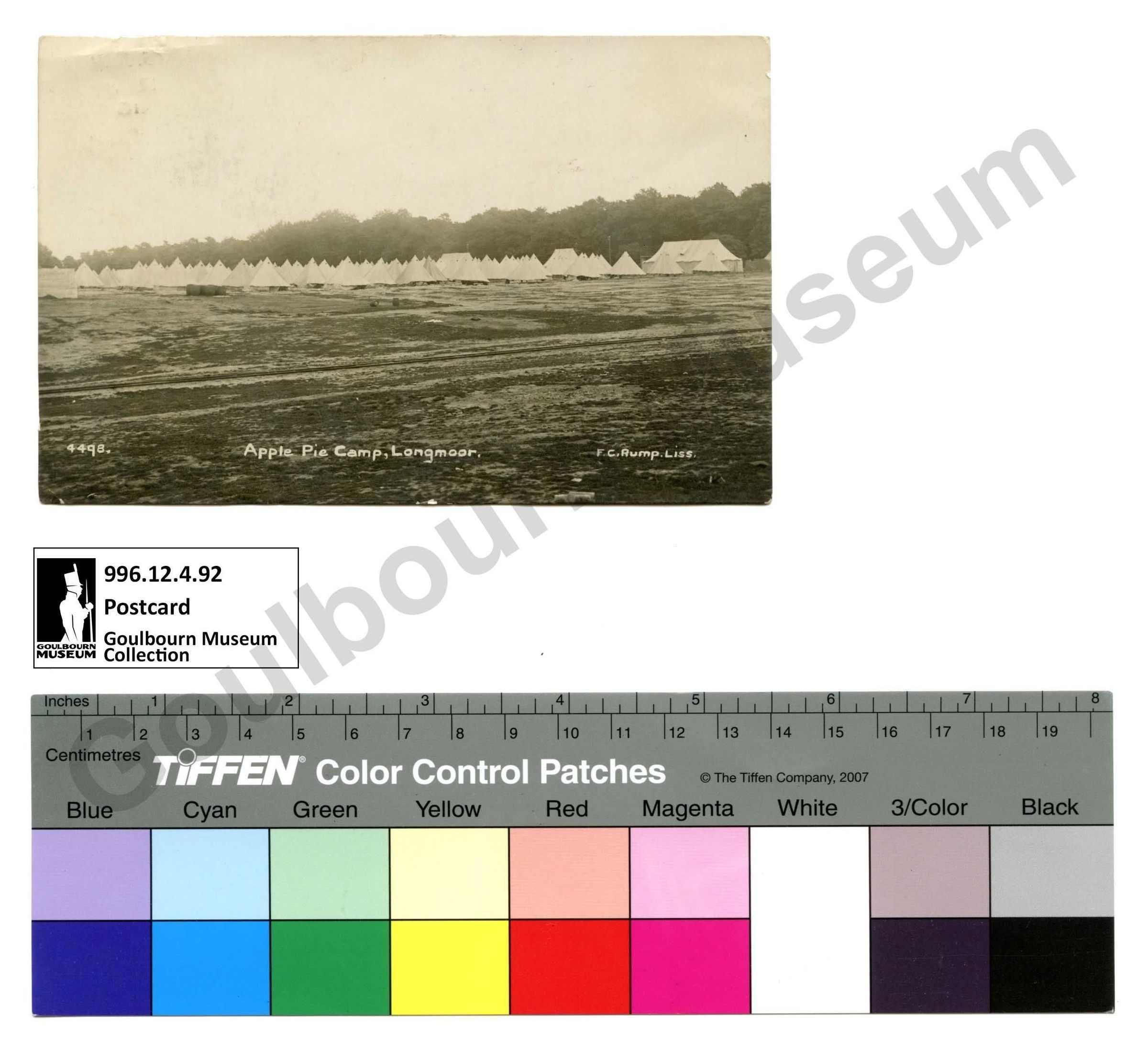 Postcard addressed to Mrs. James Stewart, dated July 11, 1916. The image on the front is a photograph that depicts the army tents of Longmoor camp in England.Subject Person/Organization