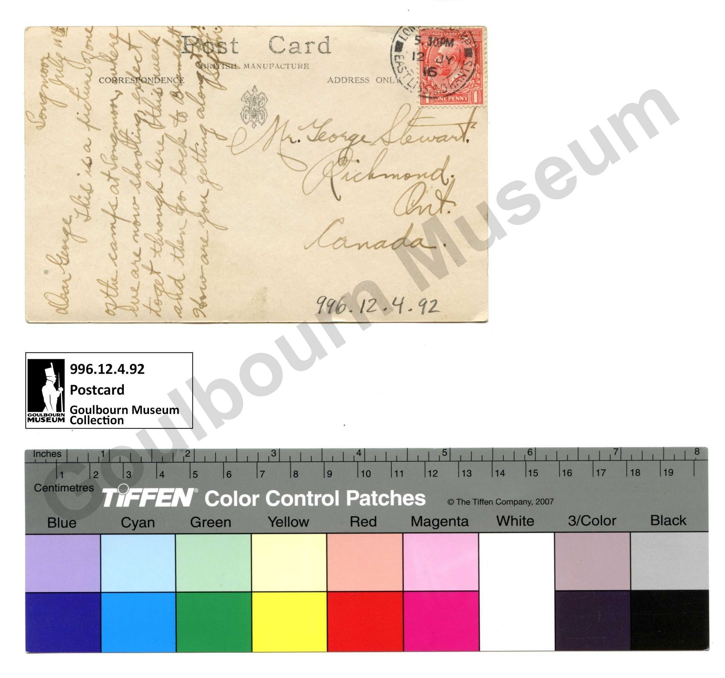 Hand written postcard which is part of a collection of letters written by Richmond, ON resident Sefton Stewart.Collection
