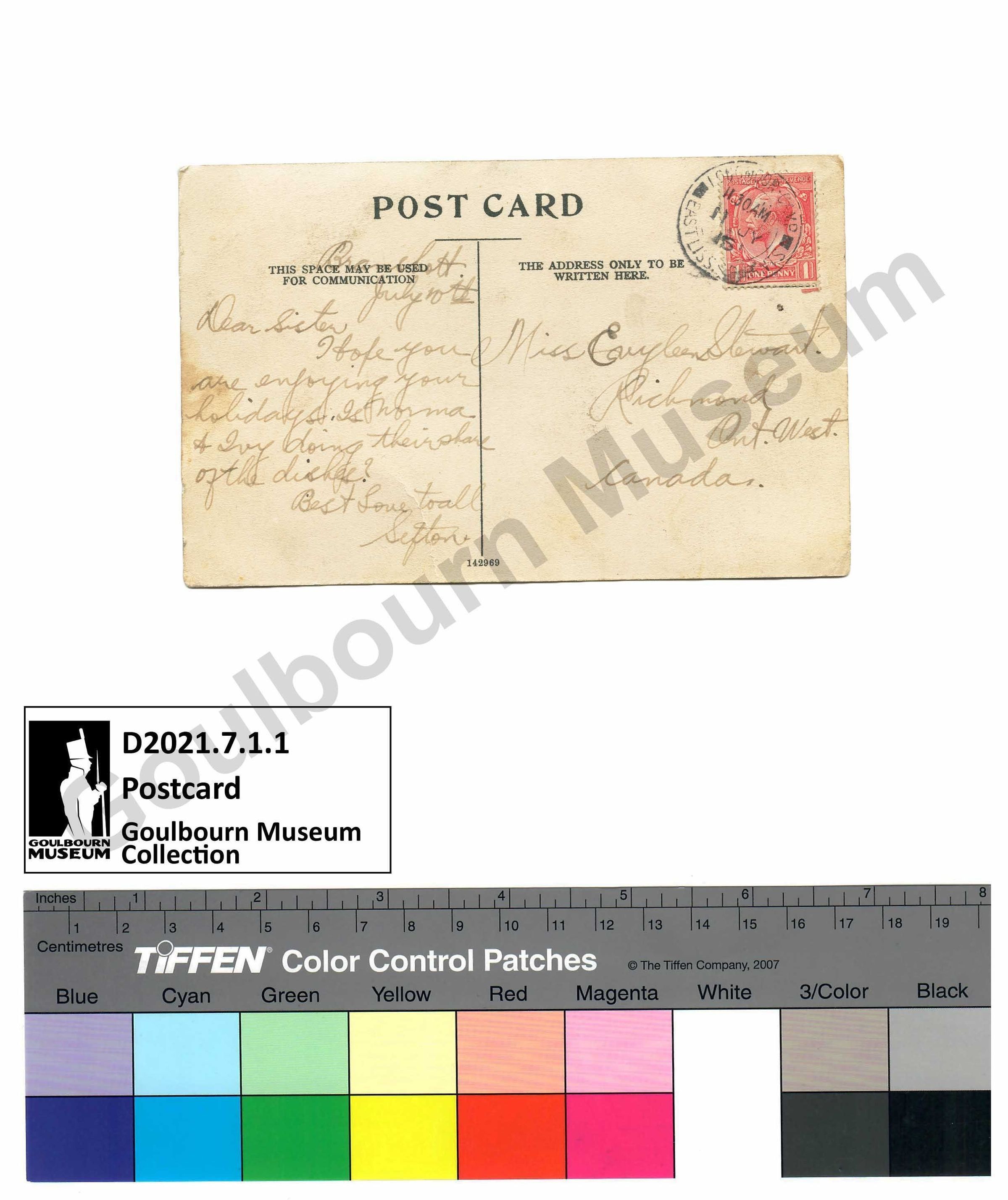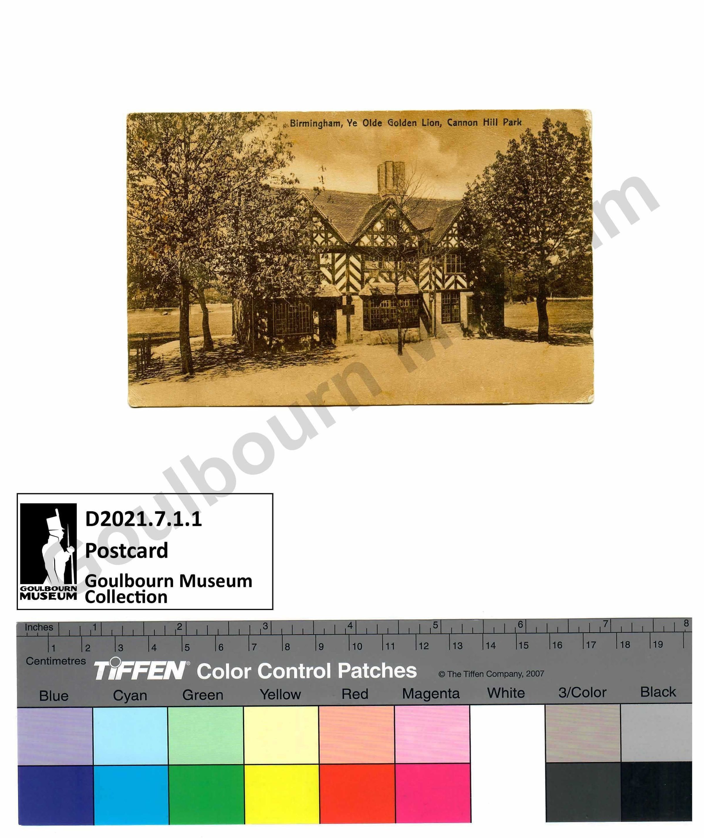 Rectangular paper post card addressed to Miss Evyleen Stewart, Richmond, Ont. West, Canada from Sefton Stewart. The front of the card has a sepia toned black and white photograph of a three storey building flanked on either side by trees and obscured slightly on both sides by branches and leaves. there is a central tree in front of the building lacking leaves. The background appears to be flat terrain with a tree line in the distant horizon. At the top of the card in black ink is printed the title, "Birmingham, Ye Olde Golden Lion, Cannon Hill Park." The reverse of the post card has a handwritten message from Sefton Stewart (of Richmond, Ontario) to his sister Evyleen Stewart. The message reads, "Bramshott / July 10th / Dear Sister / Hope you are enjoying your holidays. Is Norma & Ivy doing their share of the dishes? Best Love to all / Sefton" The top right corner of the post card has a red and white coloured postage stamp with a portrait of King George V and marked with the postage value of 1 penny. The postage cancellation stamp has an indistinguishable location, the date and time of the cancellation stamp reads, "11:30 AM 11 July 16."Subject Person/Organization