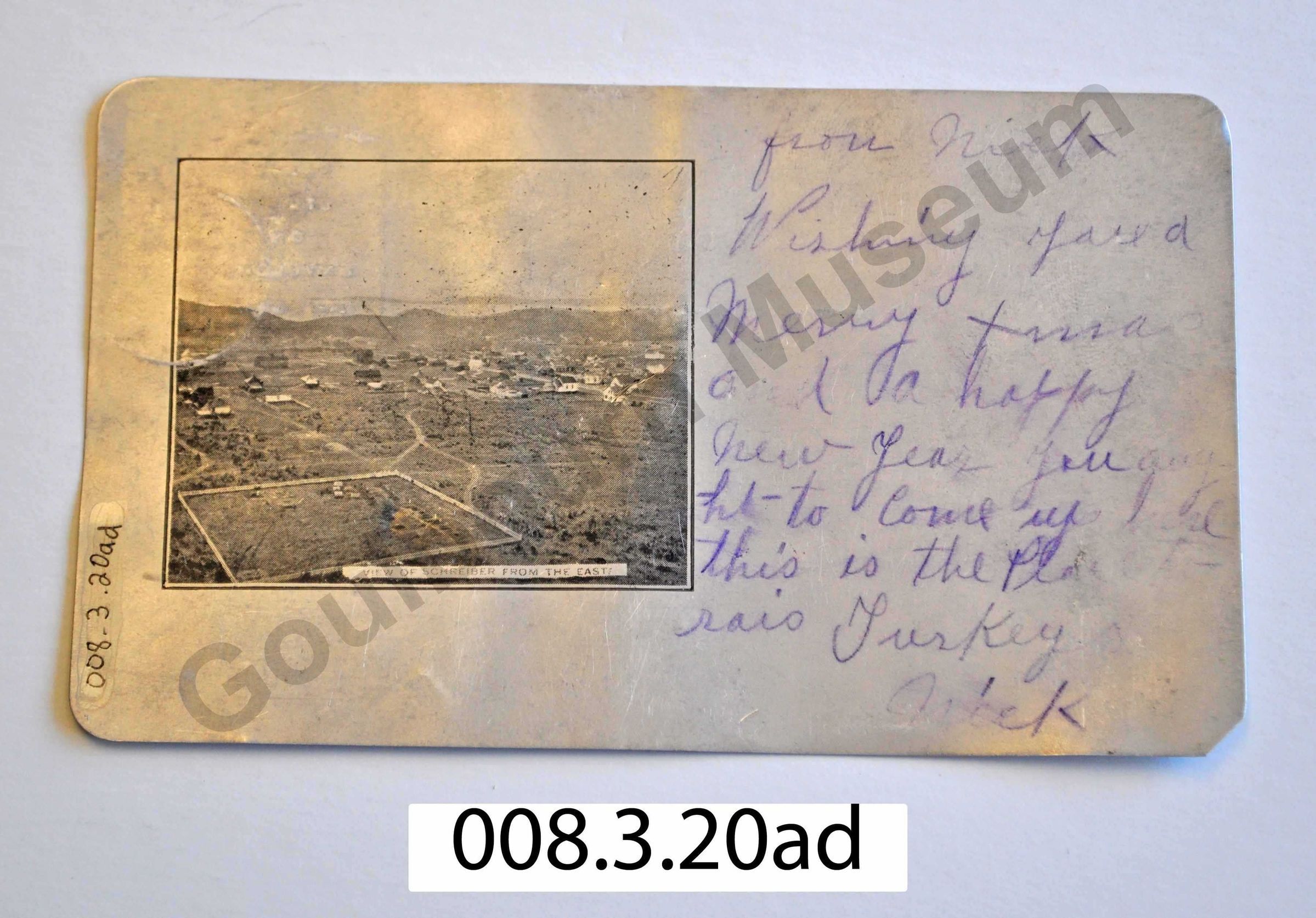 Silver postcard with a black and white photograph on the front. Located in the bottom proper left corner of the photograph is the caption: View of Schreiber from the East. The front of the postcard also contains a handwritten annotation, written in blue pen, that reads: Wishing you a Merry Xmas and a happy New Year. You aught to come up here this is the... Part of the note is illegible due to fading. The back of the postcard is blank but has the stamped information in black ink that reference it as a Post Card and include instructions for mailing as well as address and stamp information.