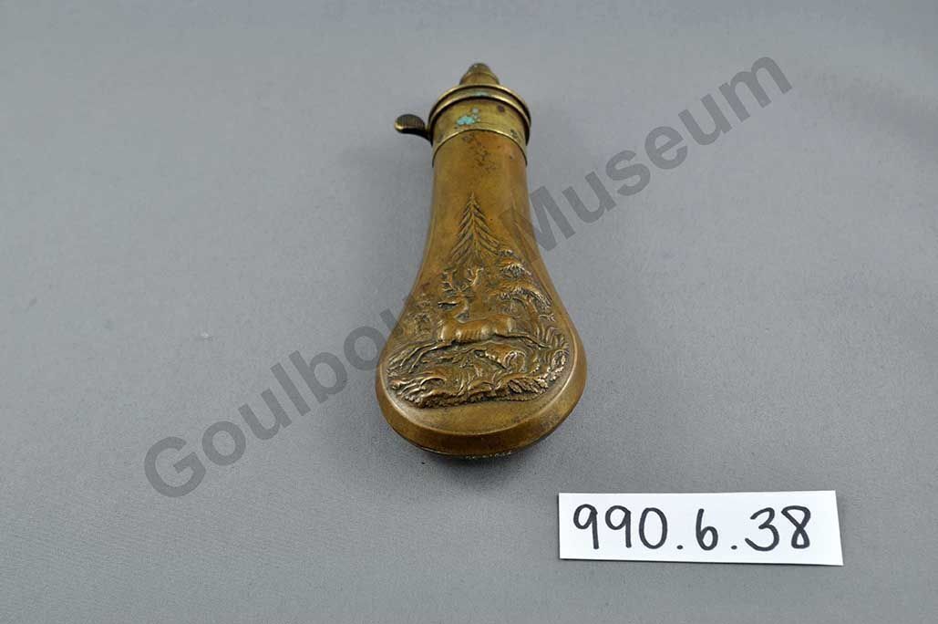 Pear-shaped metal powder flask manufactured by G.W. Ingram. In the nineteenth century, powder flasks were used as containers for gunpowder; gunpowder was dispensed through the brass spout, known as the "charger," that appears at the end. The lever was used to control the strength of the powder charge; four values, "1/8," "5/8," and "6/8," are etched into the side of the charger, above the lever. A forest scene depicting a deer is embossed onto the surface of the charger; an identical design appears on the front and back.
