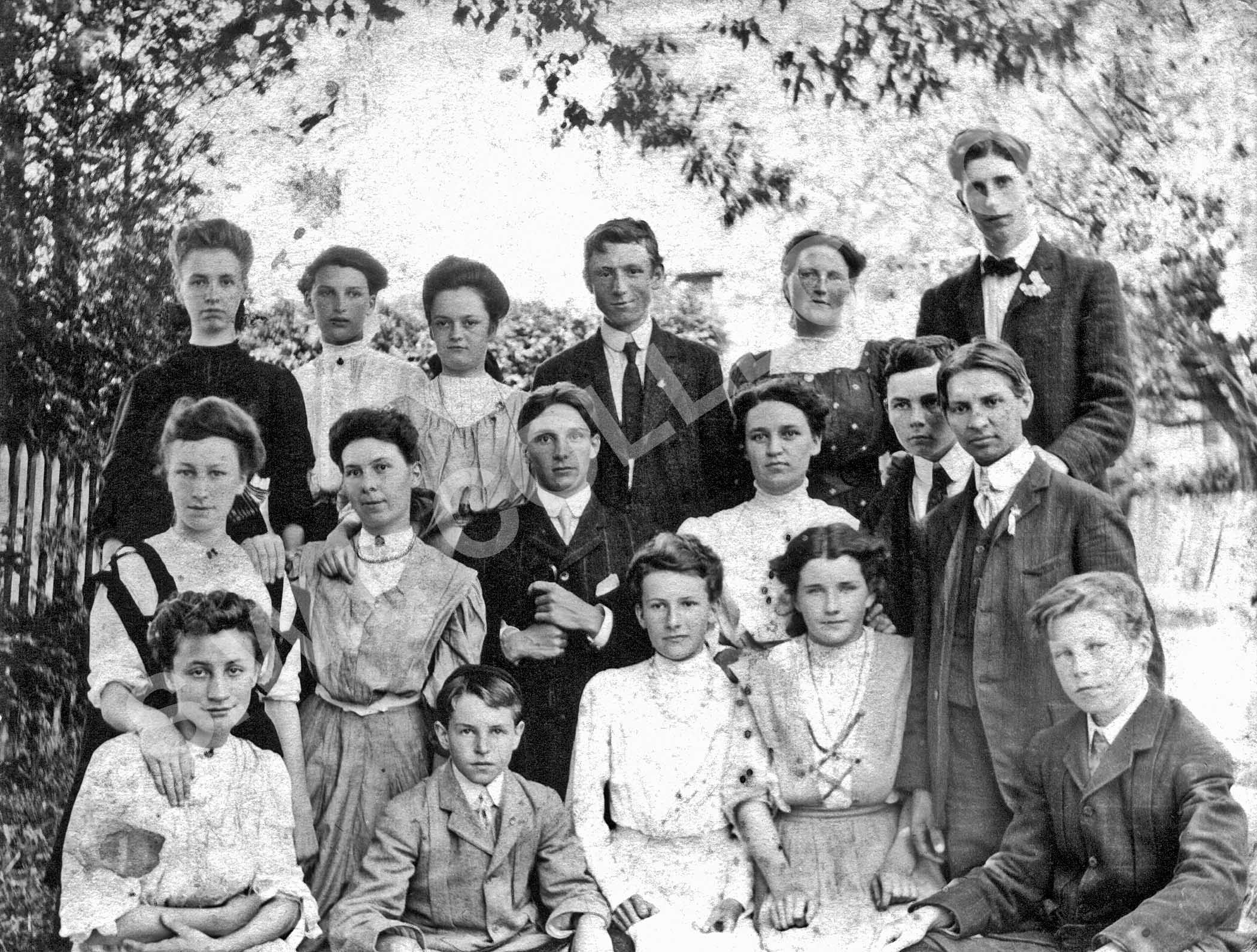 Front row Mabel McCarten (Mrs. D. Pierce), Charles Bayne, Maude McLaren, Gertis Cleary, Hiram Smith, Gorrell Lewis. Middle row Maude Drummond, Elizabeth McLaughlin, Lloyd Hill, Miss Peregrine (teacher), Wilfred Byrne. back row Violet Stanzel (Mrs. Wiliam McDougal, Emma Fadden (Mrs. Max Fumerton), Gertie Corkery (Mrs. L. Moore), Bill Leach, May Simpson (Mrs. Lloyd Hill), Harold Lowe. Information by H.H. Lowe.Photograph Details