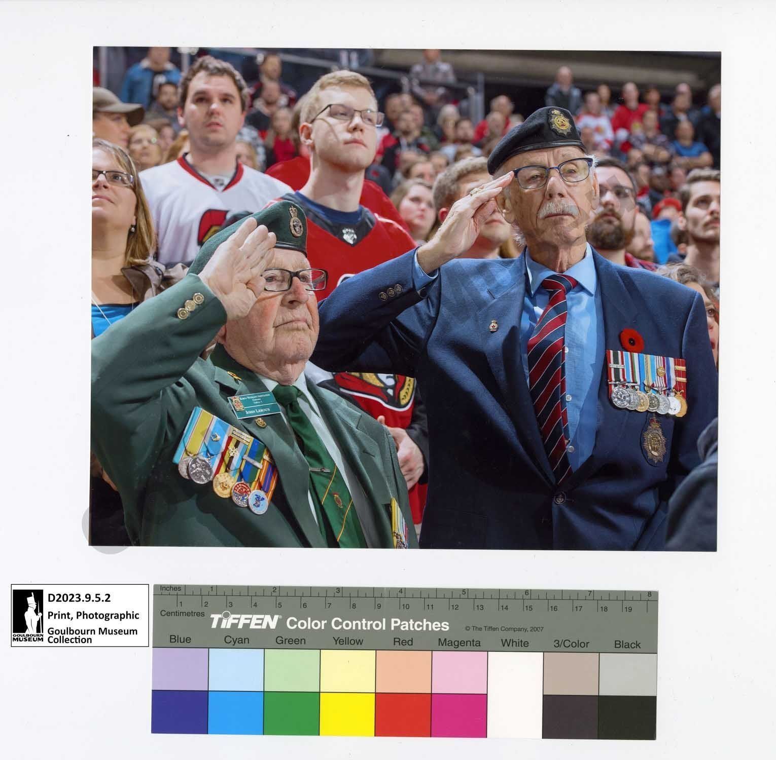 Colour photograph of John Leroux of Stittsville, Ontario and a unidentified veteran. The men were attending an "Army Night" event at the arena in Kanata and watched the Ottawa Senators play the Chicago Blackhawks. John received six special passes to the event and brought five veterans with him. The two men are photographed saluting with a standing crowd behind them presuming the national anthem was playing at the time. The men are wearing suit jackets with military and Royal Canadian Legion decorations. John Leroux is on the left side wearing a green coloured suit jacket, green tie with a diagonal fine yellow and red stripe, 2nd Guards cap badge, and a black beret. John Leroux has a Korea Veterans Association Canada Local 7 name badge on his lapel, along with a yellow ribbon pin above the name badge, and an undistinguishable pin below the name badge. John is wearing two sets of medals, one on the left side of his jacket and the other on the right side of his jacket. The unidentified veteran is on the right side, is wearing a blue suit jacket, blue collared shirt, and red and blue striped tie. He has a black beret with an unidentified cap badge, a Royal Canadian Legion pin on his lapel, a red poppy, set of military decorations numbering seven in total with two having additional bars to note. Below the medals is a military badge sewn on the jacket.Photograph Details