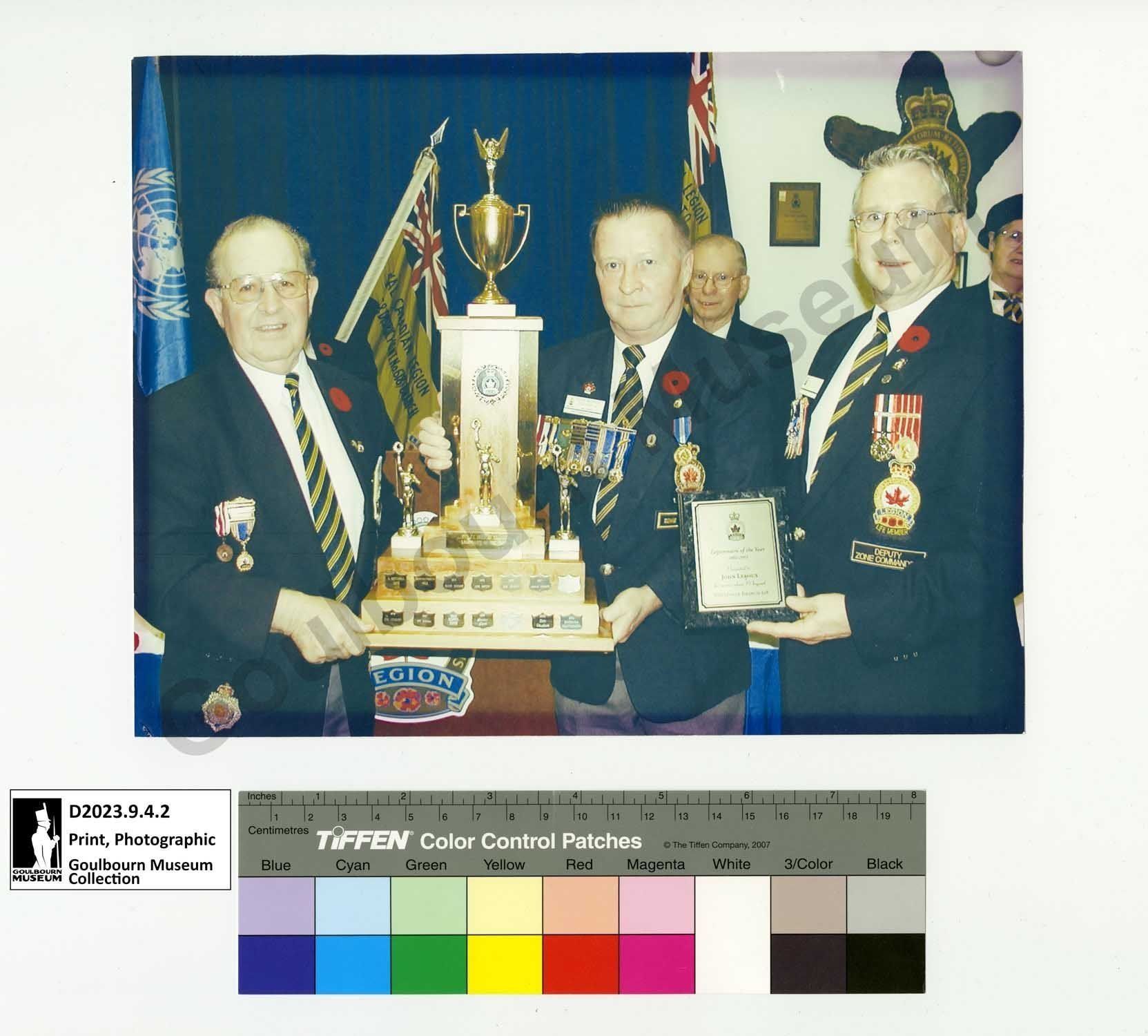 Colour photograph of John Leroux of Stittsville, Ontario. The photo was taken on the occasion of the Legionnaire of the Year trophy presentation c.2002-2005. This award was presented to John Leroux by the Stittsville branch of the Royal Canadian Legion. The photograph is taken indoors with three central people in the foreground. On the left side is John Leroux, dressed in a dark jacket, white collared shirt and striped tie, he has Legion and service decorations on his jacket. John is holding a large wood and metal trophy. The trophy has a rectangular wooden base with two tiers of wood and metal name plates with recipient information arranged horizontally along the sides of each tier. There are three metal figures placed at the top of the tiers with a vertical element topped with a metal trophy shaped decoration. On the right side of the trophy there is an unidentified man also wearing a dark jacket, collared white shirt, striped tie, Legion decorations and military service decorations. On the far right of the image is a third man, unidentified, holding a plaque. The man is wearing a dark coloured jacket, white collared shirt, striped tie, Legion decorations, military service decorations, and has a Legion patch visible on the right side of his jacket. All three men are wearing a poppy on their right lapel.Photograph Details