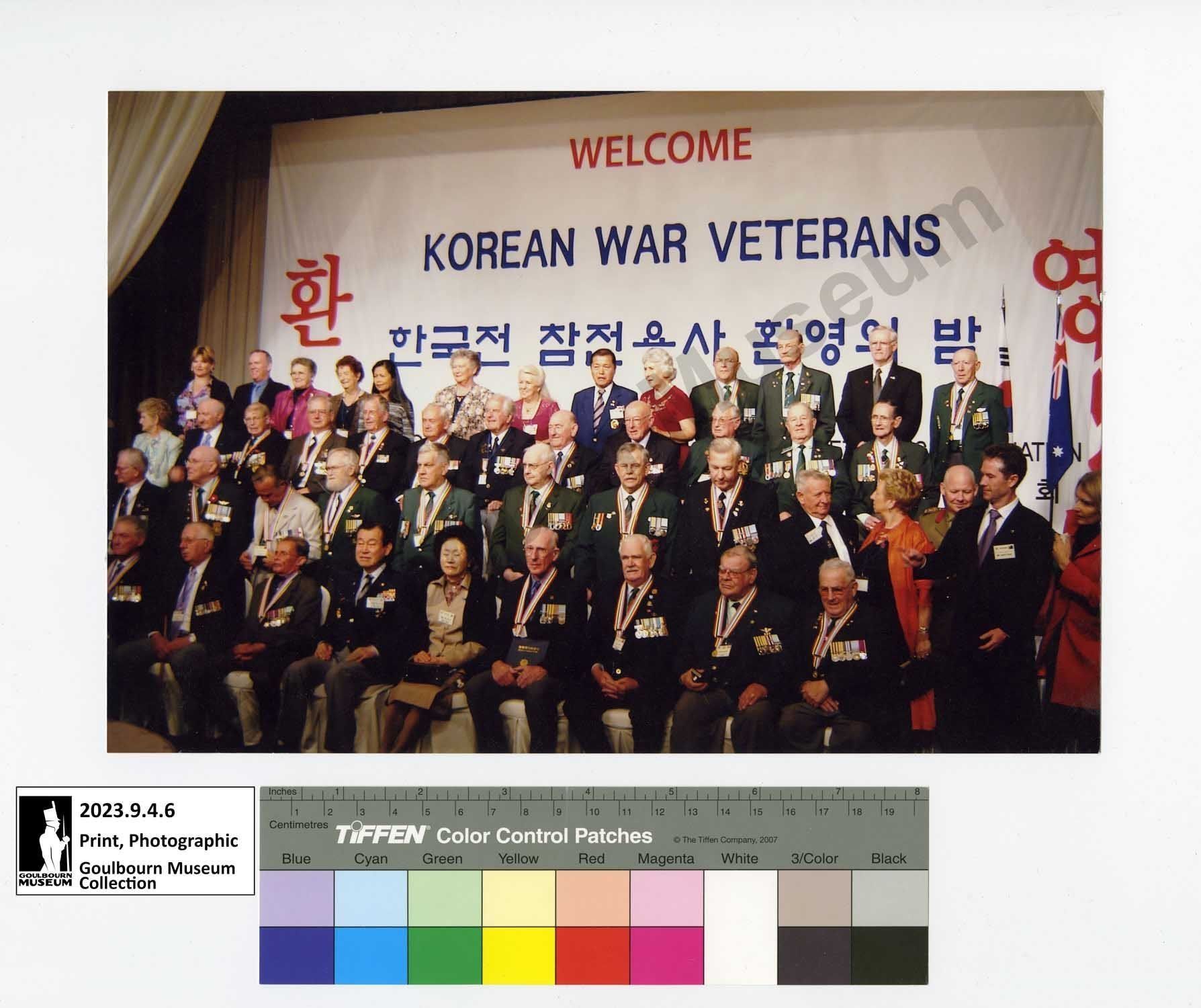 Colour photograph of an event celebrating Korean War Veterans and the awarding of the Ambassador for Peace Medal. The Ambassador for Peace Medal was first presented to veterans who returned to South Korea through the "Revisit Program." John Leroux of Stittsville was in attendance and is located in the third row, second from the end of the row (far right side). The image is composed of four rows of seated and standing individuals in formal dress. There are 47 people in the group photograph. In the background there is a large fabric sign stretched across the wall. At the top in red capital text says "WELCOME" and in royal blue coloured text below reads, "KOREAN WAR VETERANS." The remaining elements of the sign are written in Korean characters.Photograph Details
