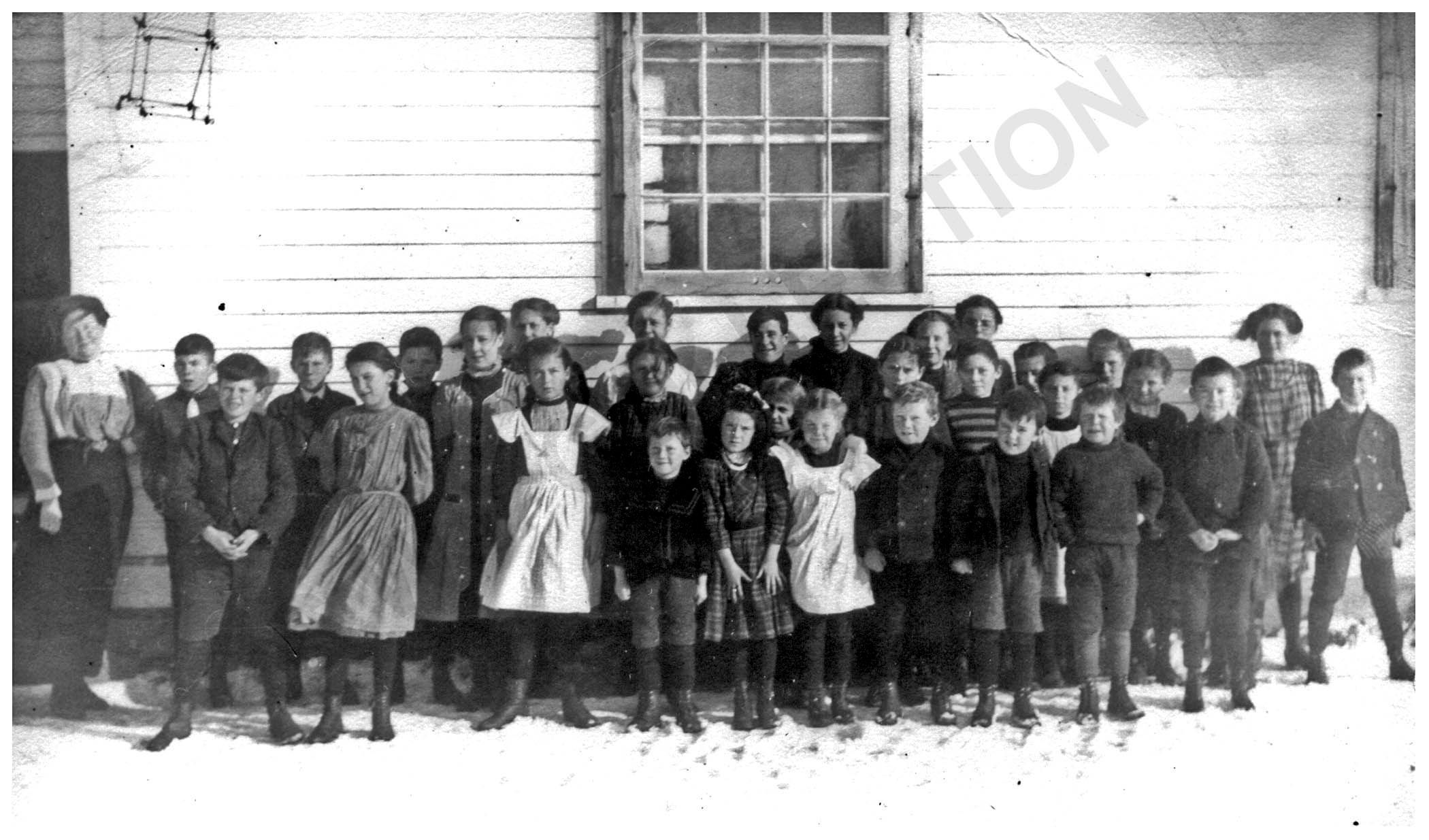 Left to right, teacher Miss may Simpson, Clyde McGonigal, Tom Ormrod, Harry Hobbs, Mary McFadden, Lorne Garvin, Jennie Gow, Edna Garvin (at back), ?, Eva Stewart (tall girl at back), Elsie Simpson, Austin Hobbs (small boy in front), Muriel Simpson, John Gow, Cymbellina Lewis, Kathleen Hamilton, Maude Lyons, ?, John Hobbs, Jessie McFadden, Ruby Smith, Ebert Craig (with stripped sweater), Bessie Craig, Stewart Ormrod, Florrie Ormrod, Myrtle Simpson, Aubrey McDiarmid, Annie Ormrod, Craig Hobbs, Tina McEwen, Mr. Baskin, John C. Clarke, Dick James, Mac Simpson, Gertie Ormrod, Annie Anderson, Mr. Fleming, Jessie Potter, Janie Potter (or Rotter), Nettie McEwen, and Jim Argue.Photograph Details