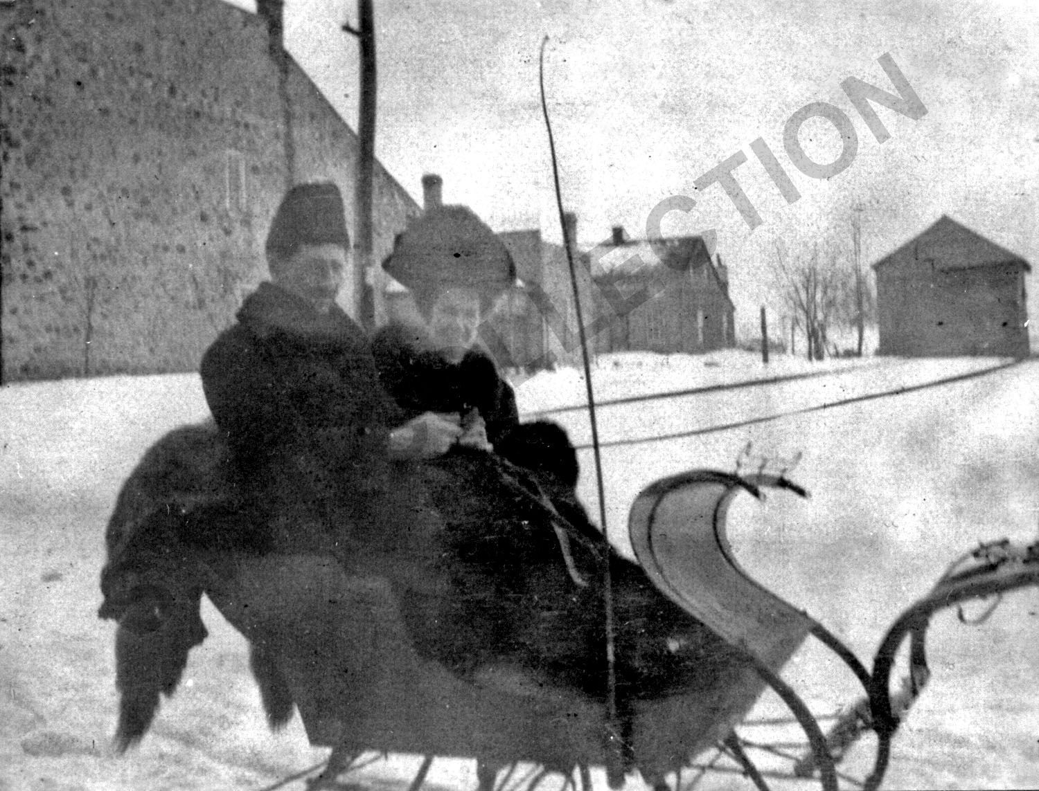 Shopping in Ashton. Going home from shopping in Ashton. Mr. and Mrs. Blair in sleigh.