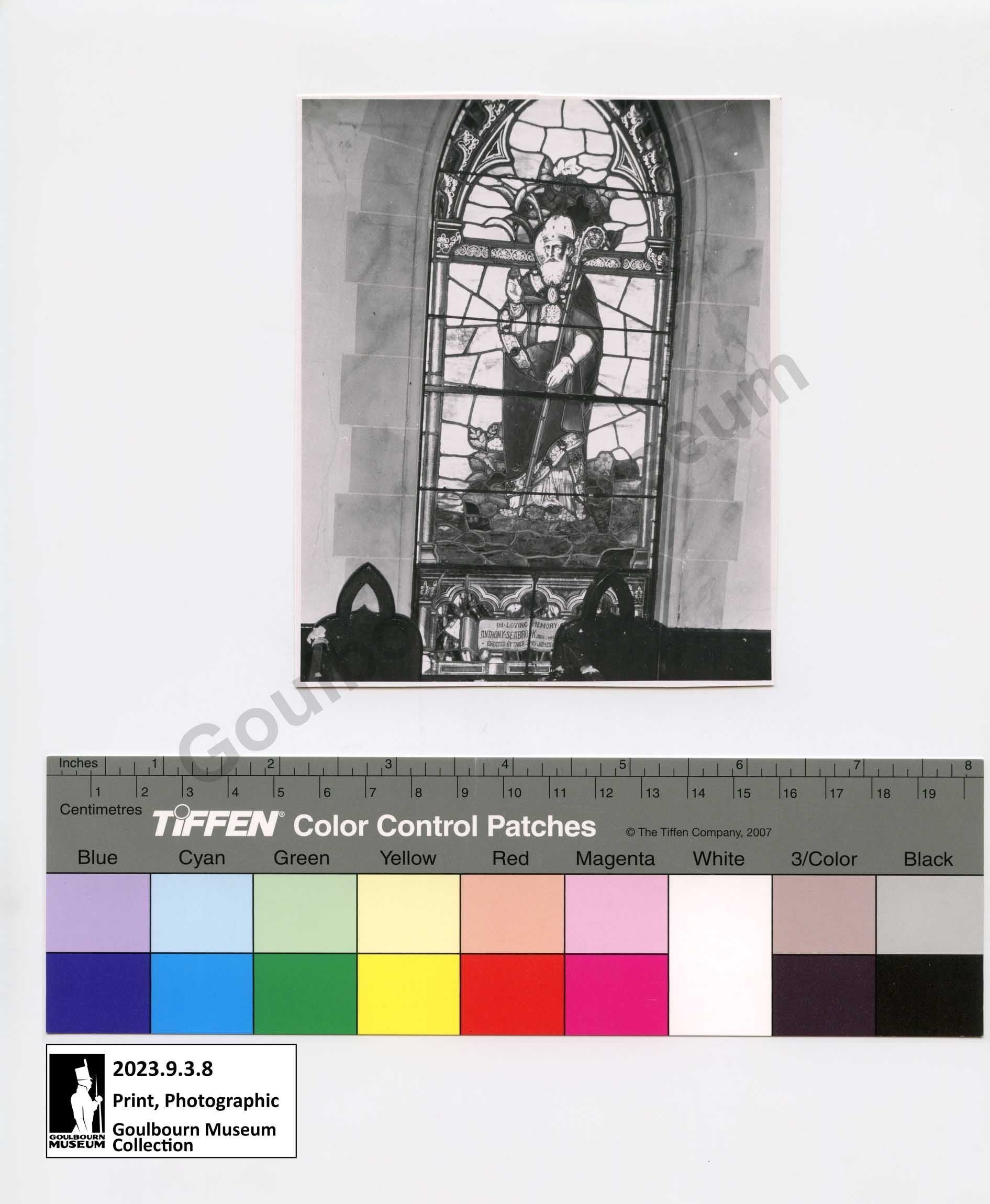 Black and white photograph of St. Thomas Anglican Church in Stanley Corners, Ontario on June 26, 1964. The church was struck by lightening and subsequently the roof caught on fire. The church was a wood frame structure with white wood siding and a metal roof. The photograph shows one of the church's stained glass windows in place. The bottom of the window has a dedication which reads "In Loving Memory" "Anthony Seabrook and his wife Catherine" "Erected by their sons James and Milton". In this photograph some of the text is obscured by pews.Photograph Details