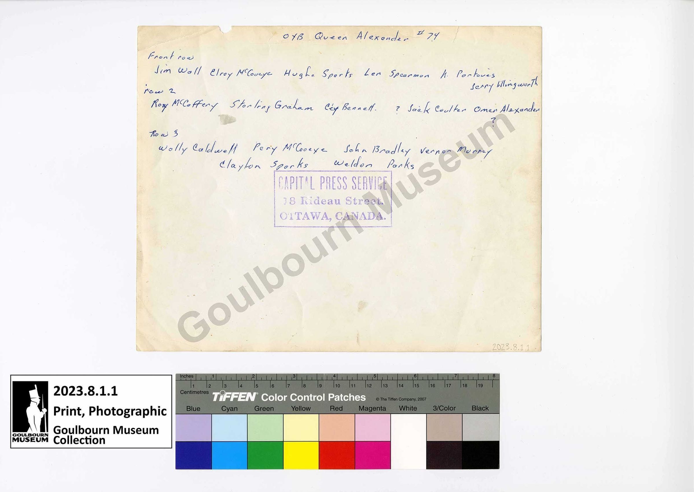 The back of the photograph has the following text: Front Row: Jim Wall, Elroy McCooeye, Hughe Sparks, Len Spearman, K Pontoues, Jerry Lillingworth Row 2: Roy McCaffery, Sterling Graham, Cey Bennett, ?, Jack Coulter, Omer Alexander, ? Row 3: Wolly Caldwell, Pery McCooeye, John Bradley, Vernon Murray, Clayton Sparks, Weldon Parks. A purple coloured ink stamp with a square border is also present and reads: CAPITAL PRESS SERVICE 18 Rideau Street. OTTAWA, CANADA.Photograph Details