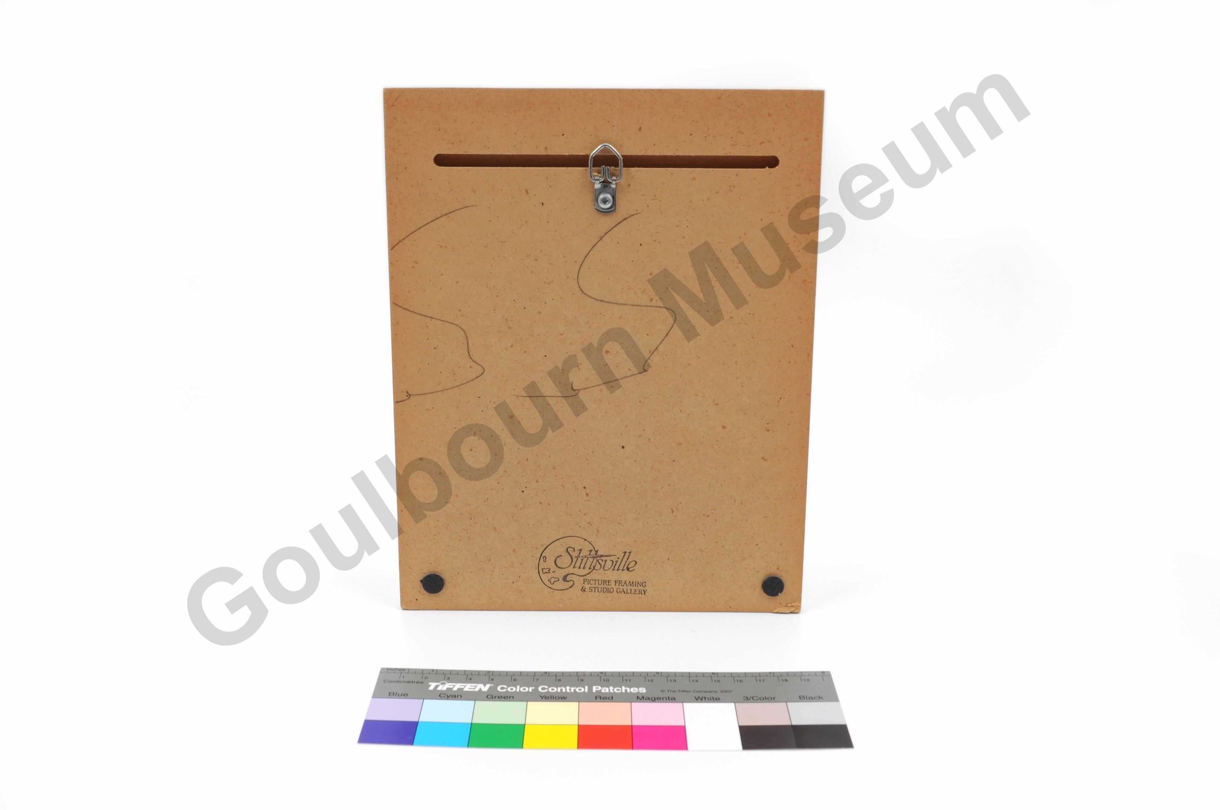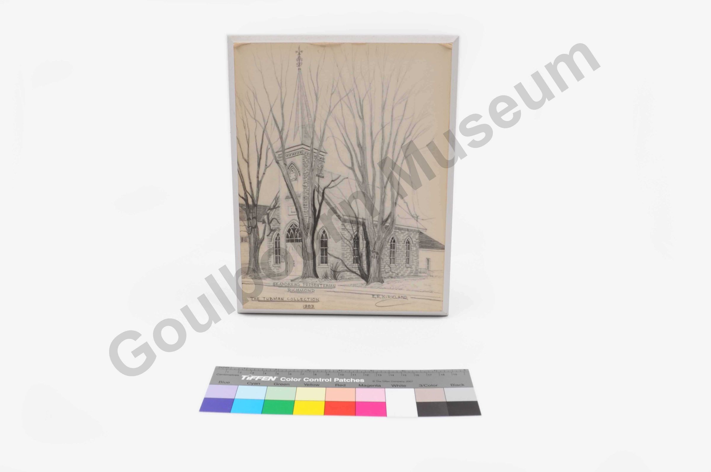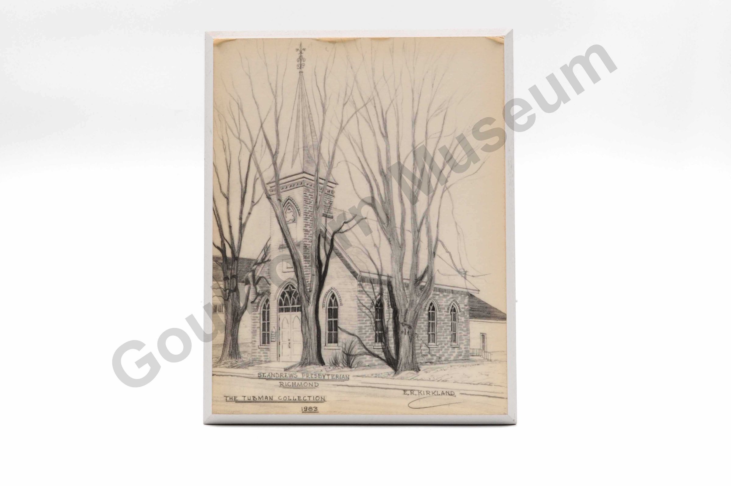 This rectangular shaped art print is a black and white coloured pen and ink sketch of a church building that is adhered to a wooden backing. At the bottom of the sketch are the words, from left to right, reading; "The Tubman Collection 1983." "St. Andrews Presbyterian Richmond." "E.R. Kirkland." On the reversed side of the item is a carved slot for hanging the item on a wall or surface. In the centre of this slot is a metal loop. Under this are the letters, S.S. written in pencil on the wooden backing. At the bottom edge, in the centre, is a black stamped manufactures mark tat reads; "Stittsville picture framing & studio gallery". In the two bottom corners are buffers to protect either the item or the wall from hanging.Artwork Details
