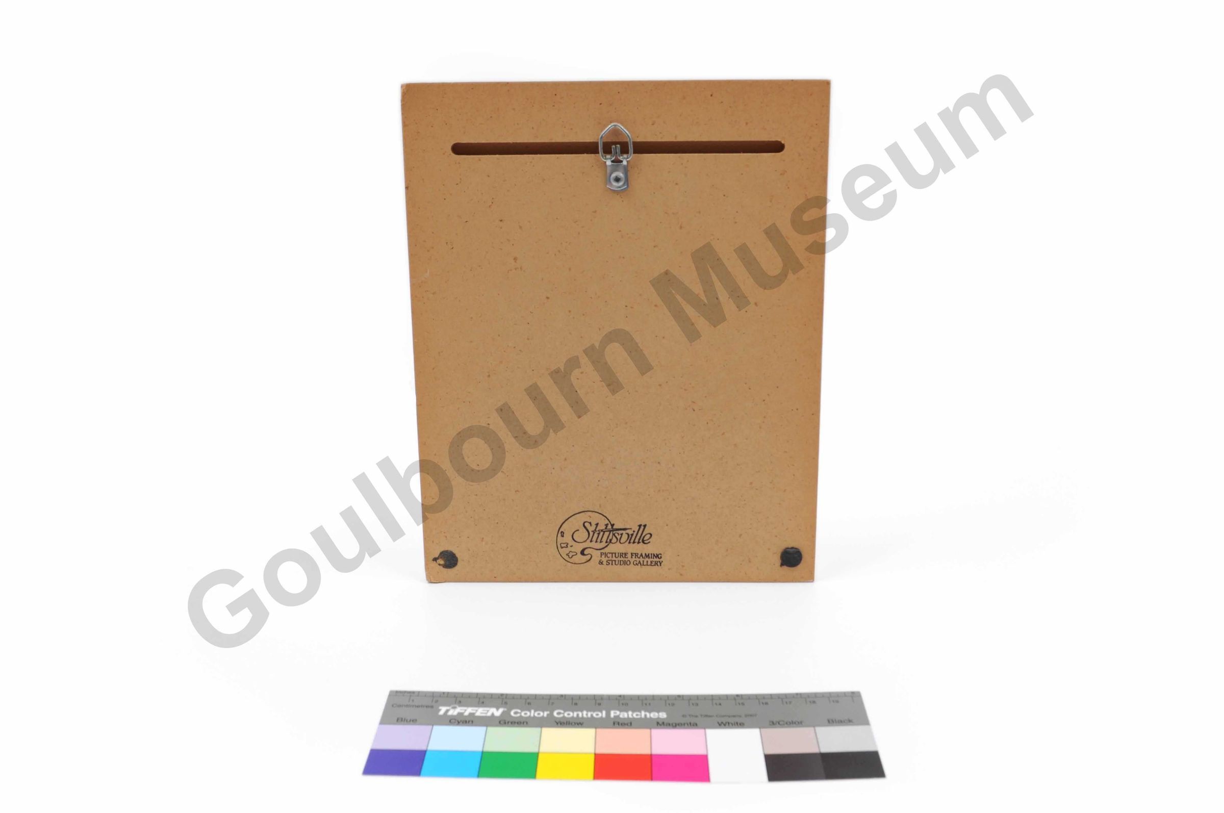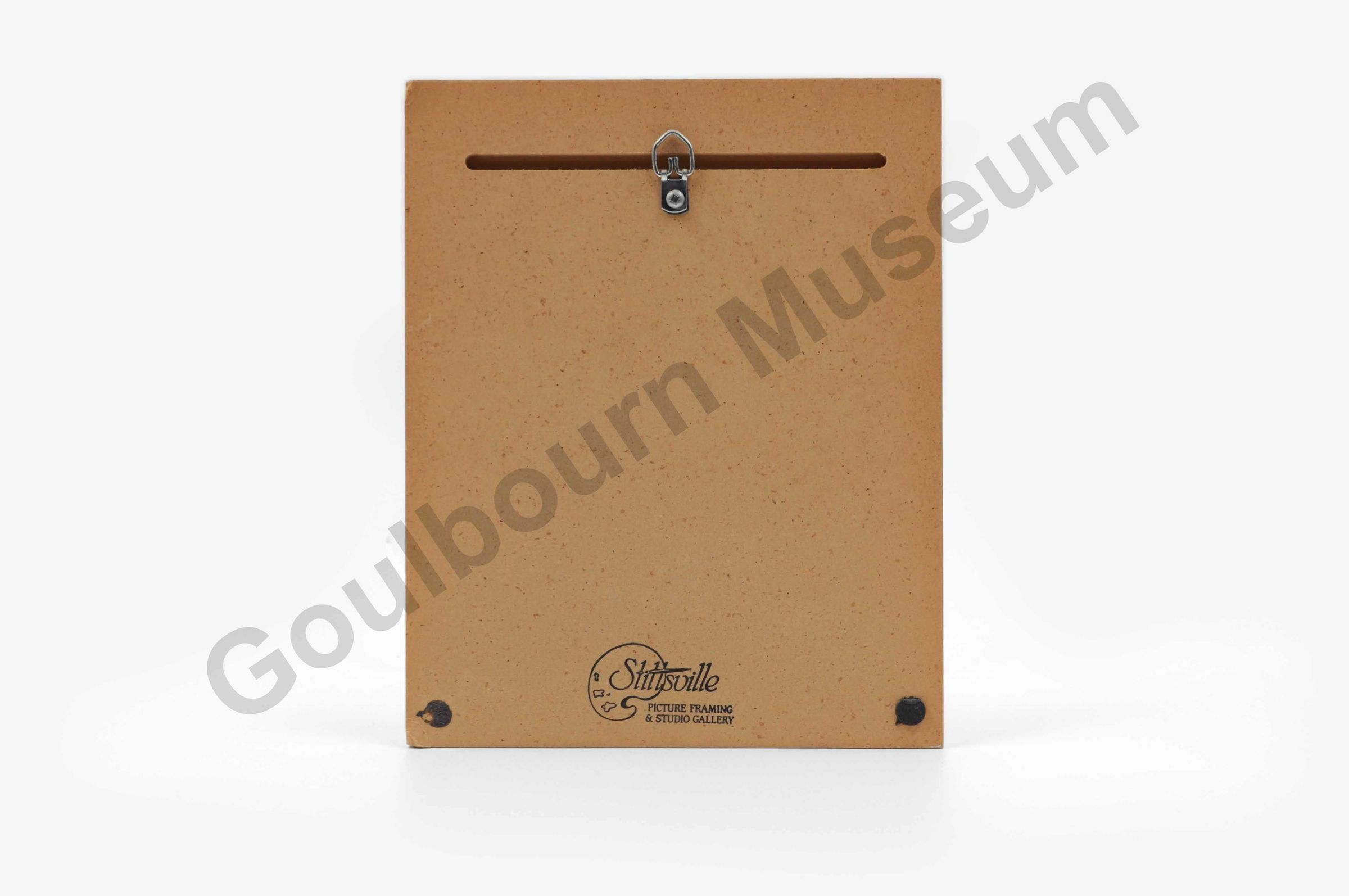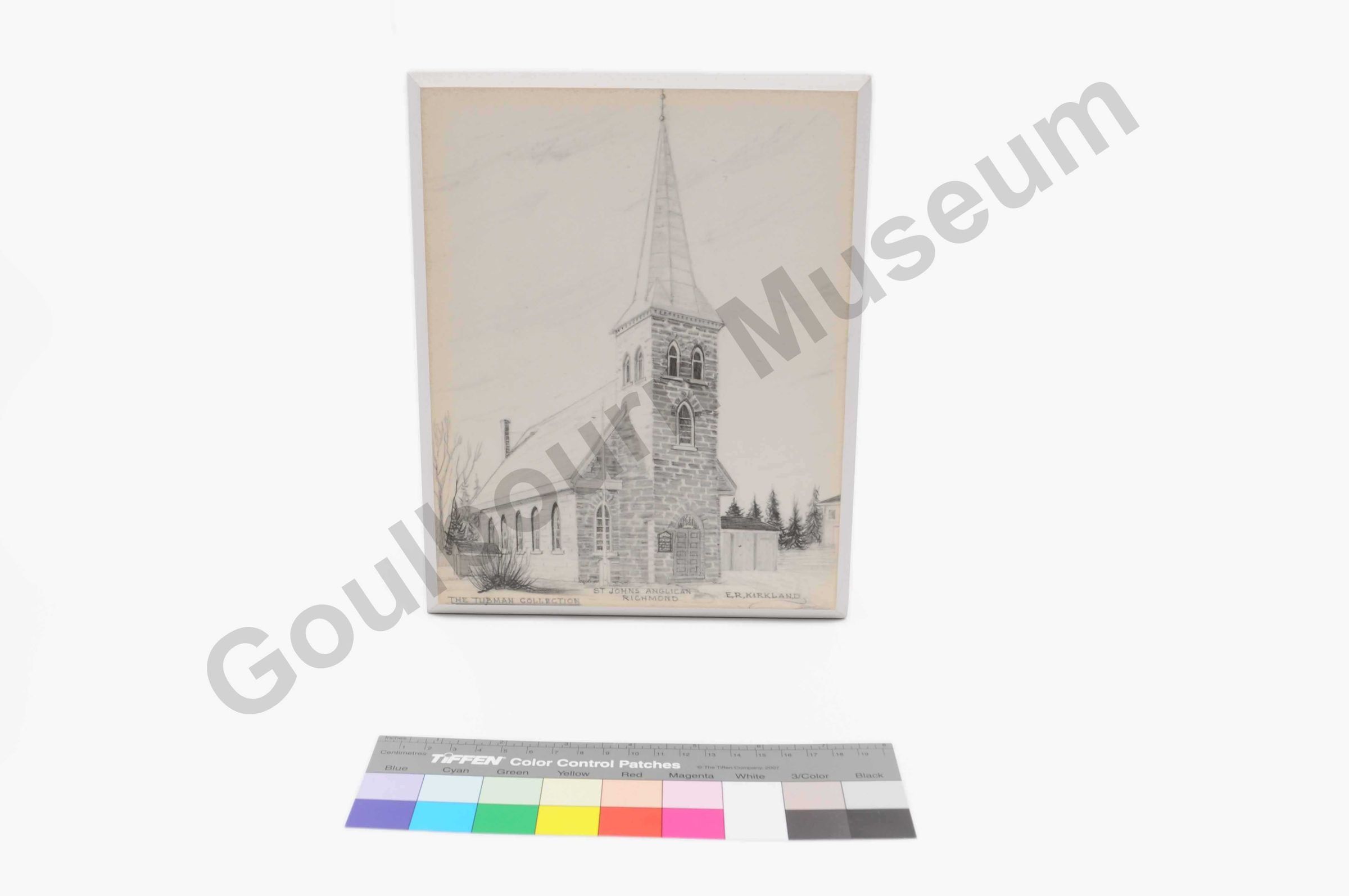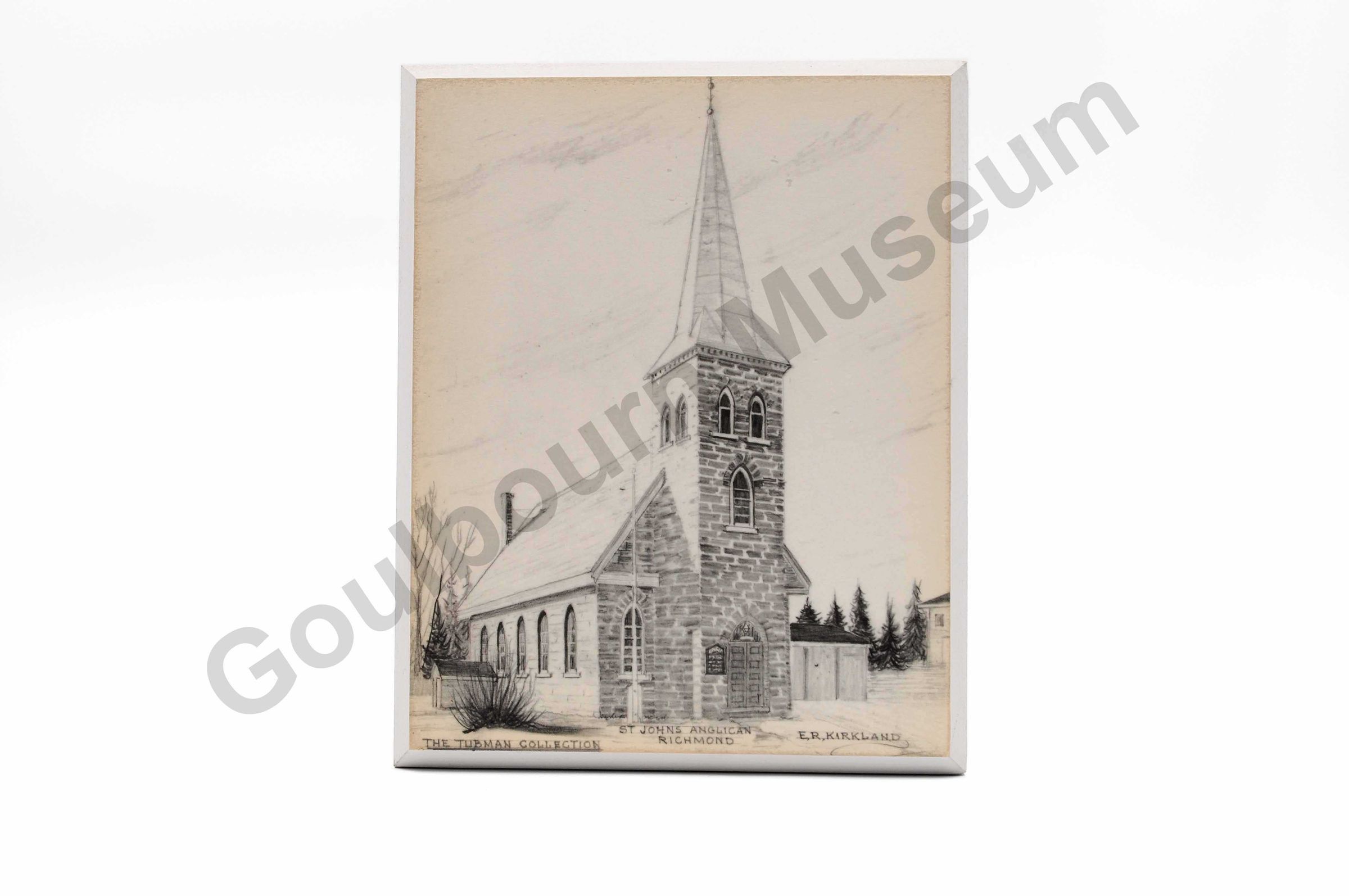 This rectangular shaped art print is a black and white coloured pen and ink sketch of a church building, adhered to a wood backing. Along the bottom edge of the image are the words, from left to right: "The Tubman Collection." "St Johns Anglican Richmond" "E.R.Kirkland". On the reversed side of the item is a carved slot for hanging the item against the wall. In the centre of this slot is a metal loop. Along the bottom edge, in the center, is a black stamp manufactures mark that reads; "Stittsville picture framing & studio gallery."Artwork Details