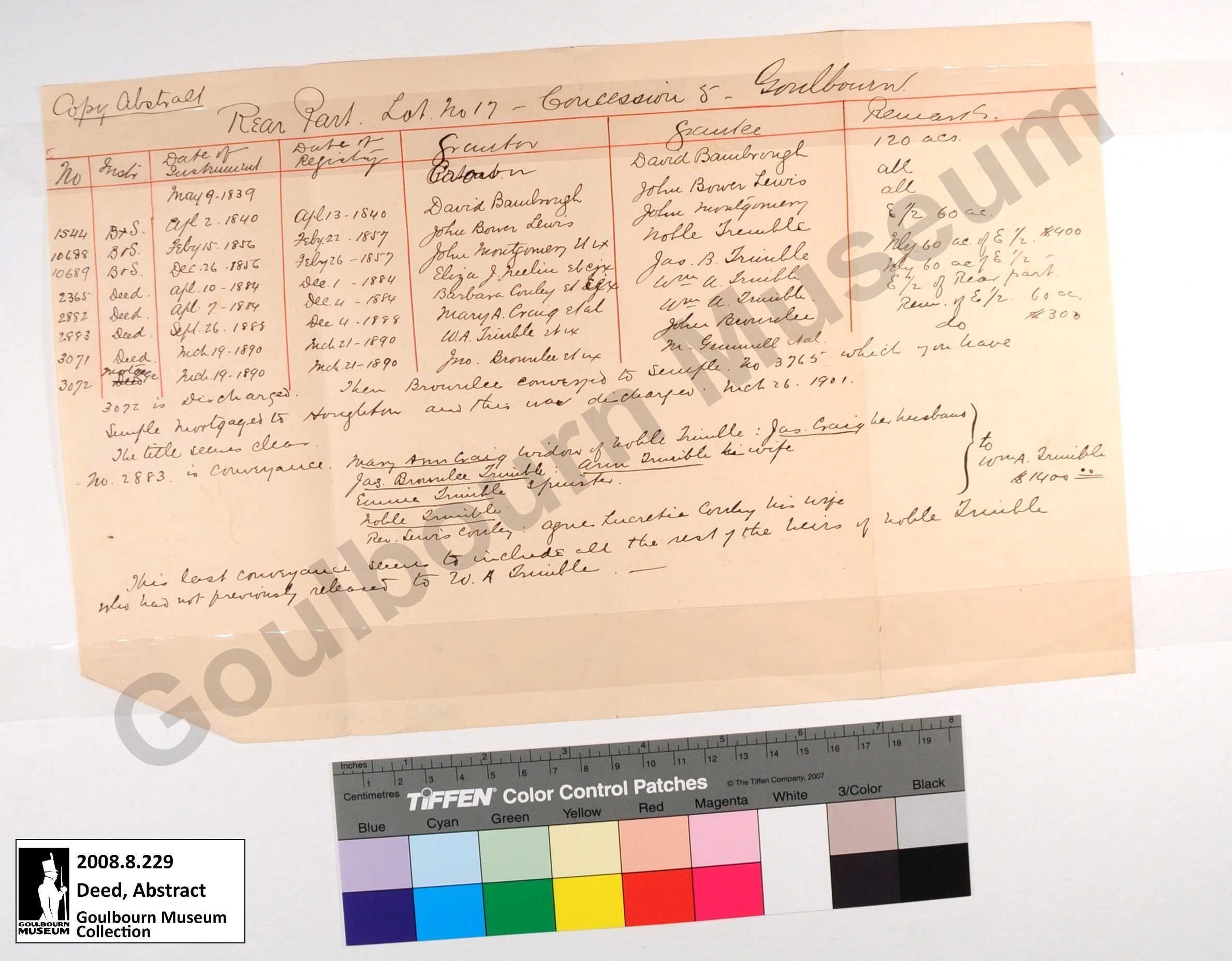 The artefact is an abstract describing property ownership in Goulbourn Township. It specifically documents Concession 5, Lot 17, rear portion and its uses and ownership.Collection