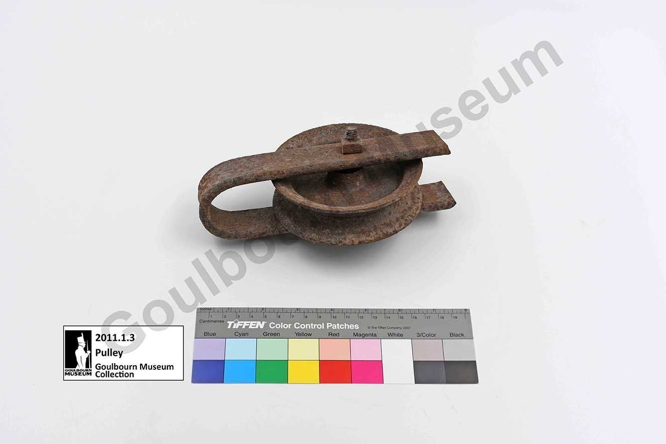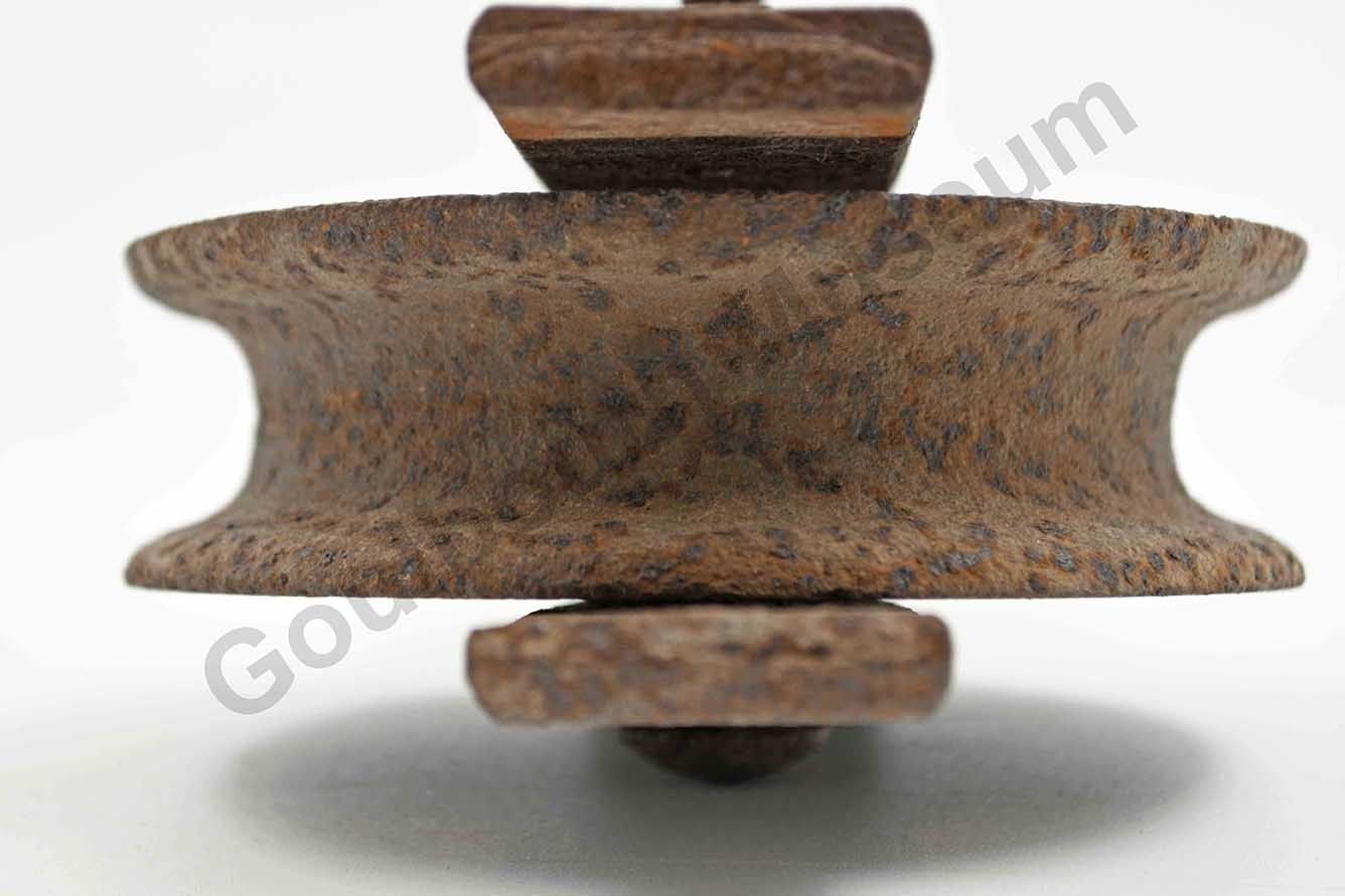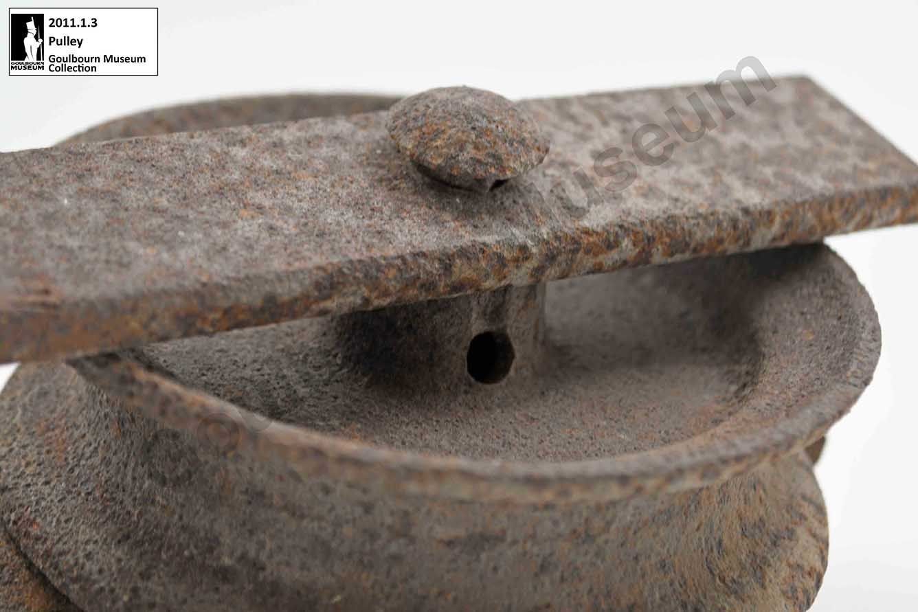 One small iron pulley attached to an iron bar. The iron bar is bent into a U-shape to attach to both sides of the pulley. The pulley is connected to the bar with a nut and bolt.Context