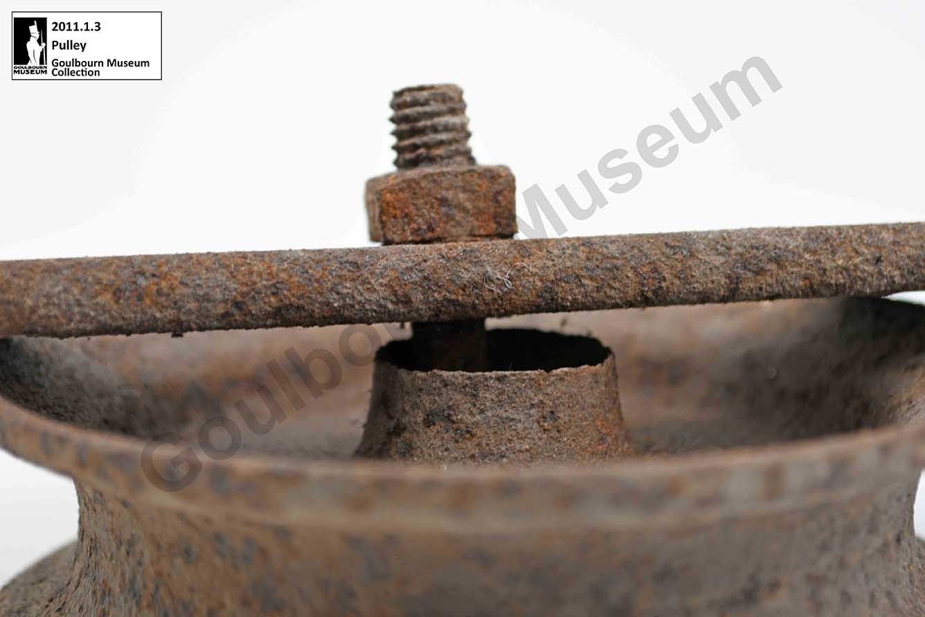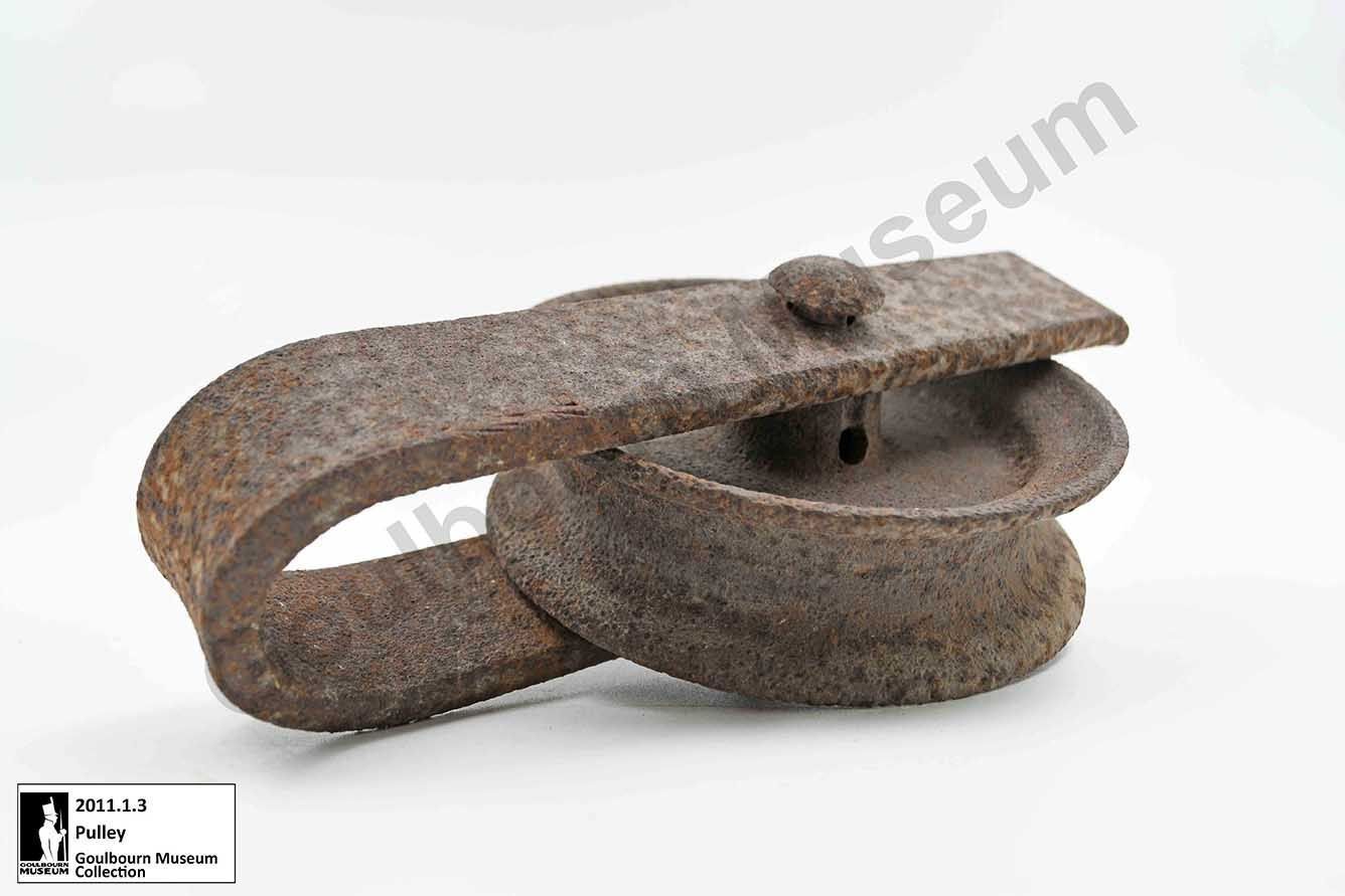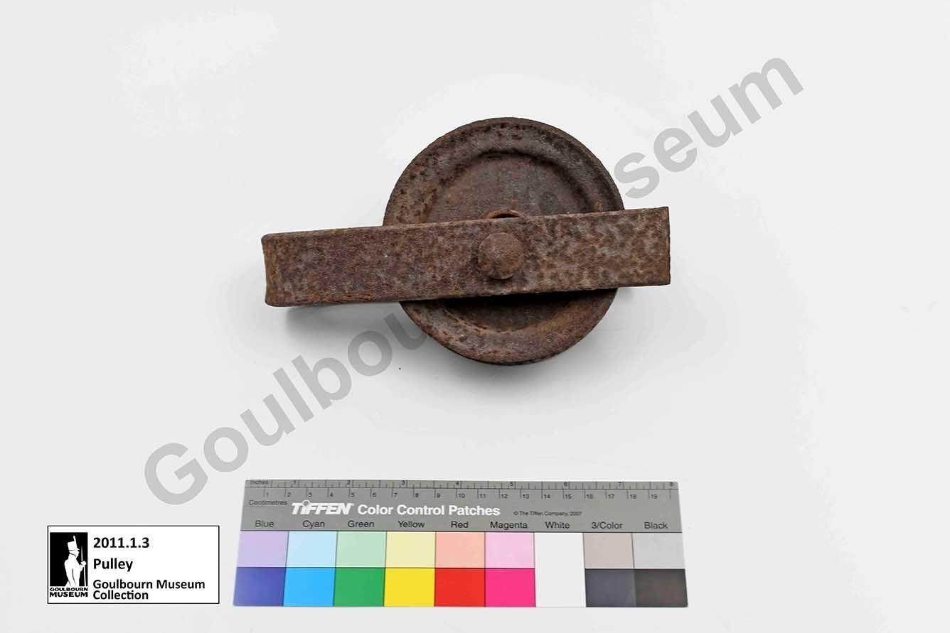 One small iron pulley attached to an iron bar. The iron bar is bent into a U-shape to attach to both sides of the pulley. The pulley is connected to the bar with a nut and bolt.Context