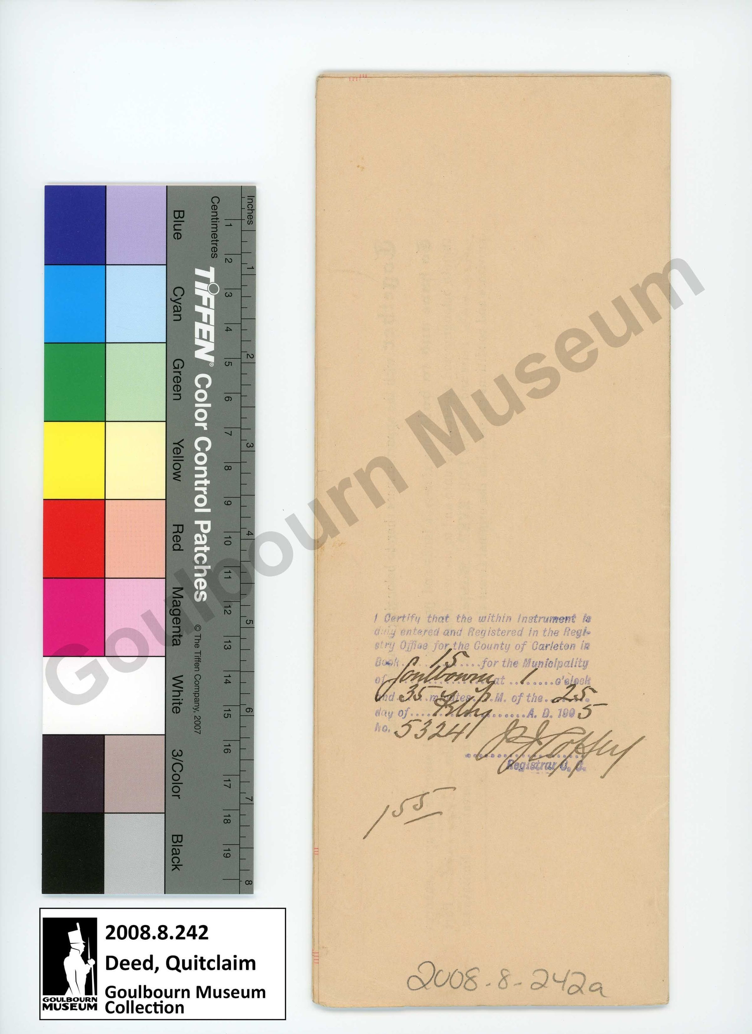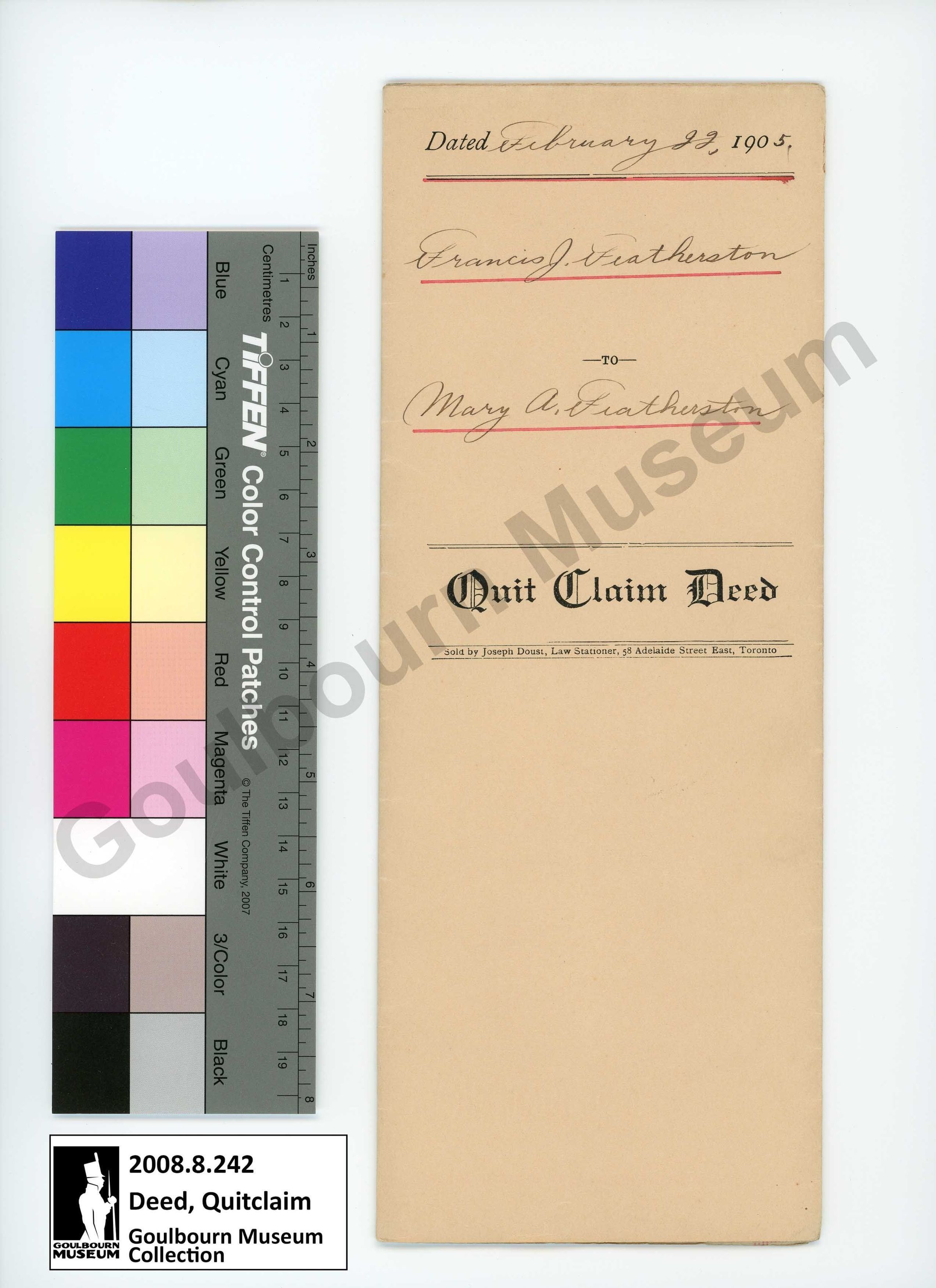 The artifact is a copy of a Quit Claim Deed between Francis J. Featherston and Mary A. Featherston. The front cover reads, "Dated February 22nd, 1905. Francis J. Featherston to Mary A. Featherston. Quit Claim Deed. Sold by Joseph Doust, Law Stationer, 58 Adelaide Street East, Toronto". The reverse reads, "I certify that the within instrument is duly entered and registered in the registry office for the county of Carleton in book 15 for the municipality of Goulbourn at 1 o'clock and 35 minutes P.M. of the 25th day of February A.D. 1905 Number 5324 P.J. Coffey Registrar C.C."Collection