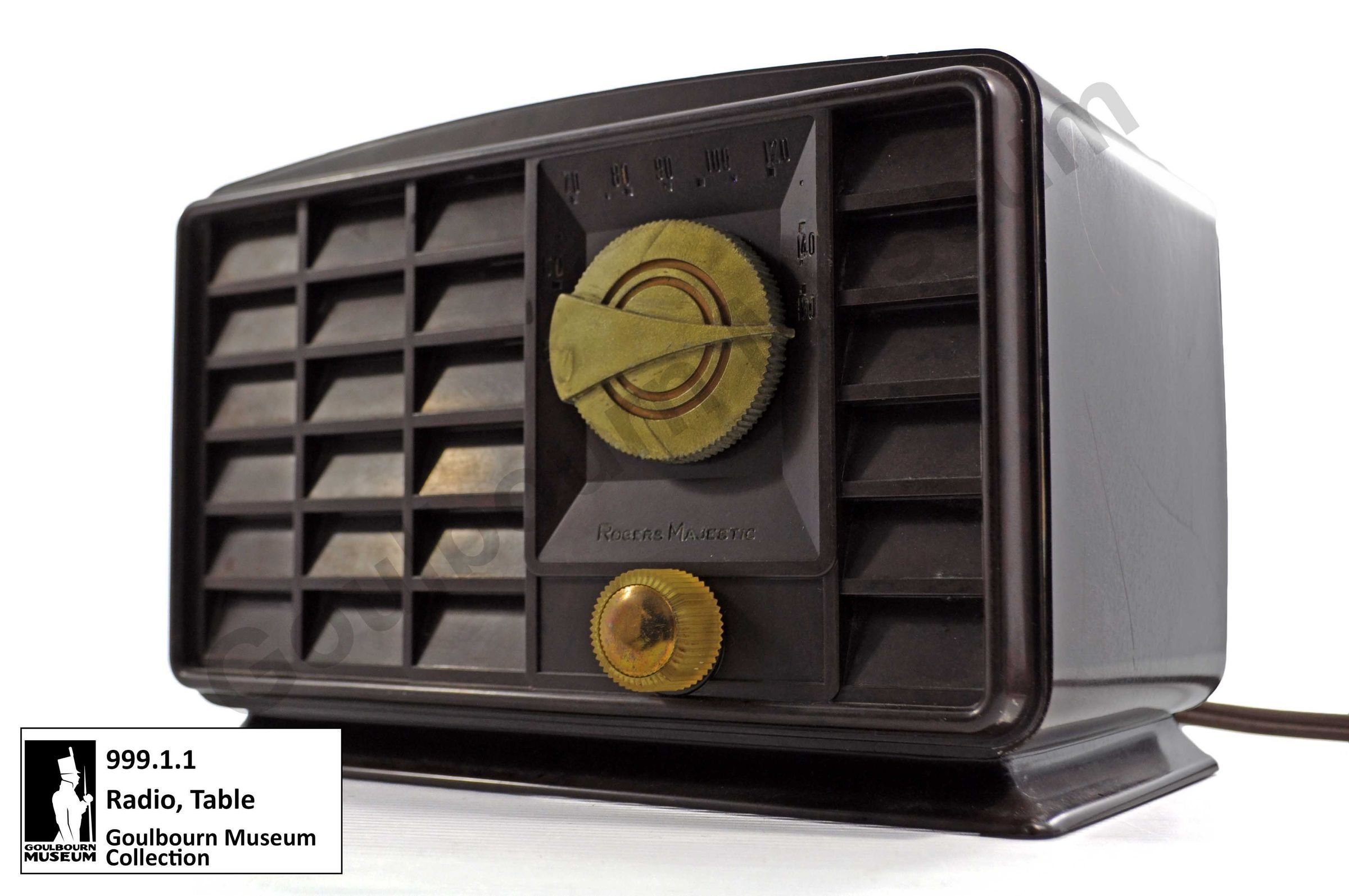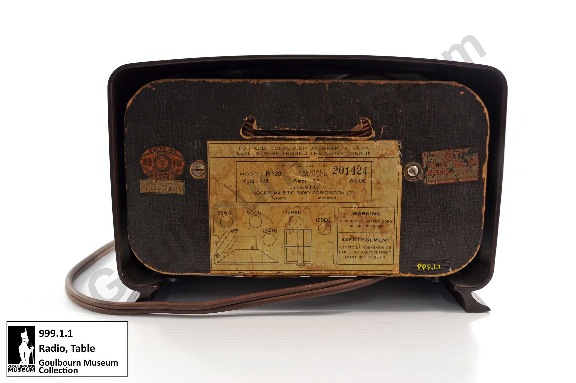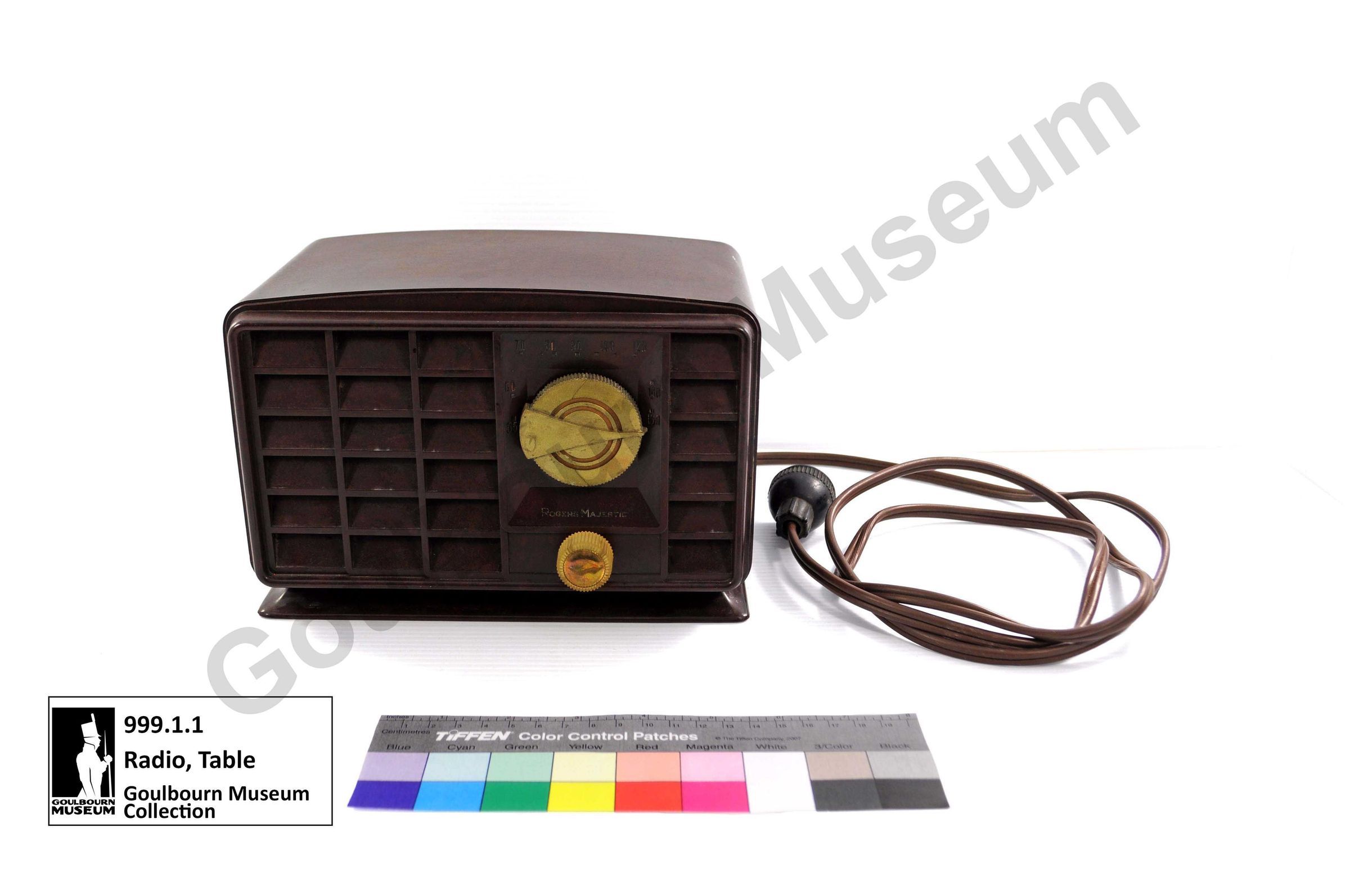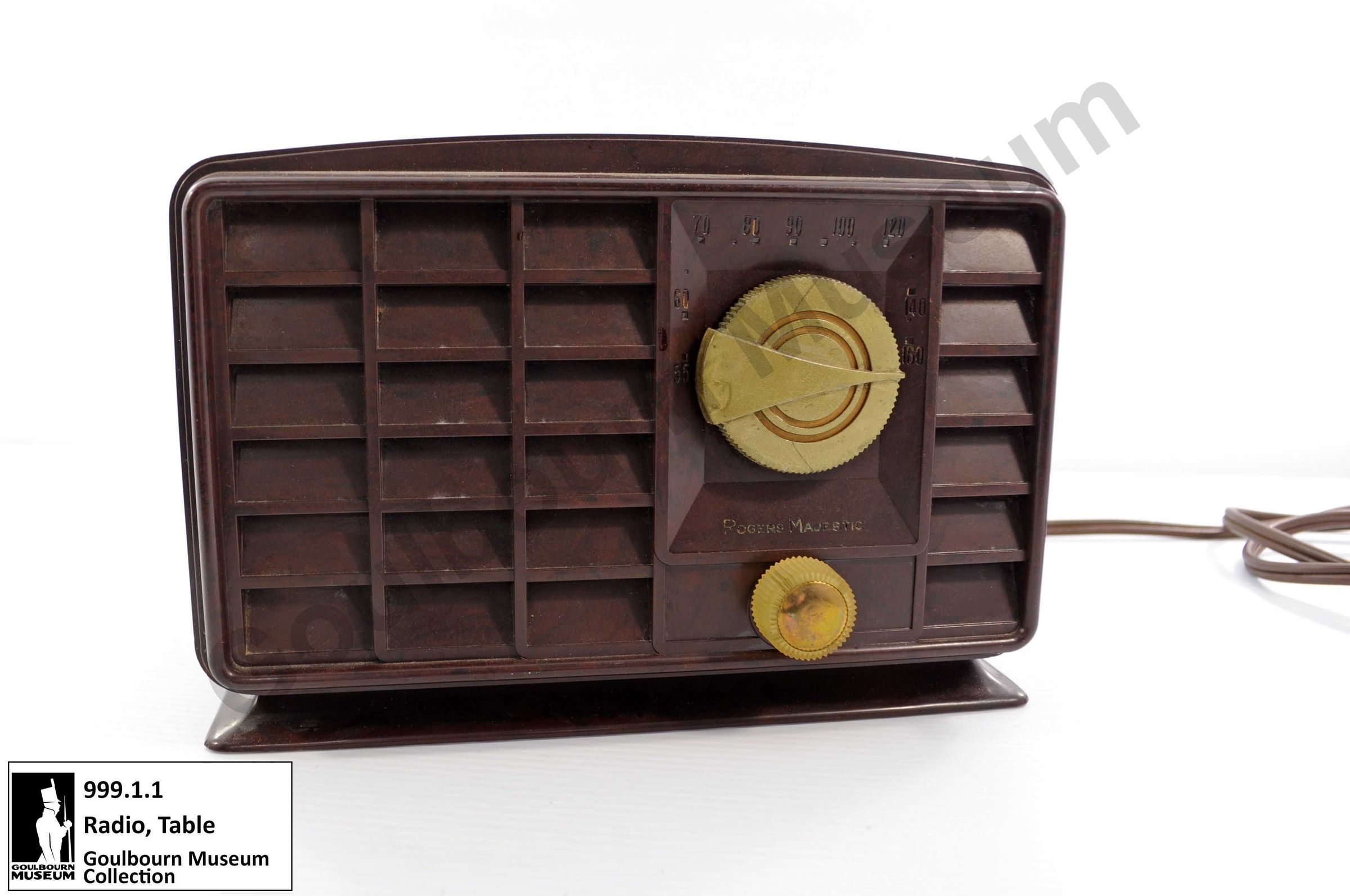 One brown coloured Roger's Majestic table radio, c. 1949 - 1950. The outside of the radio is made of a brown coloured plastic with two gold-yellow coloured plastic dials. The radio has an intact two-prong electrical plug and cord which attaches to the device in the back. The front of the radio has a repeating geometric rectangular pattern on the proper right half. The proper left has a vertical rectangle, inset with a square design displaying radio frequencies displayed in numerals from 50 on the proper right side to 150 on the proper left. A gold coloured plastic dial in the shape of a circle with a triangle in the centre is used to point to the radio frequency numbers. The name Rogers Majestic is engraved below the frequency dial on the front of the radio.