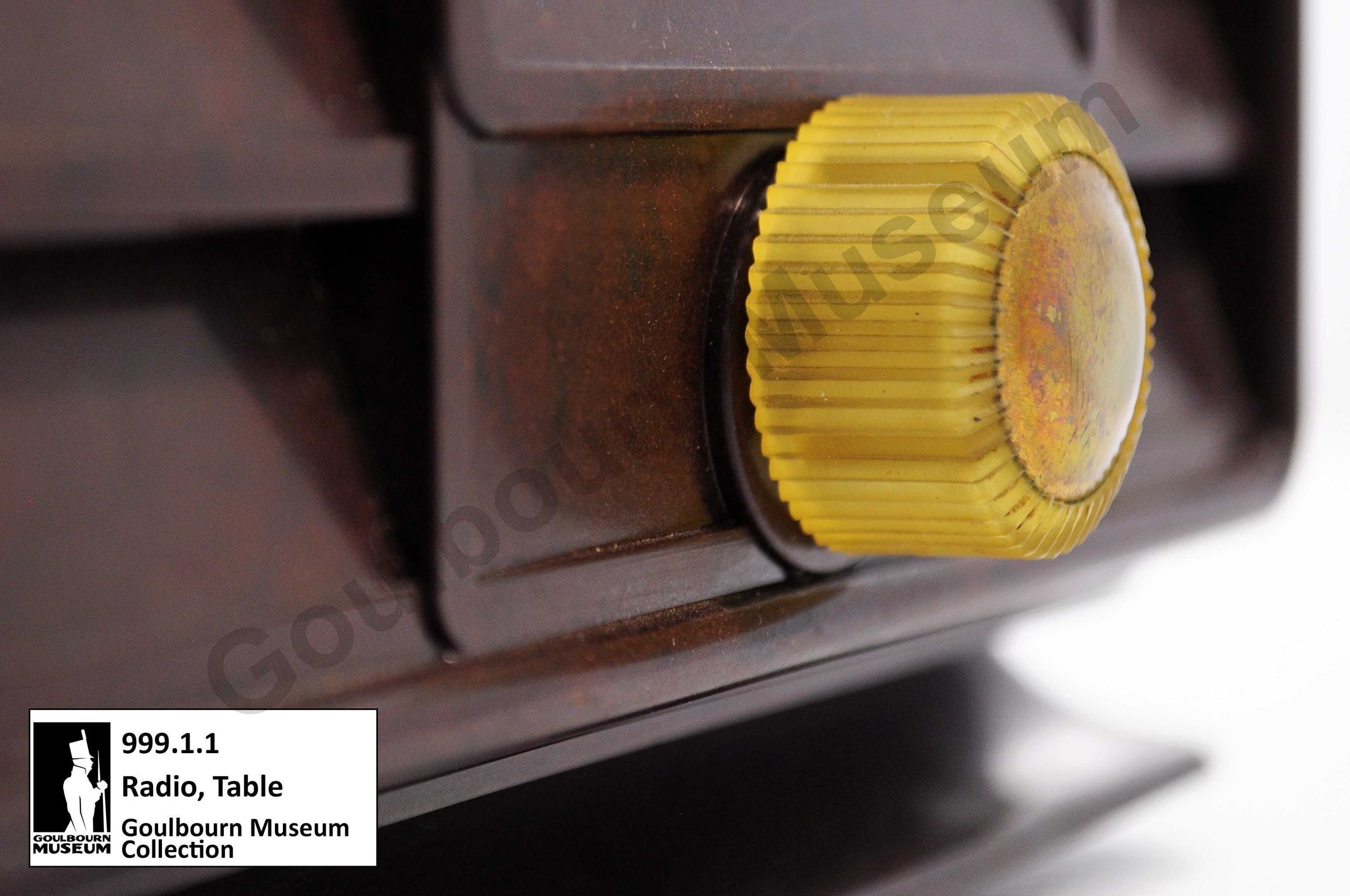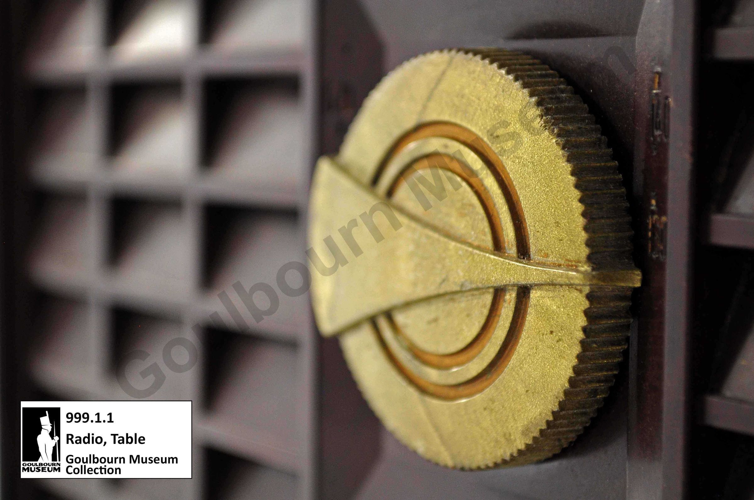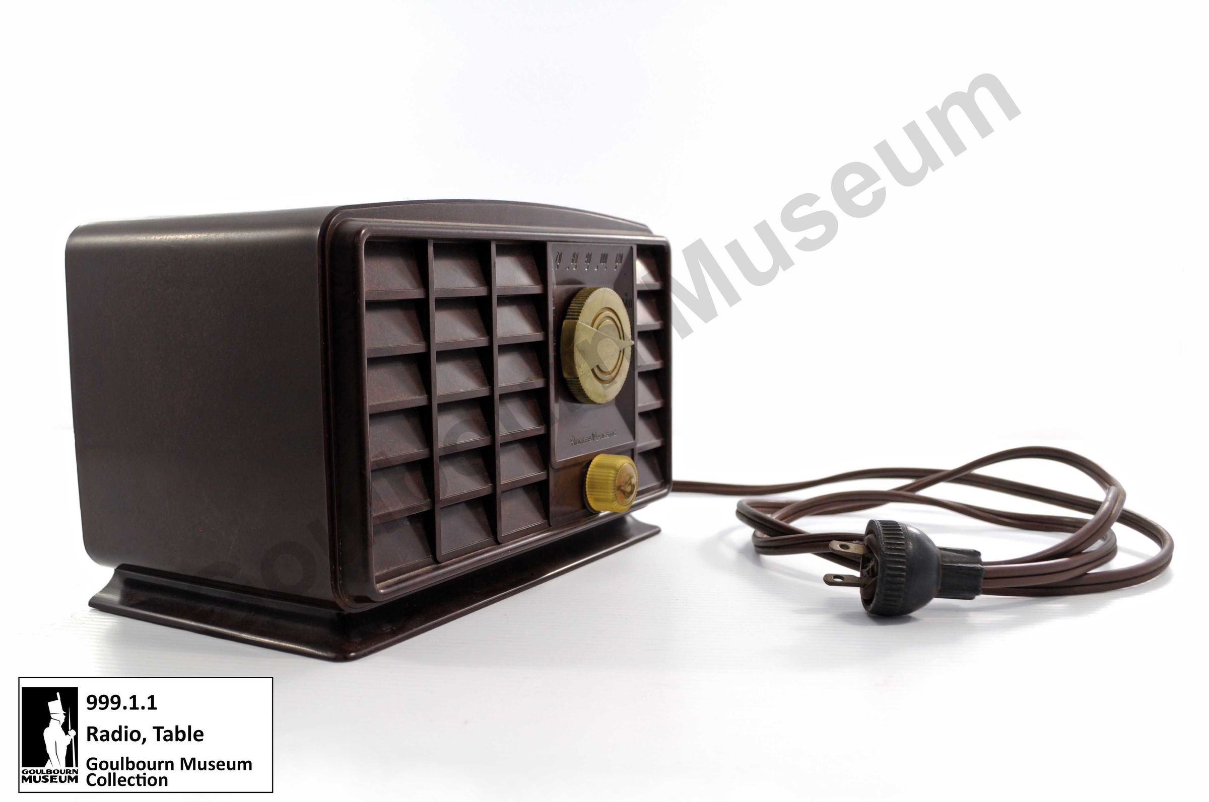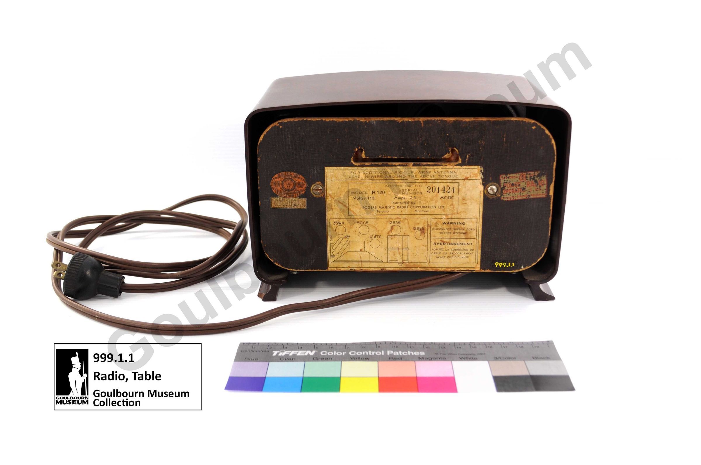 One brown coloured Roger's Majestic table radio, c. 1949 - 1950. The outside of the radio is made of a brown coloured plastic with two gold-yellow coloured plastic dials. The radio has an intact two-prong electrical plug and cord which attaches to the device in the back. The front of the radio has a repeating geometric rectangular pattern on the proper right half. The proper left has a vertical rectangle, inset with a square design displaying radio frequencies displayed in numerals from 50 on the proper right side to 150 on the proper left. A gold coloured plastic dial in the shape of a circle with a triangle in the centre is used to point to the radio frequency numbers. The name Rogers Majestic is engraved below the frequency dial on the front of the radio.