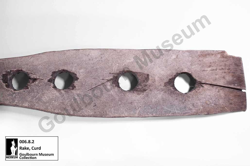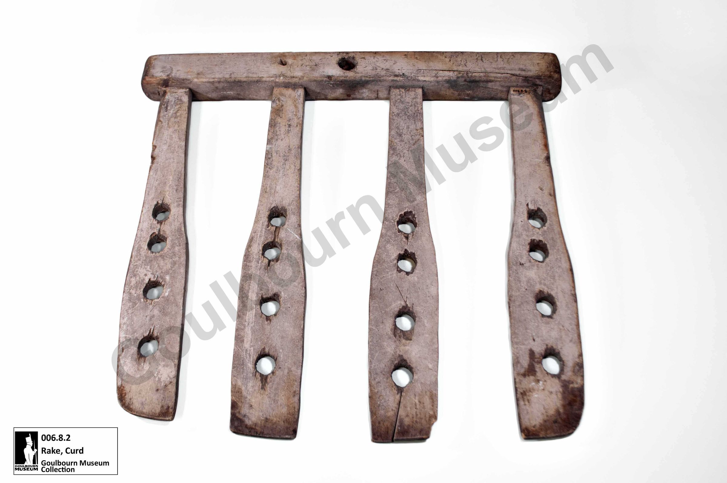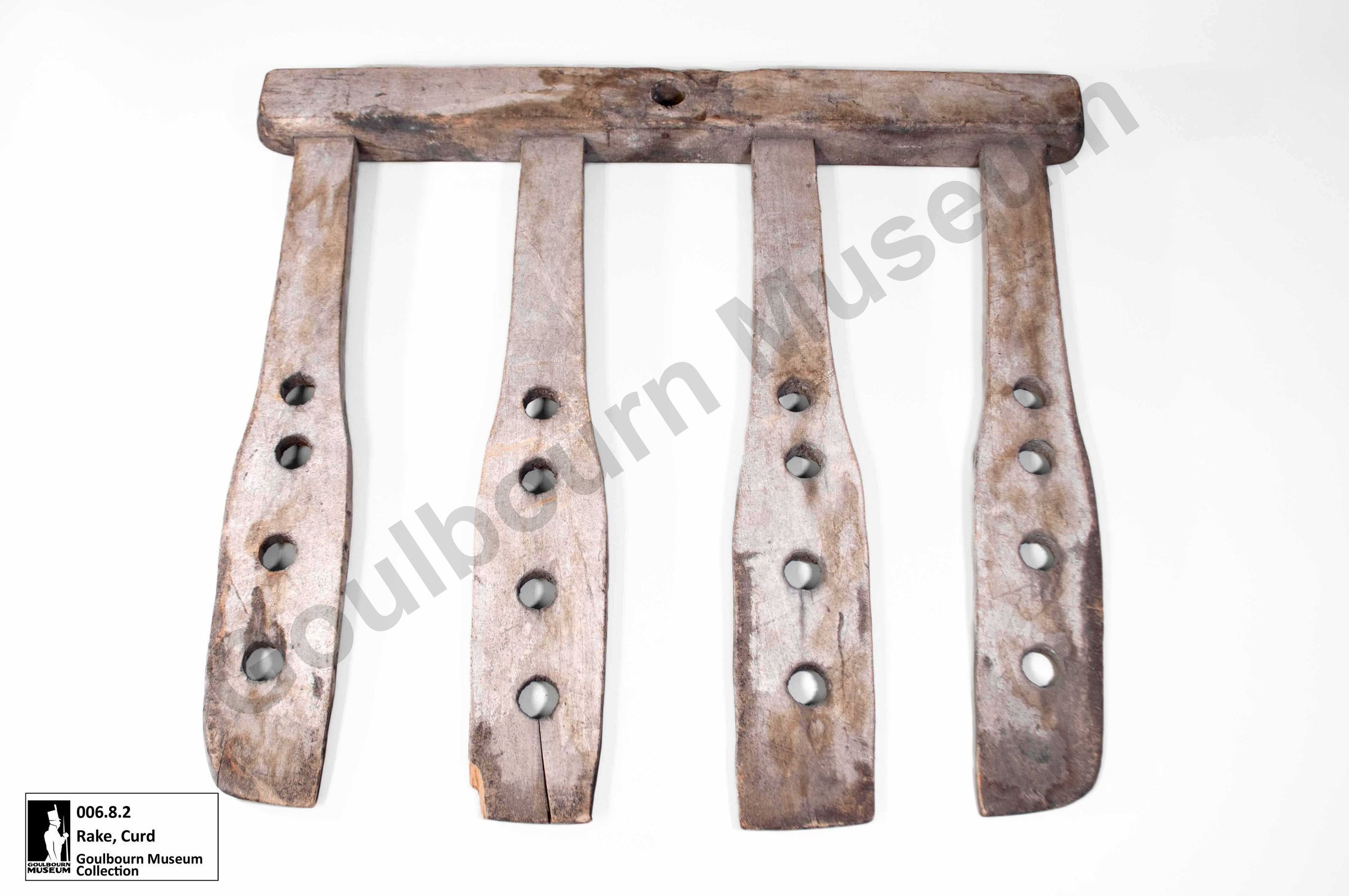 One wooden component of a wooden cheese rake. Head is preserved without the handle. The wooden take head is composed of a horizontal wooden board with four vertical paddles affixed to the bottom edge with equal space between the central paddles. Each of the paddles have circular openings removed from the centre of each piece of wood. The object was used to rake cheese curds during the heating, washing, and draining process of cheese making and was originally used at the Franktown Road cheese factory in Goulbourn Township.Context