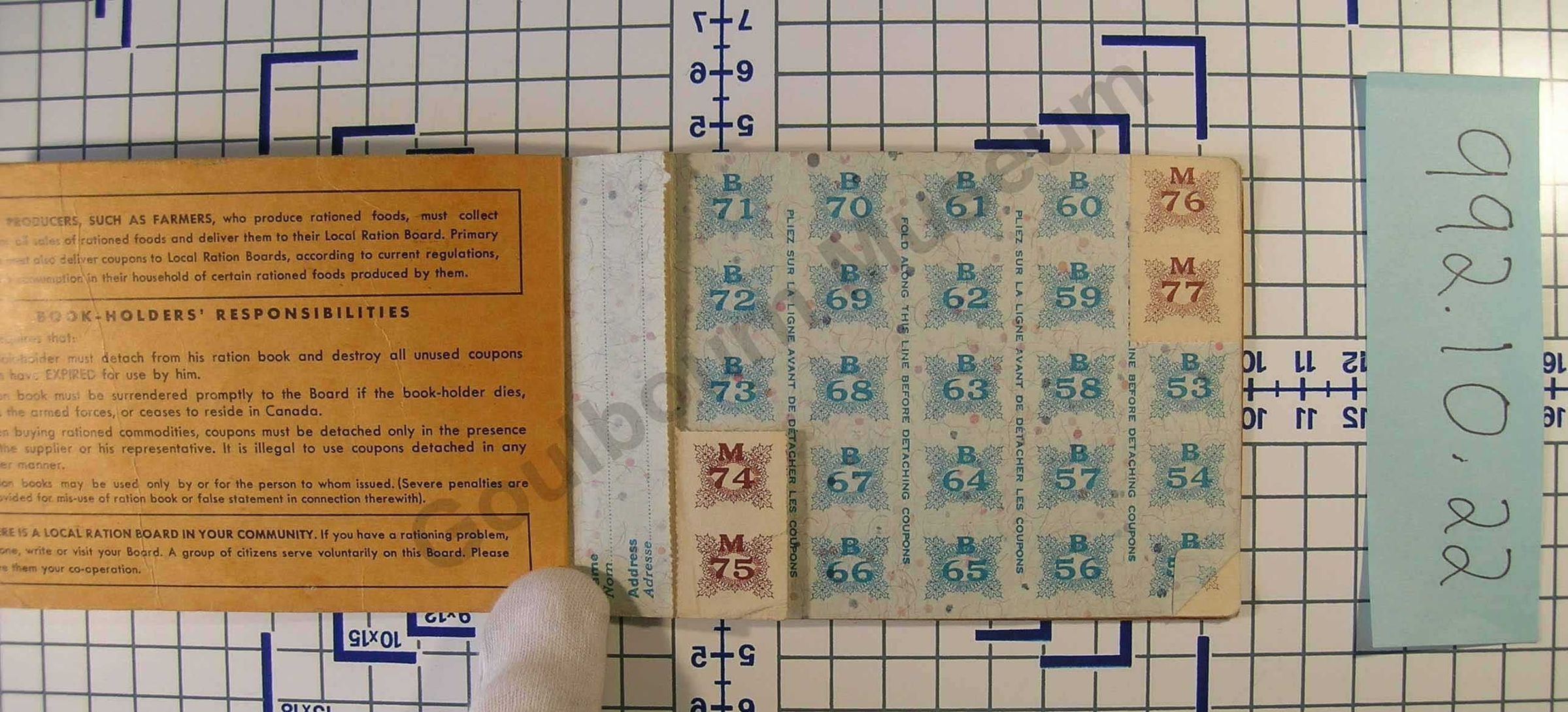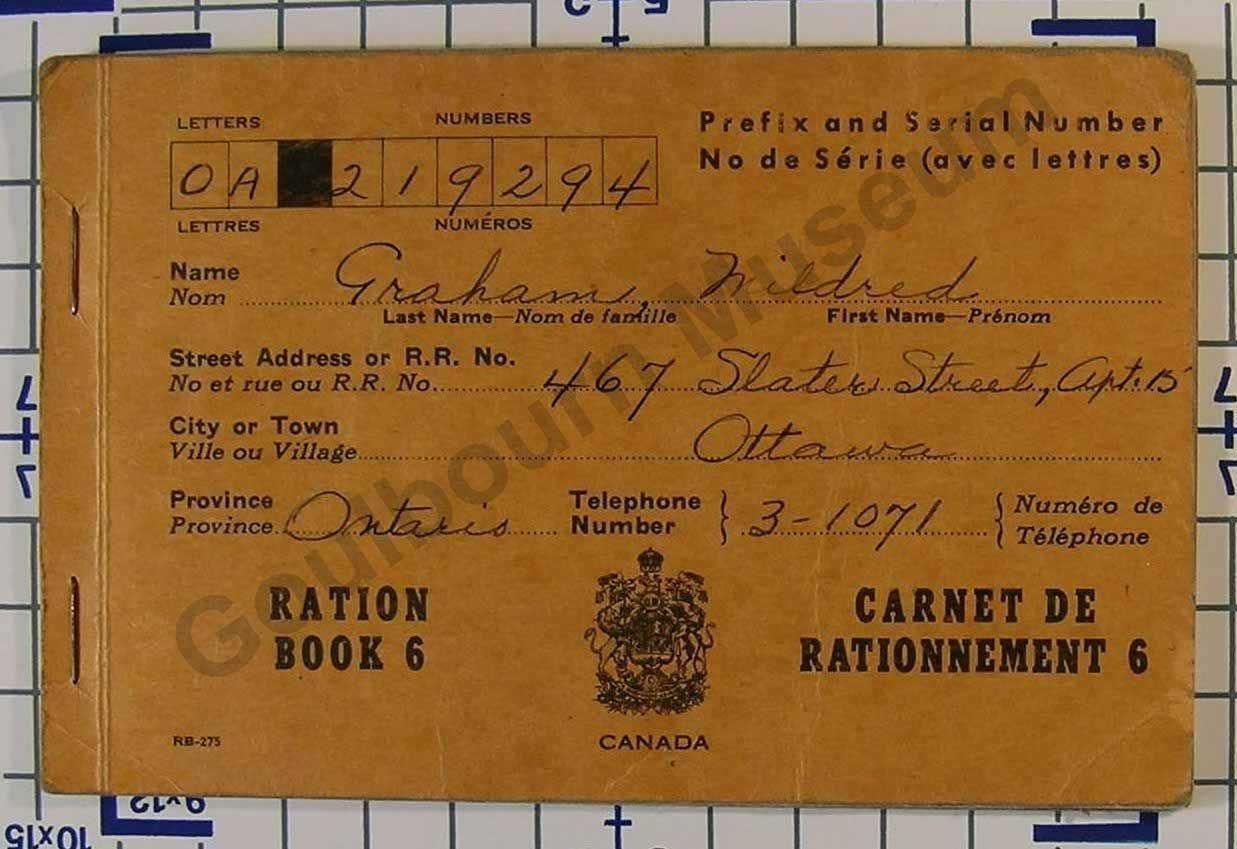 Book titled "Ration Book 6." Owner's details appear on front cover: Graham Mildred, 467 Slater St., Apt. 15, Ottawa, Ontario; serial number also appears on front cover: OA 219294. Issued by the Ration Administration, Wartime Prices and Trade Board, Box 250, Station B, Montreal.Lexicon