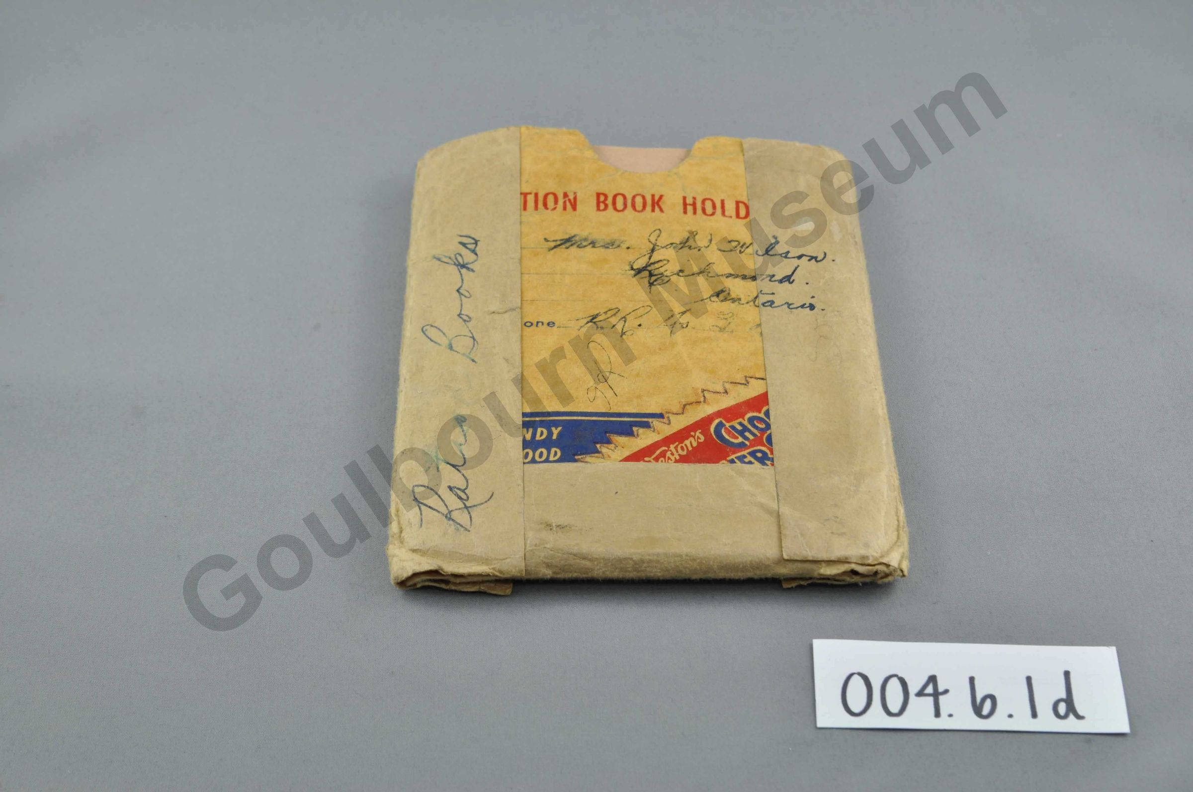 Ration book holder filled with six ration books; holder also contains two certificates from the Canada Registration Board, and one pamphlet entitled "Bayonet Fighting, Instruction with Service Rifle and Bayonet." The certificates from the Canada Registration Board are registered to Thomas Glasford Nesbitt of Richmond and Herbert Graham of Richmond; certificates are signed by deputy registrars Birtck and J.W. McCaffrey. "Mrs. John Wilson, Richmond, Ontario" is written on the outside of the holder in \n black ink.