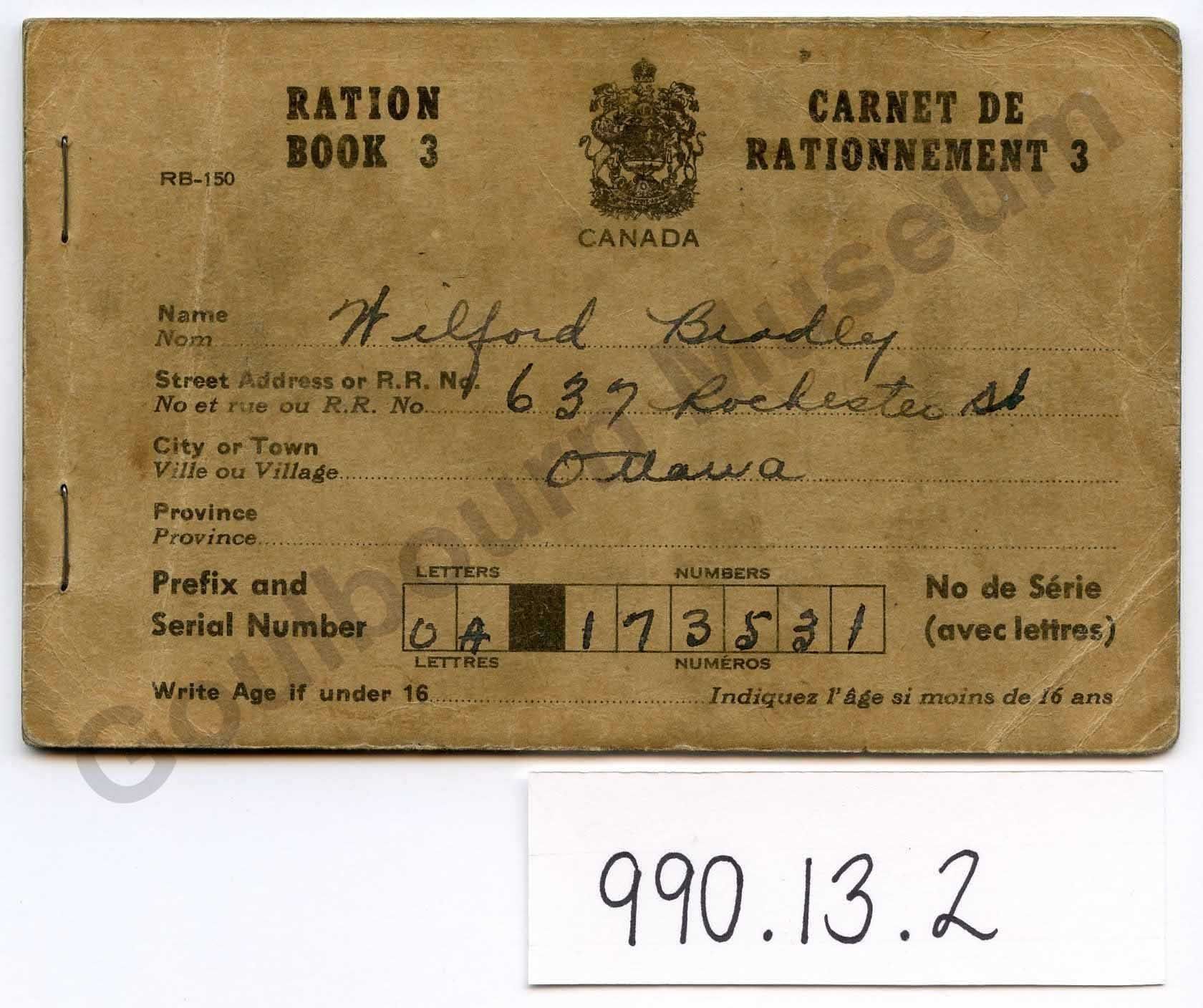 Book titled "Ration Book 3." The owner's details appear on the front cover: "Wilfred Bradley, 637 Rochester St., Ottawa." A serial number is written on the front cover in black ink: "OA 173531." A notice explaining rations appears on the inside of the front cover: "In wartime, goods are rationed because they are in short supply, or to prevent short supply caused by the selfish or unnecessary overbuying by some at the expense of others' essential needs. The utmost conservation of all supplies is necessary. You should regard this ration book as a permit to buy rationed goods if you NEED them-not otherwise. It does not entitle you to purchase rationed commodities for the use of someone else unless he resides in your household." Issued by the Ration Administration, Wartime Prices and Trade Board, a Canadian government agency established under the War Measures Act.
