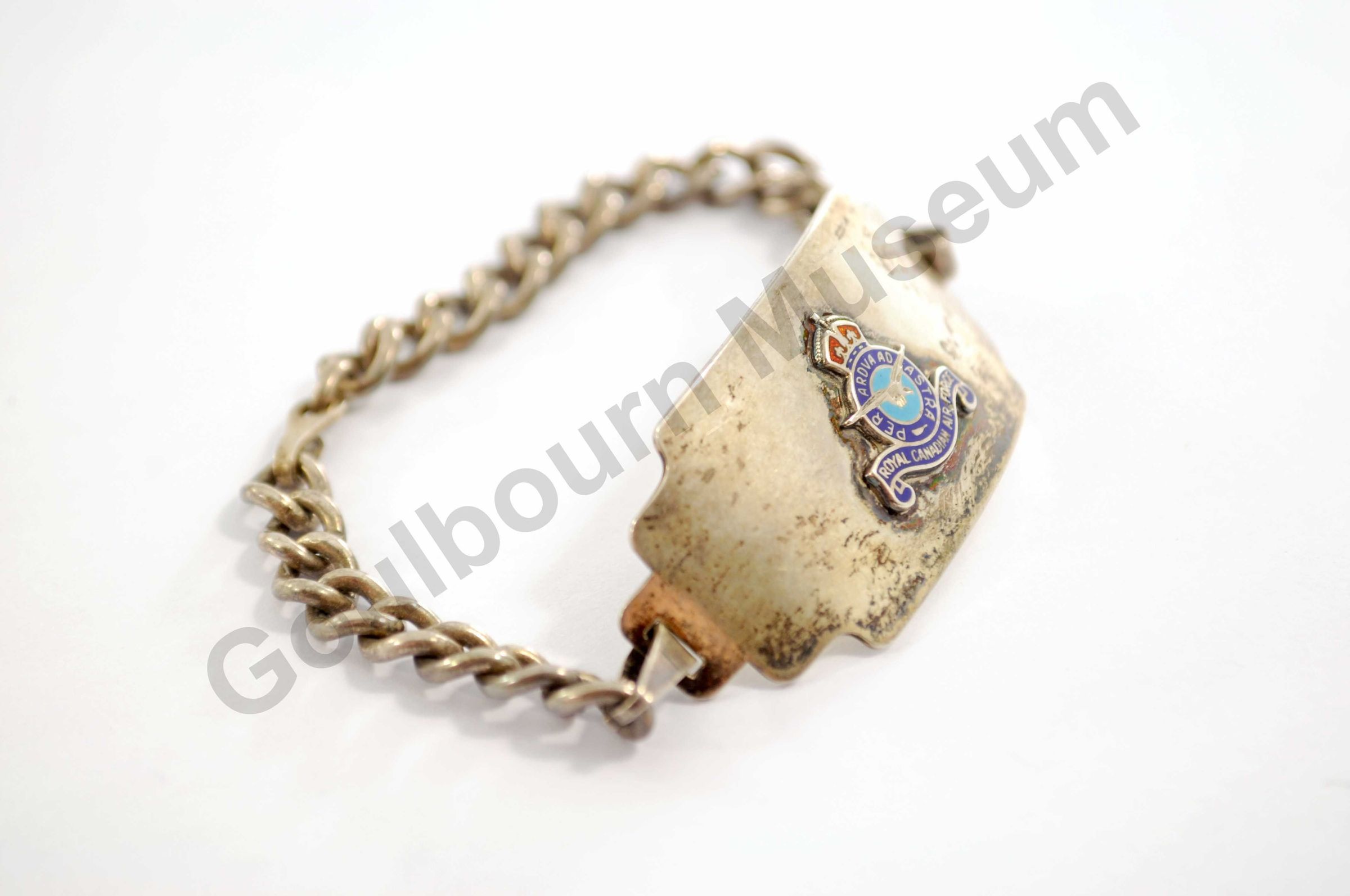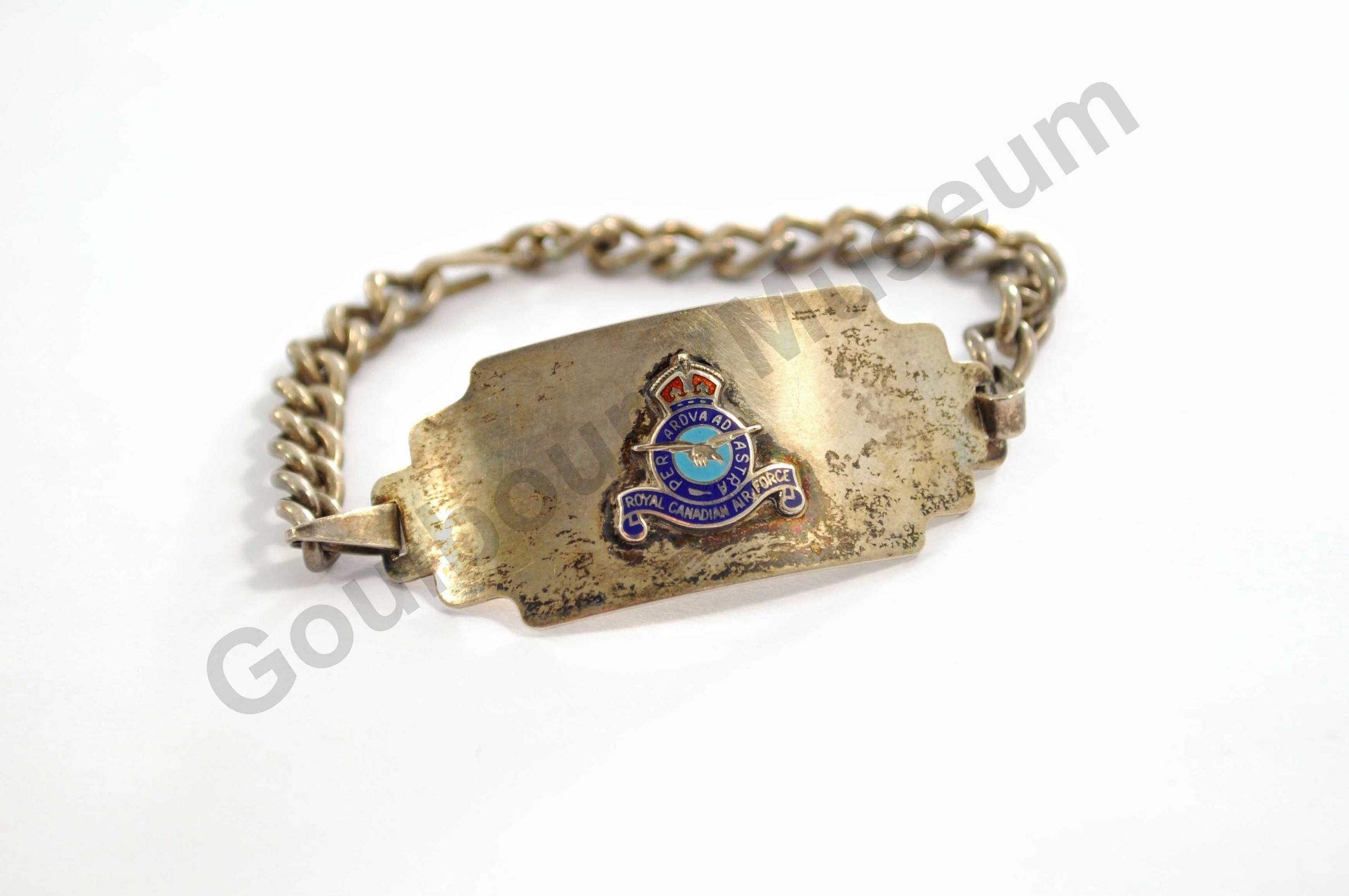 Sterling silver Royal Canadian Air Force bracelet. Bracelet consists of a cable chain and rectangular piece of silver with the RCAF emblem embossed on the front; on the reverse, four lines of etched text read: "TO CHARLIE FROM THE INSPECTOR'S BOARD GANG. 1.11.43."