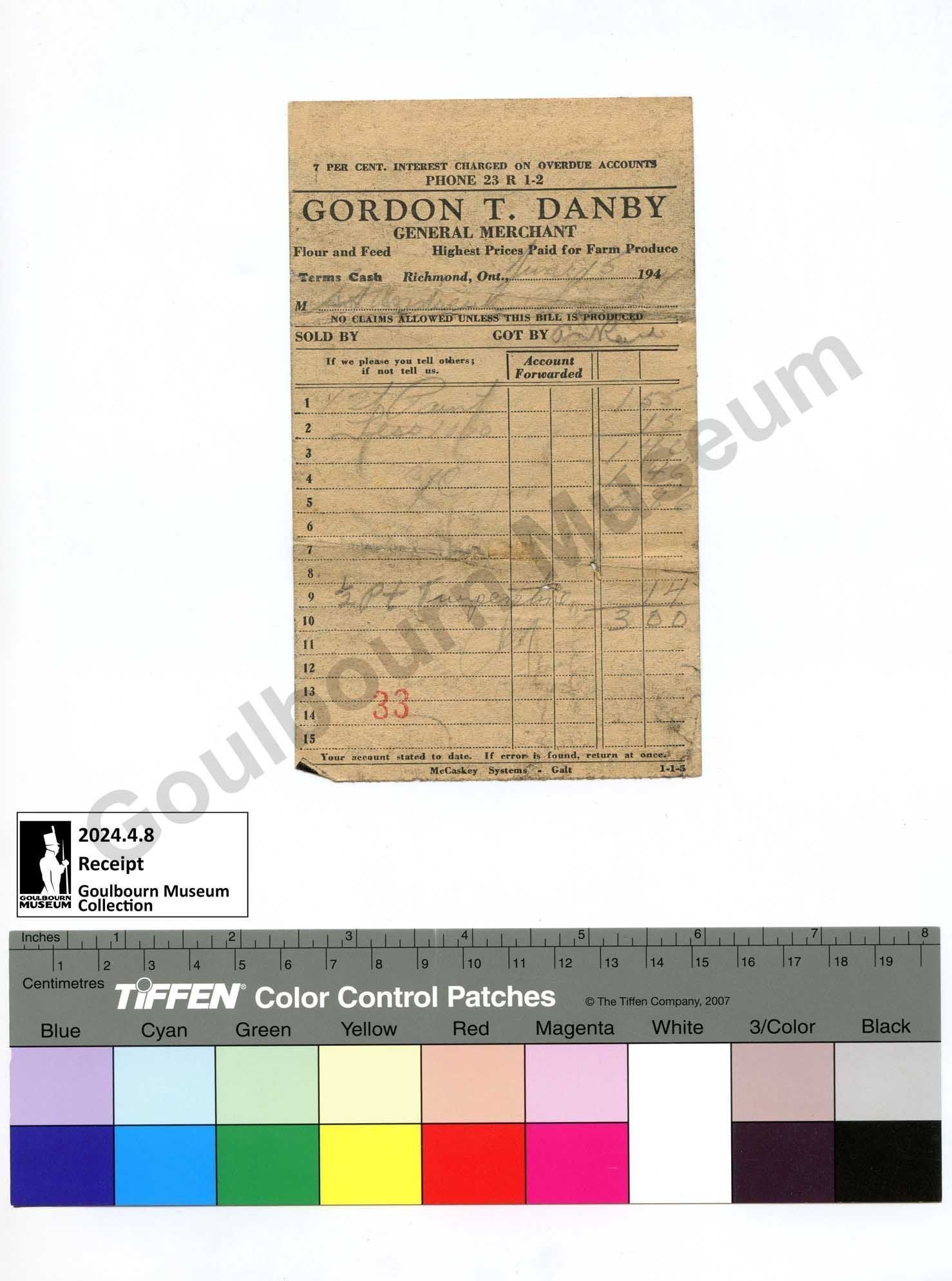 Receipt for supplies from Gordon T. Danby, General Merchant in Richmond Ontario. Relevant to local businesses in Goulbourn Township.Made/Created