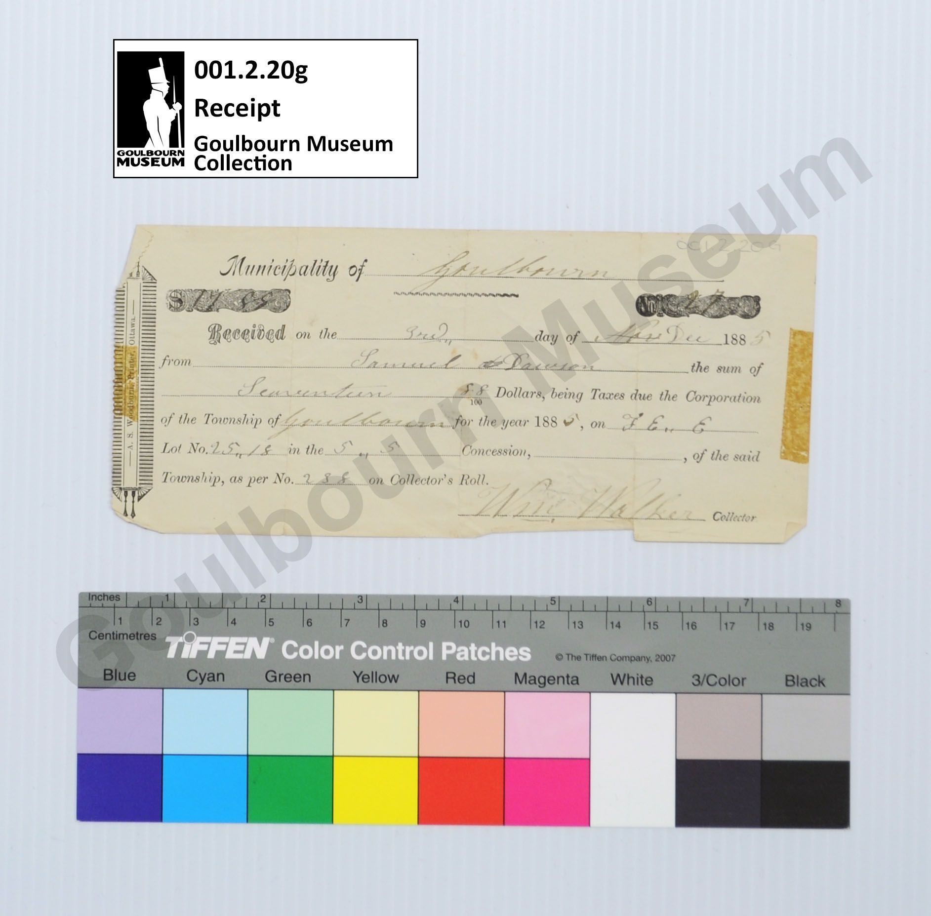 Receipt: Property Tax, Goulbourn Township, Samuel Dawson, 1885Entry/Object ID