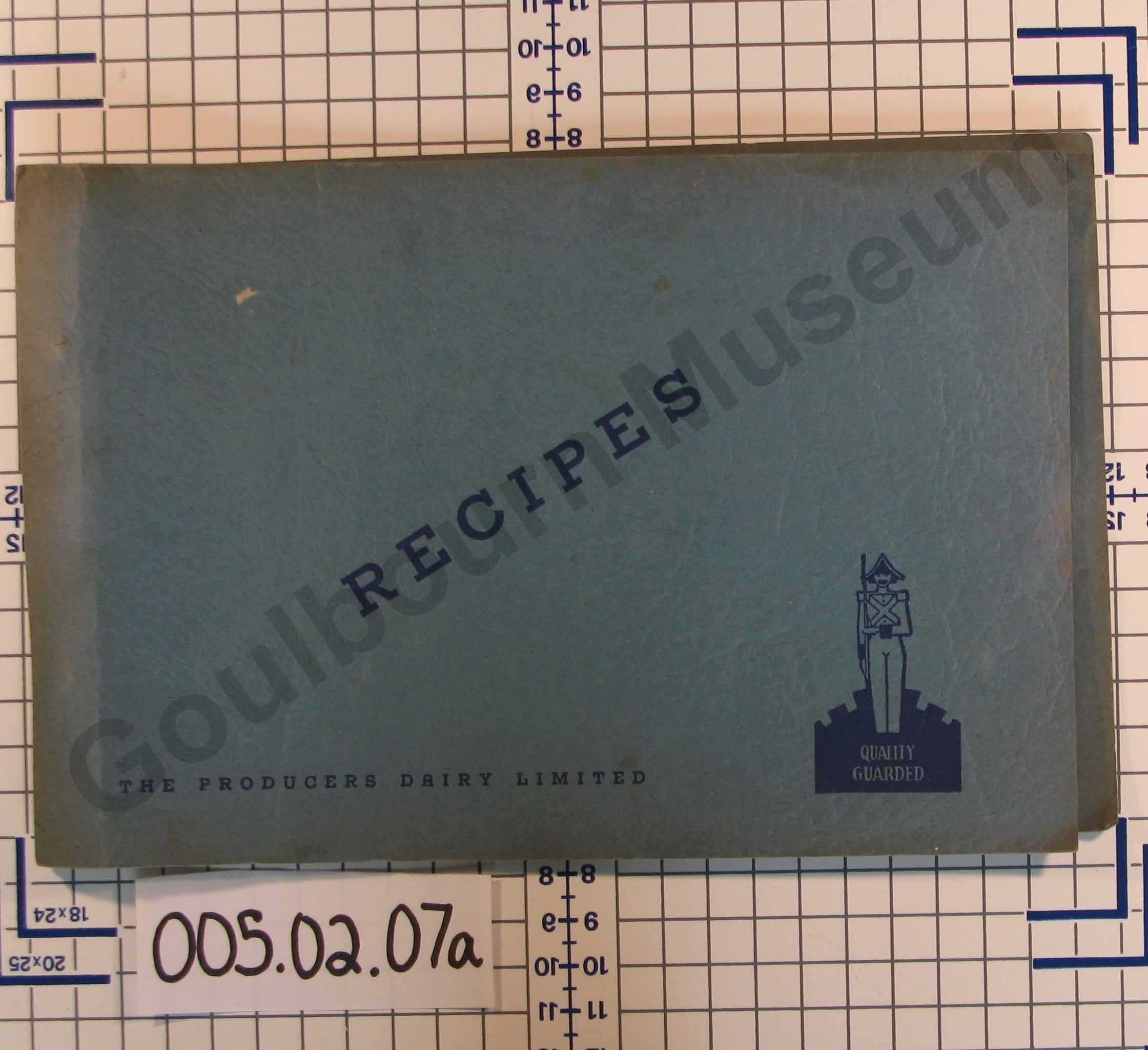Rectangular recipe book made from blue paper. The title, "Recipes," is written diagonally on the front cover in capital letters. Produced by The Producers Dairy Limited. A logo consisting of a soldier and the phrase "Quality Guarded," appears in the bottom right corner. Contains 12 sheets.Collection