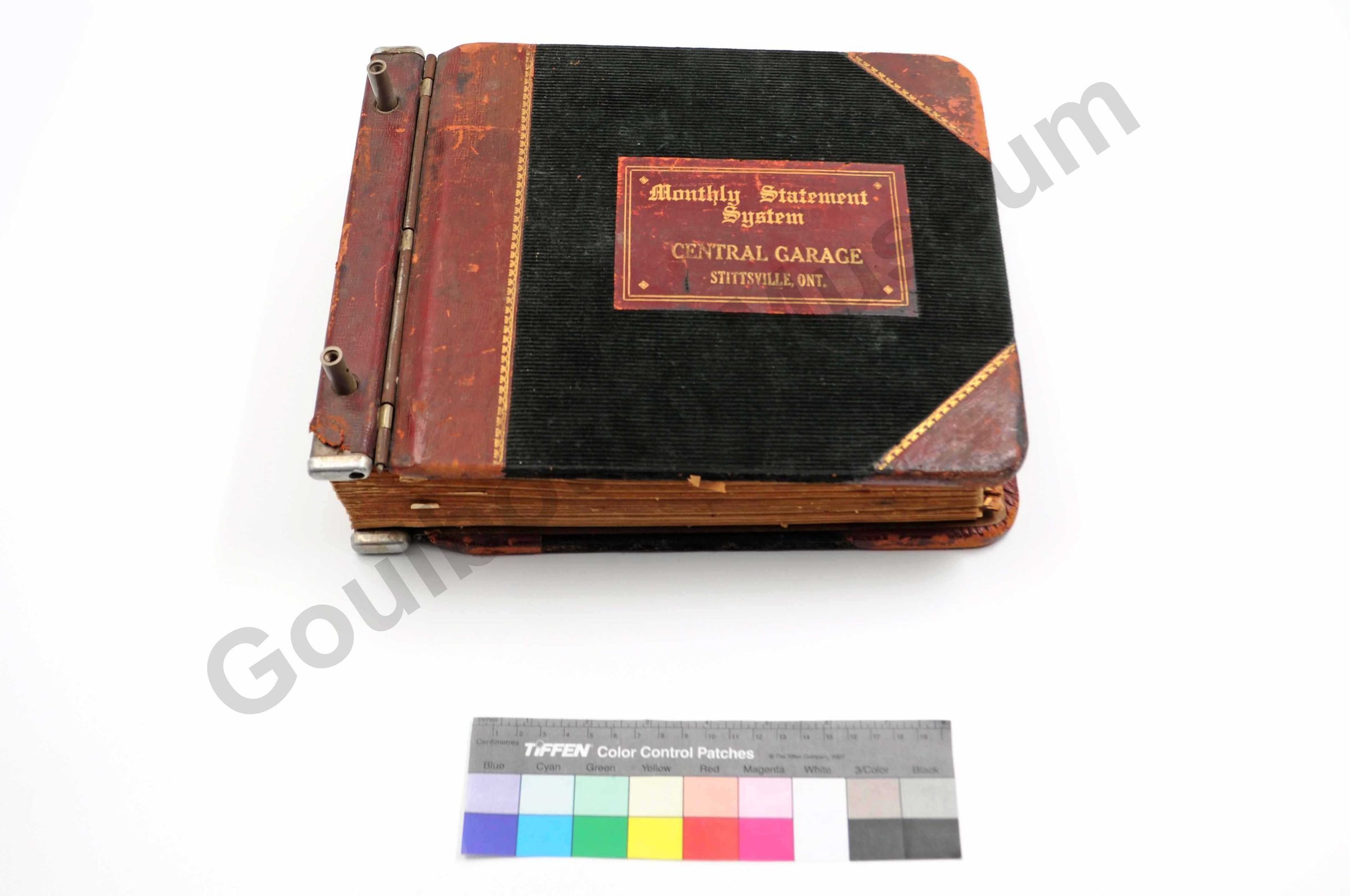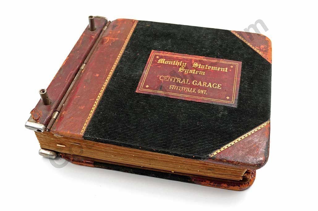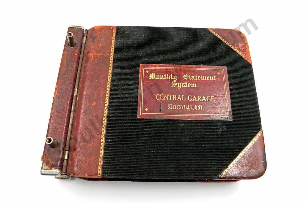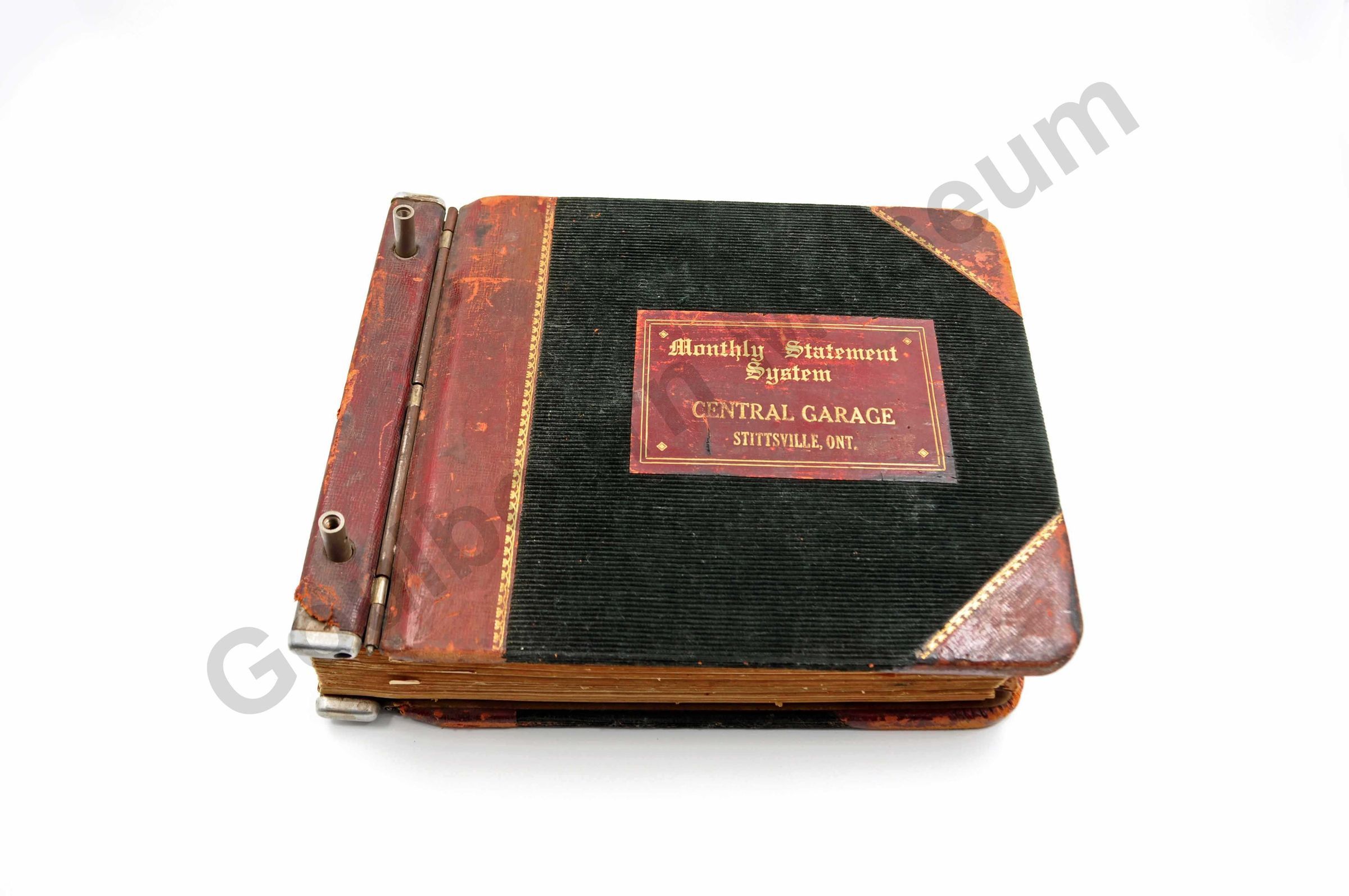 One statement book, expandable binder, dark green cordoroy, with red leather at side, behind text and around corners. "Monthly Statement System/ Central Garage/ Stittsville Ont," written in gold. Inside there are alphabetical dividers A through Z, no writing is on these pages, except for at the back, under the "bills" section. Here they are some dates written. On the individual stubs, it states that JA Vaughan is the manager, the telephone is Hazeldean 13R44, PO Box 49 Stittsville. Book printed by RJ Lovell's Co. Toronto. The oldest company in Canada still operated by the descendants of its founder (found on company website, June 2010).Collection