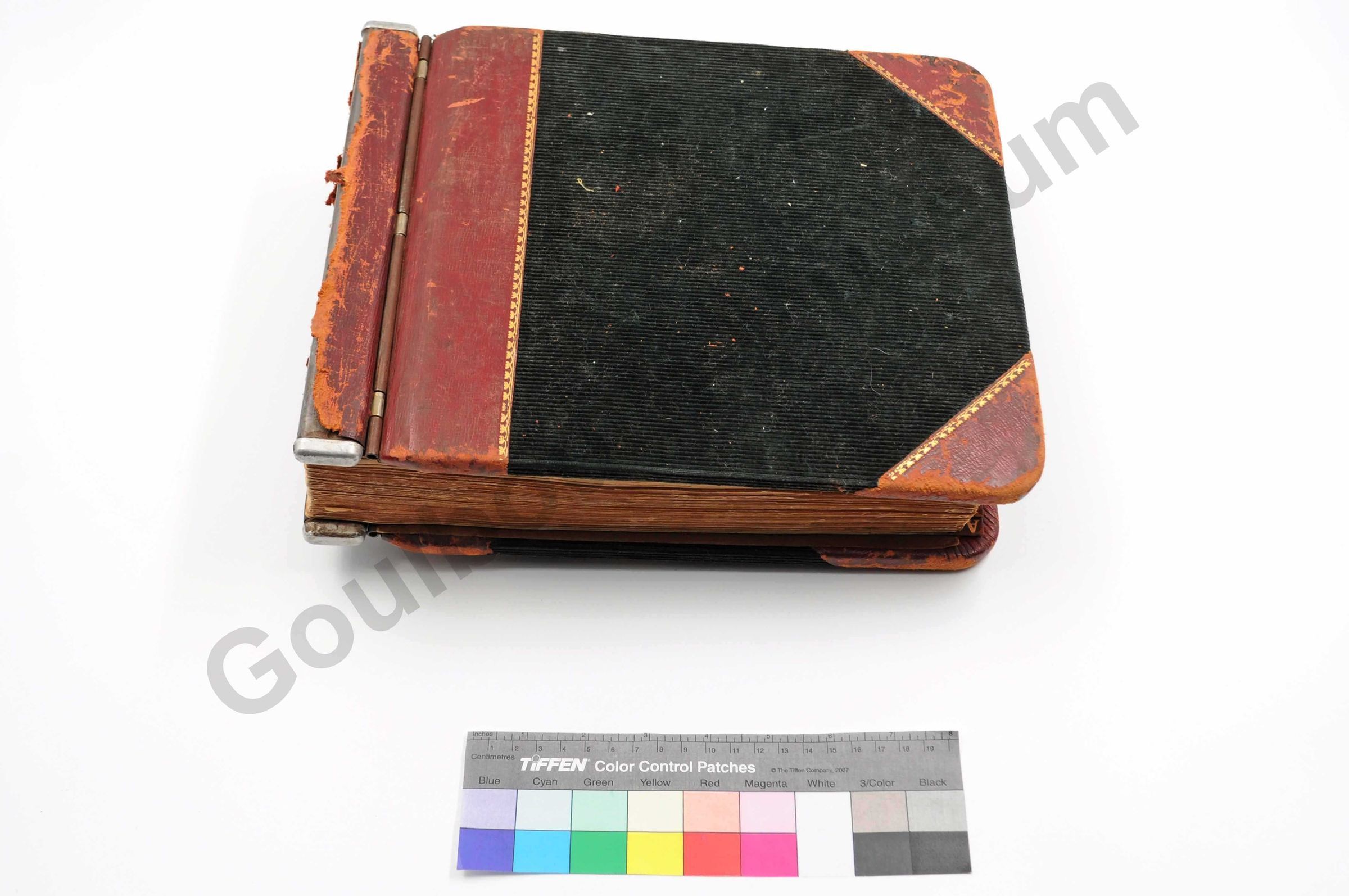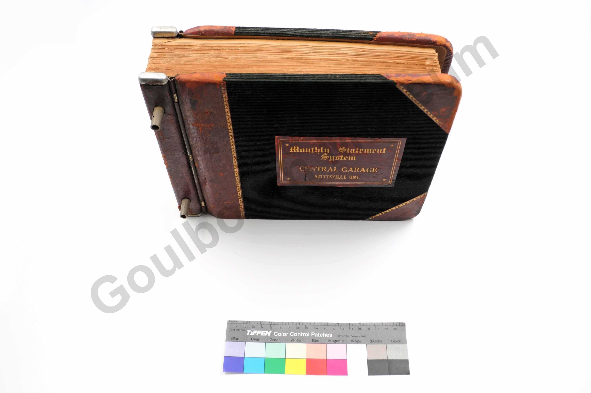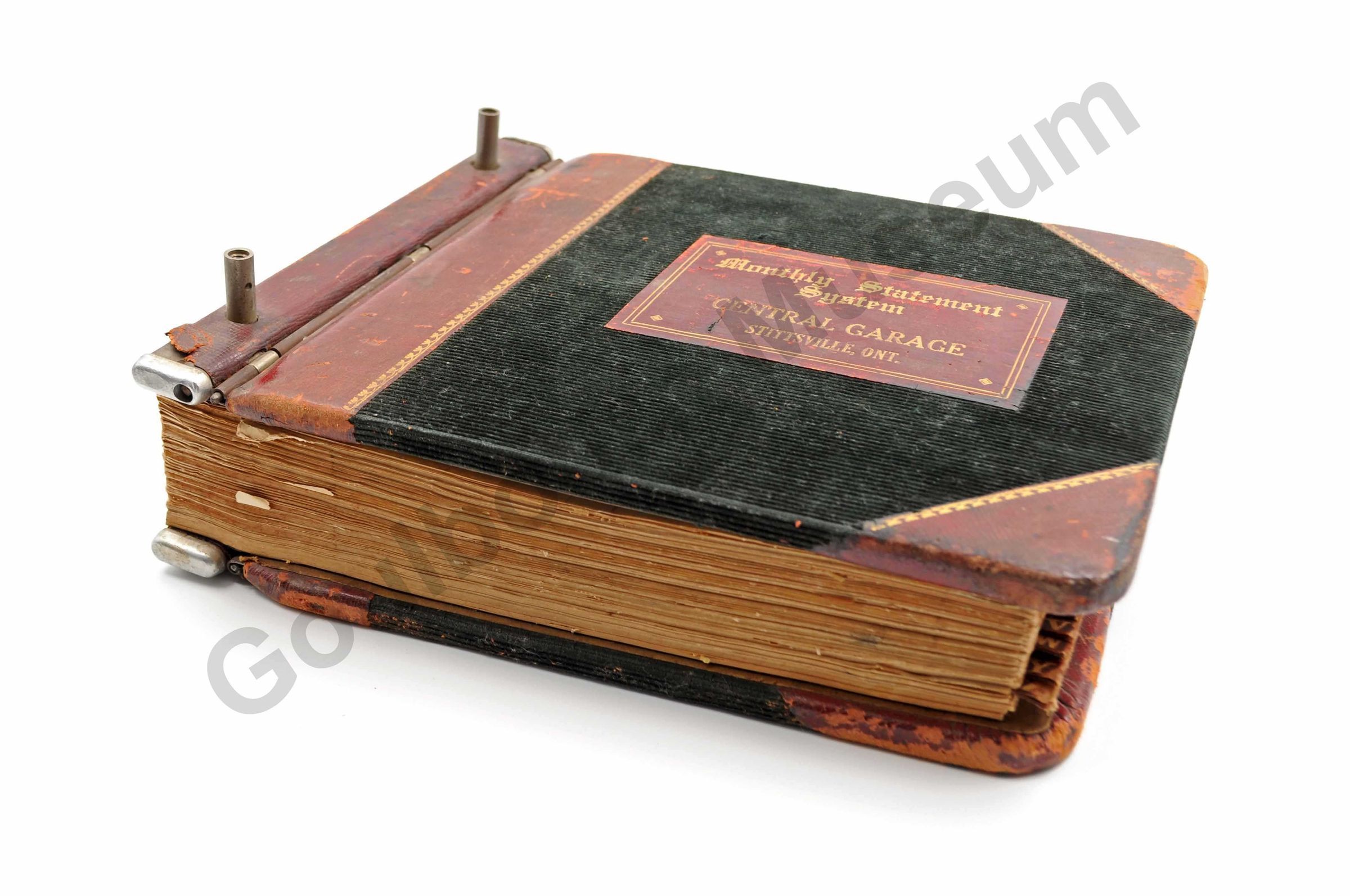 One statement book, expandable binder, dark green cordoroy, with red leather at side, behind text and around corners. "Monthly Statement System/ Central Garage/ Stittsville Ont," written in gold. Inside there are alphabetical dividers A through Z, no writing is on these pages, except for at the back, under the "bills" section. Here they are some dates written. On the individual stubs, it states that JA Vaughan is the manager, the telephone is Hazeldean 13R44, PO Box 49 Stittsville. Book printed by RJ Lovell's Co. Toronto. The oldest company in Canada still operated by the descendants of its founder (found on company website, June 2010).Collection