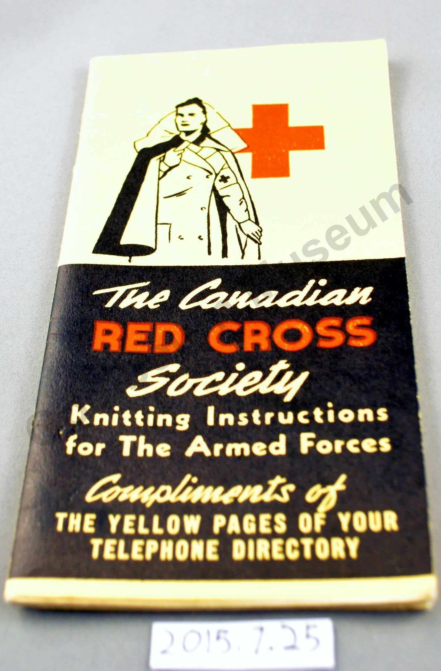 Paper book bound with staples. The cover is yellow, with a black band running along the bottom edge of the book. The cover depicts a woman in nurse's clothing behind a red cross. The text is in a mix of yellow and red, reading "The Canadian Red Cross Society. Knitting Instructions for The Armed Forces. Compliments of the Yellow Pages of your Telephone Directory". The book details several methods to sew and mend clothes, written in a format for deployed forces.Lexicon